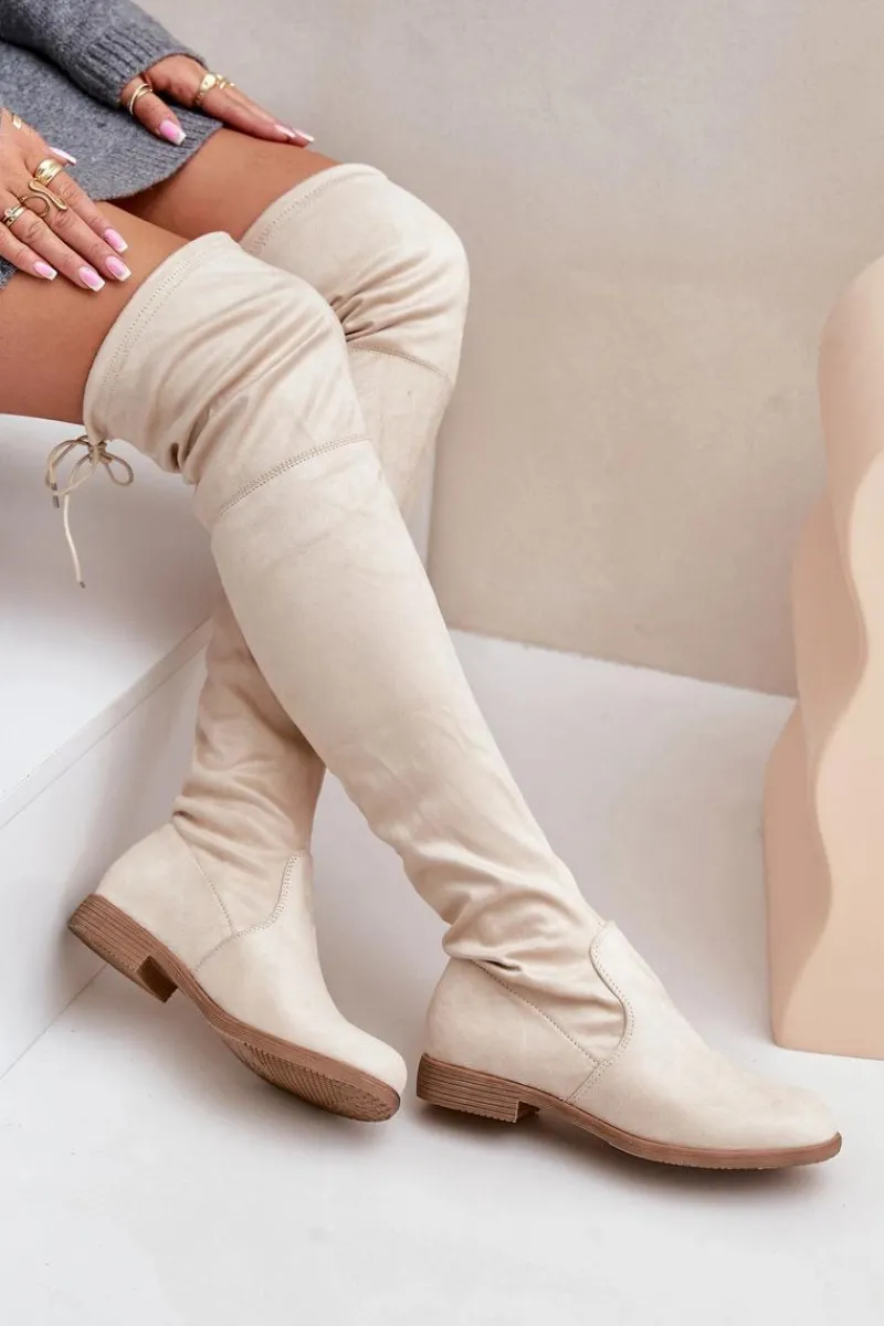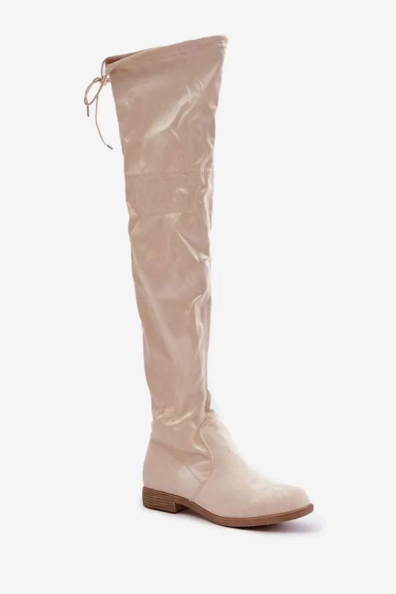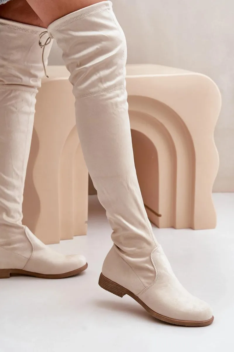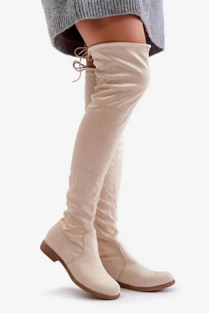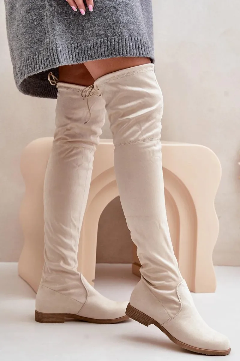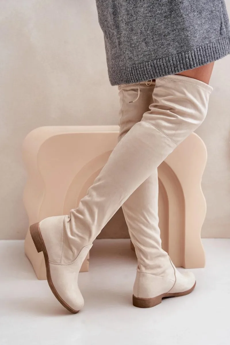 Damskie kozaki z cholewką sięgającą za kolano, wykonane z ekologicznego zamszu. Osadzone na płaskim, stabilnym obcasie z zaokrąglonymi noskami i usztywnionym zapiętkiem. Model wsuwany z regulowaną górą cholewki. Doskonale komponują się z sukienkami i spódnicami. Przy wyborze rozmiaru prosimy kierować tabelą rozmiarów.