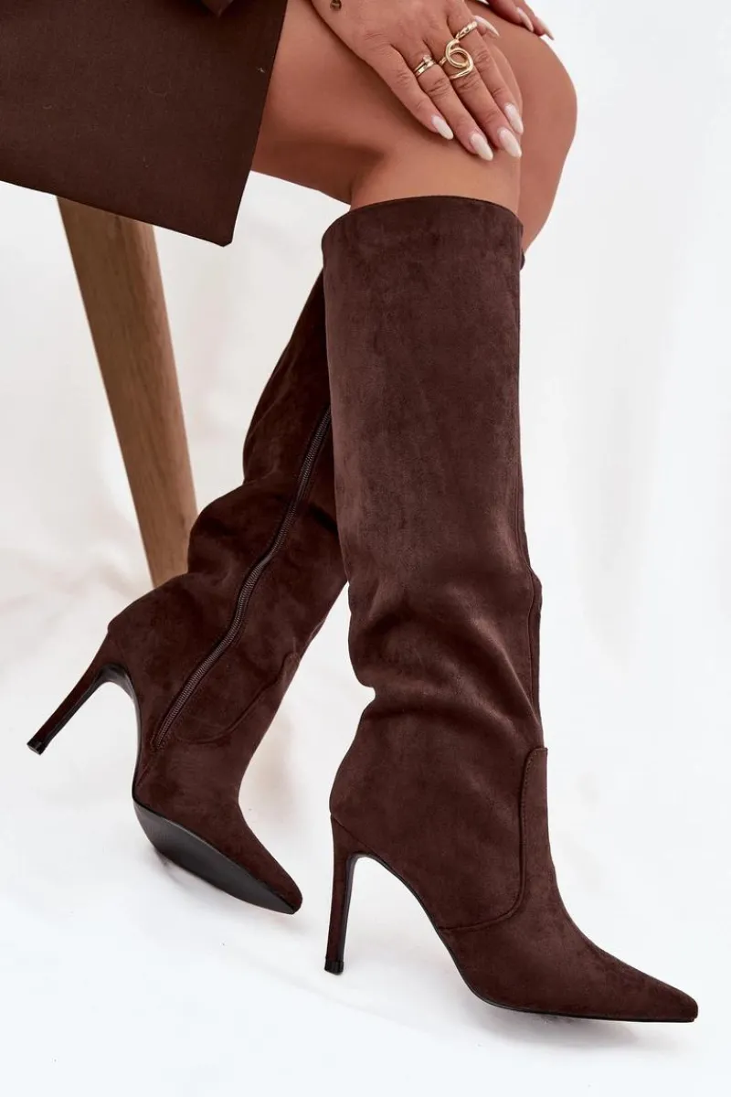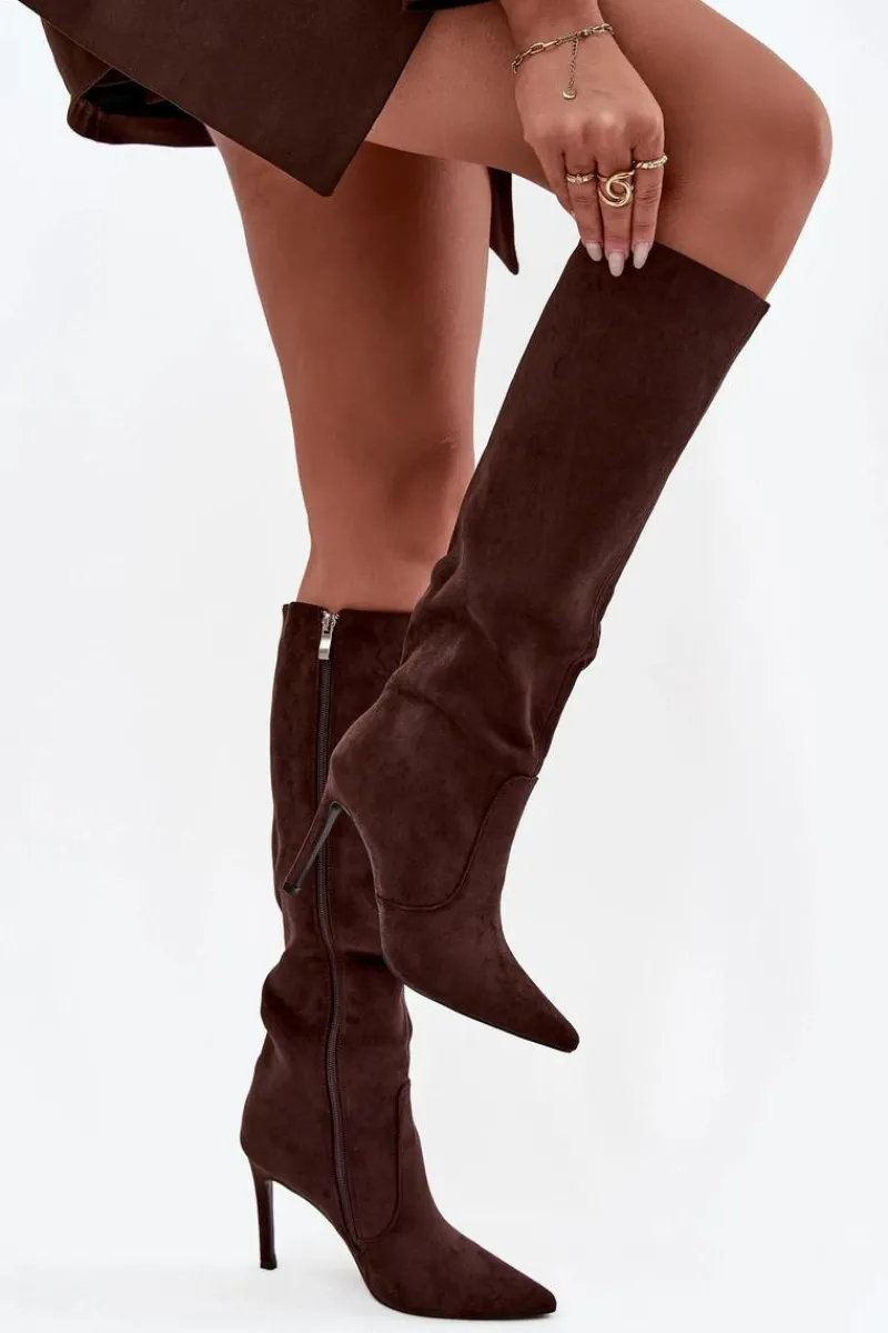 Kozaki damskie wykonane z miękkiego eko zamszu to niezwykle modna propozycja tego sezonu. Model zachwyca eleganckim fasonem i kobiecym charakterem. Osadzone na smukłej szpilce, pięknie podkreślają sylwetkę. Buty posiadają szpiczaste noski, które optycznie wysmuklają nogi, oraz zamek z boku, ułatwiający zakładanie. Ocieplane wnętrze gwarantuje komfort i ciepło w chłodniejsze dni. To idealny model dla kobiet, które lubią wyróżniać się elegancją – doskonałe zarówno na wieczorne wyjścia, jak i do modnych stylizacji w ciągu dnia. Przy wyborze rozmiaru prosimy sugerować się tabelą rozmiarów.