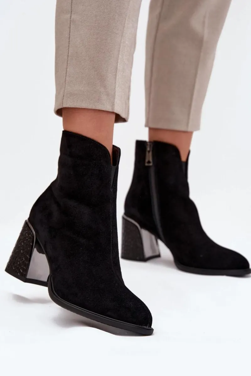 Botki damskie Vinceza wykonane z naturalnego zamszu to połączenie elegancji i nowoczesnego stylu. Osadzone na obcasie typu słupek, który wyróżnia się subtelnym tłoczeniem i lustrzanym elementem. Noski w kształcie migdała podkreślają kobiecy wygląd, a zamek ułatwia szybkie zakładanie. Ocieplane wnętrze zapewnia komfort i ciepło w chłodniejsze dni, co czyni je idealnym wyborem na jesień i zimę. Przy wyborze rozmiaru prosimy sugerować się tabelą rozmiarów.