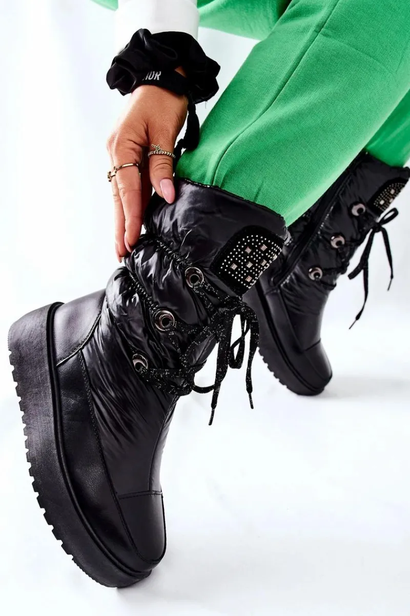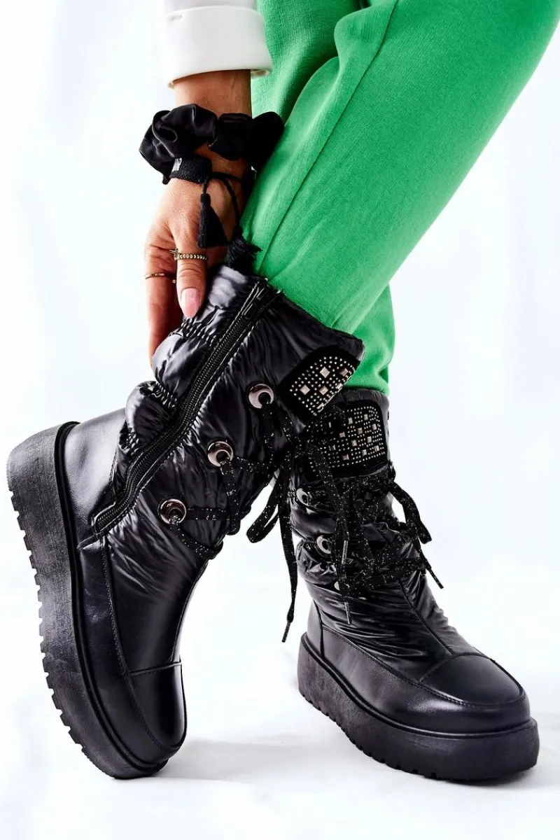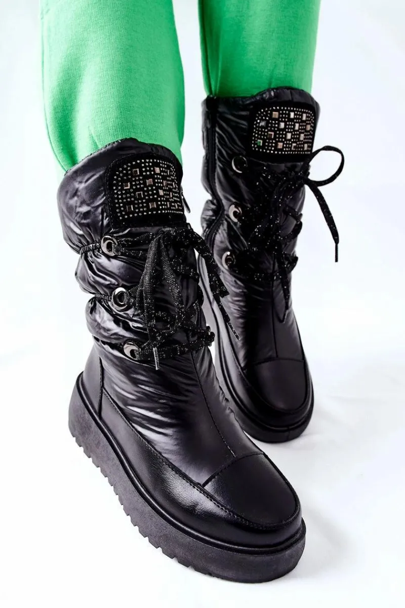 Buty wewnątrz są niesamowicie miłe w dotyku dzięki zastosowaniu ocieplenia w postaci kożuszka. Zewnętrzna część buta została wykonana z materiału tekstylnego. Buty klasycznie sznurowane oraz zapinane na zamek Zdobione kamyczkami na cholewce. W tych śniegowcach żadna pogoda nie będzie Ci straszna! Przy wyborze rozmiaru prosimy kierować tabelą rozmiarów.