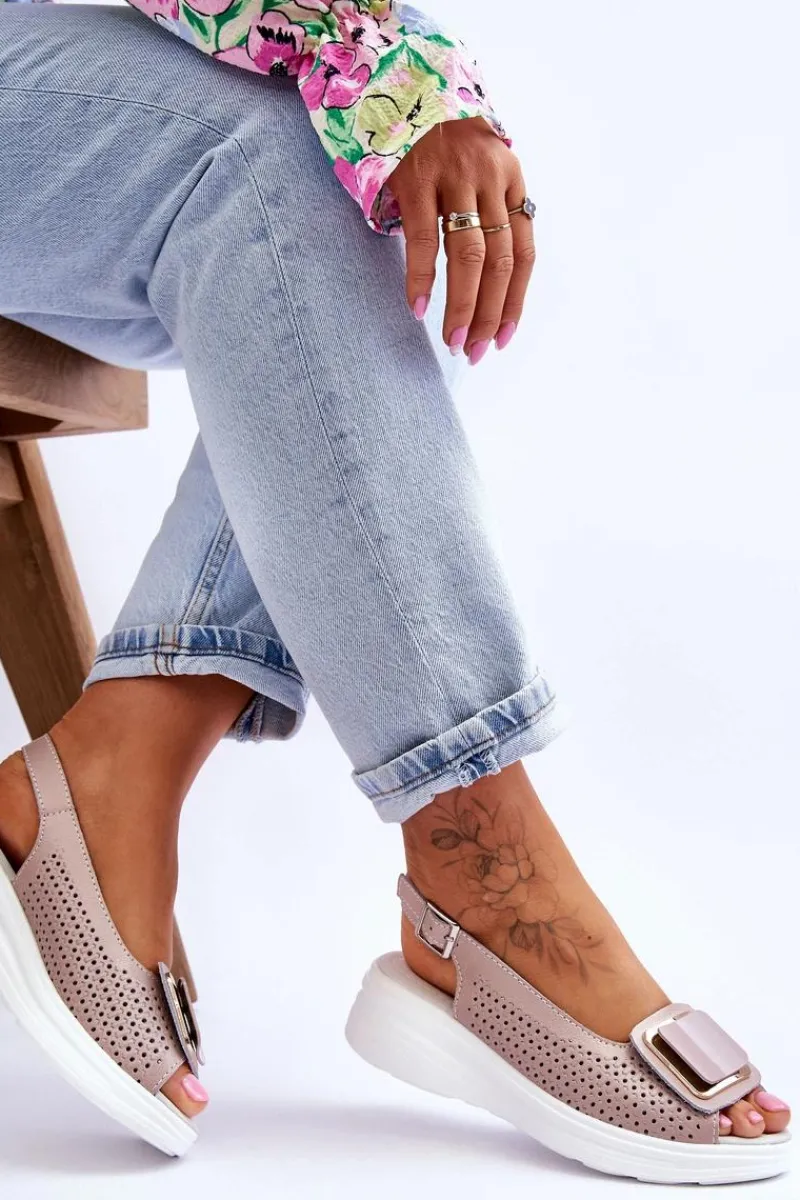 Niezwykle wygodne sandały damskie zostały wykonane z wysokiej jakości naturalnej skóry. Model ten posiada zapinanie na regulowany pasek ze sprzączką. Sandałki są przewiewne, dzięki ażurowemu wzorkowi. Miękka wkładka z naturalnej skóry zapewni komfortowe użytkowanie. Sandałki osadzono na koturnie i platformie. Na przodzie znajduje się ozdobny element z tworzywa. Przy wyborze rozmiaru prosimy sugerować się tabelą rozmiarów.