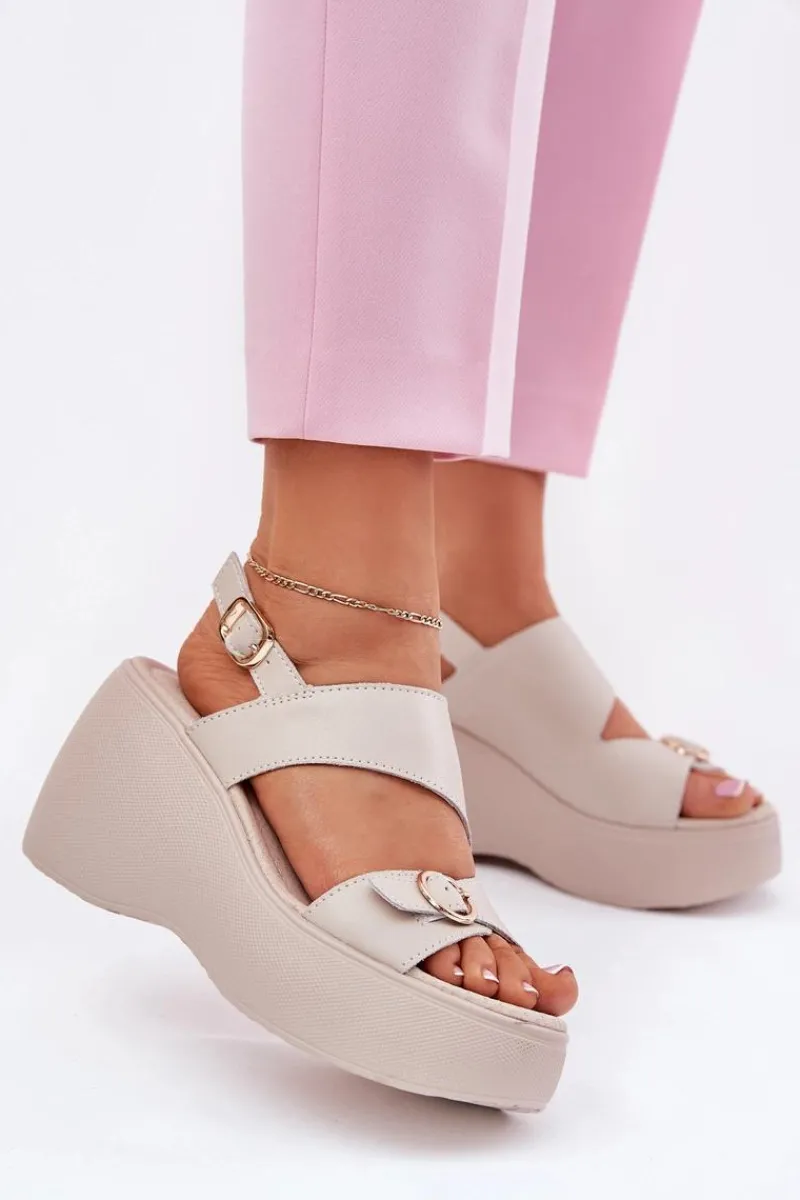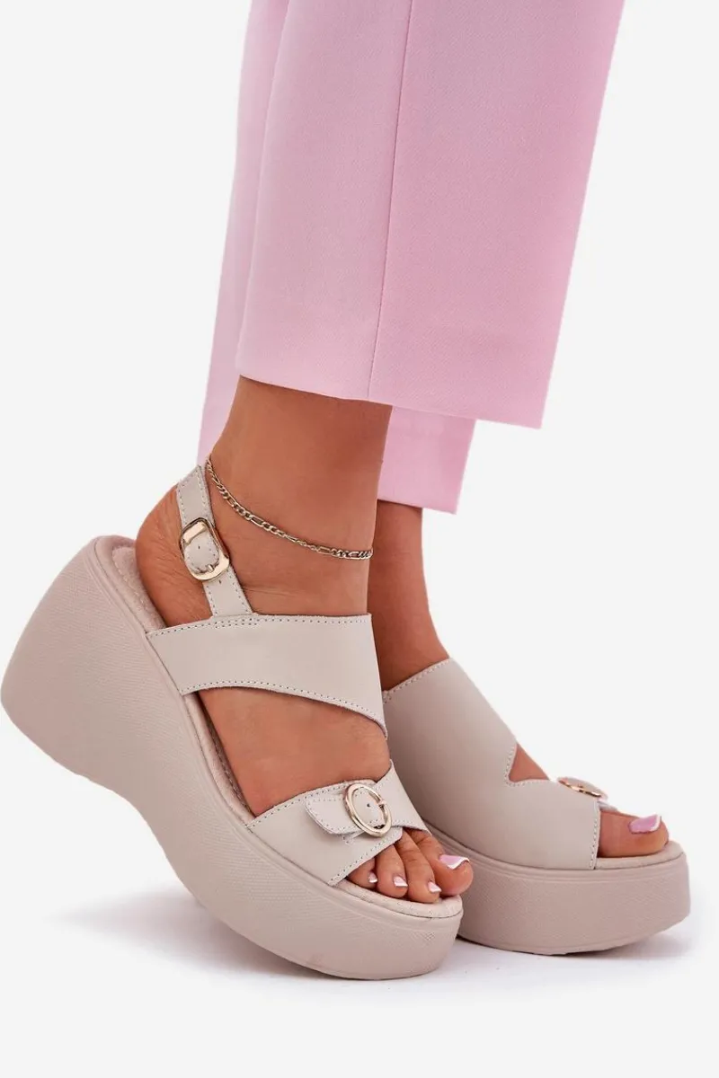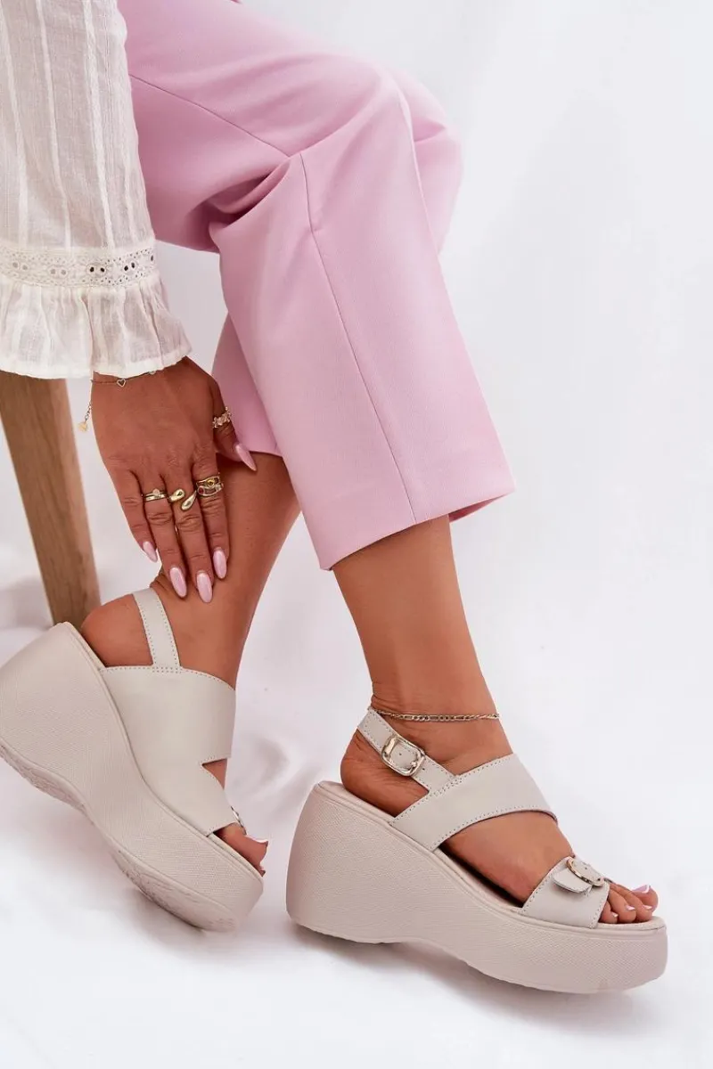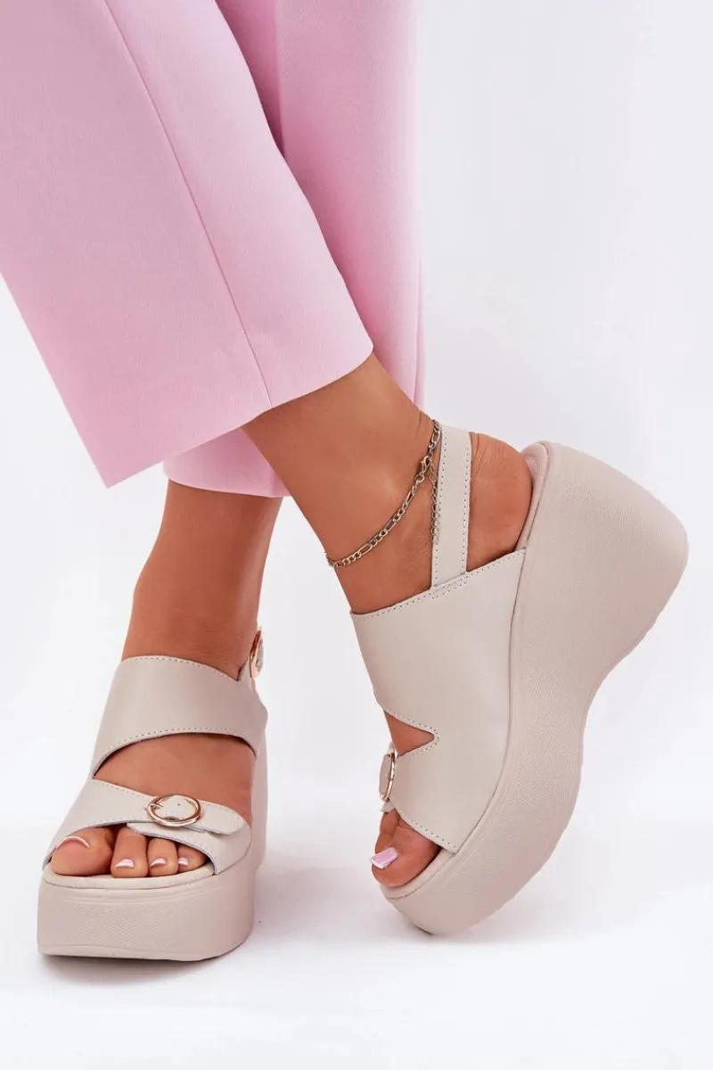 Damskie sandały wykonane z naturalnej skóry to elegancka propozycja na letnie dni. Osadzone na platformie i koturnie, zapewniają stabilność i wygodę przez cały dzień. Regulowany paseczek z klamrą z przodu umożliwia idealne dopasowanie do stopy, a miękka skórzana wkładka gwarantuje komfort. Te sandały łączą elegancję z funkcjonalnością, stanowiąc doskonały wybór do stylowych letnich stylizacji. Przy wyborze rozmiaru prosimy kierować się tabelą rozmiarów.
