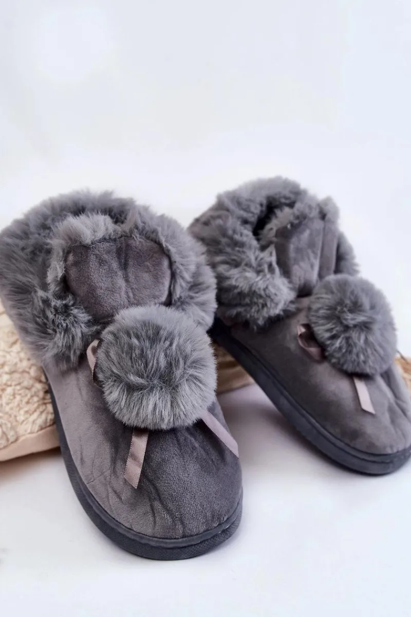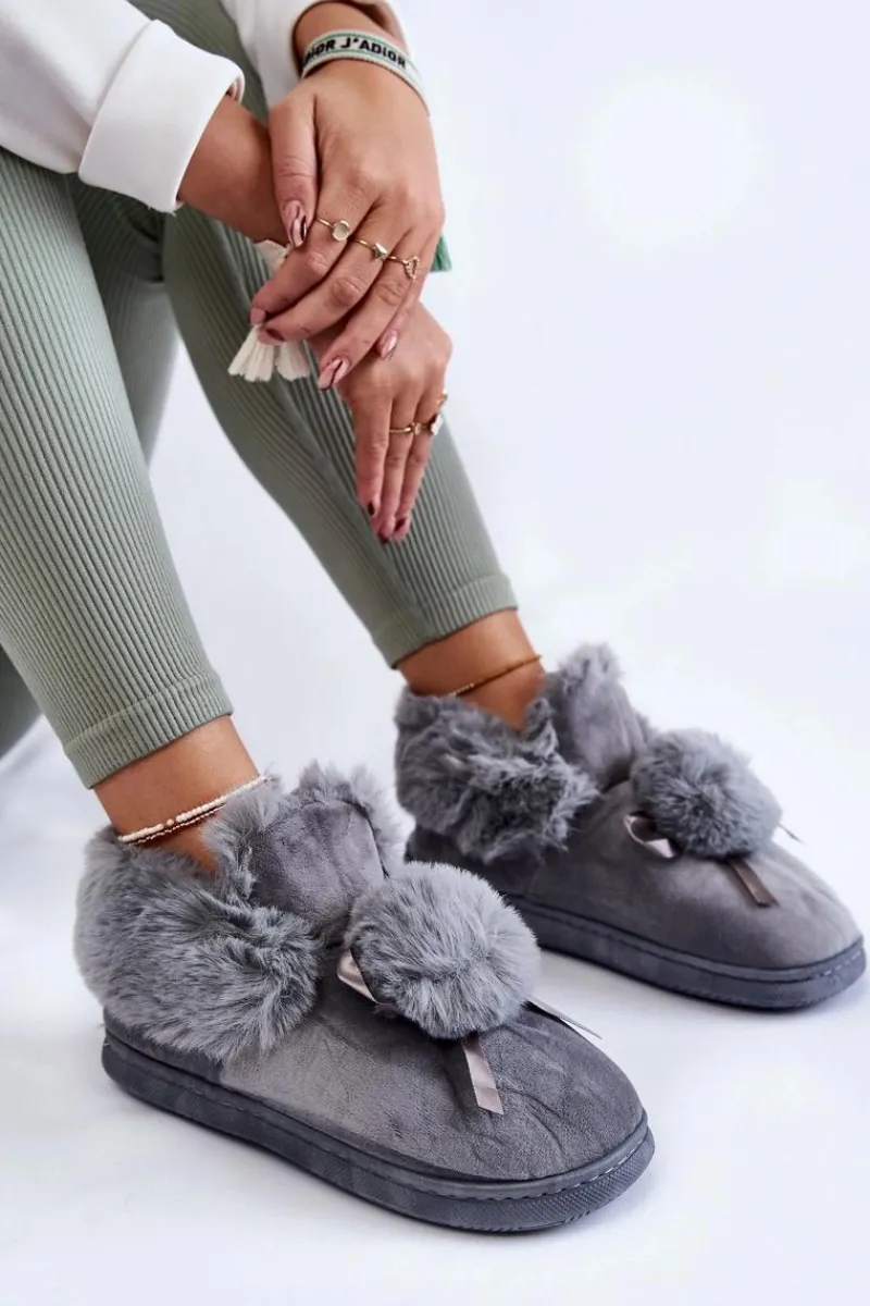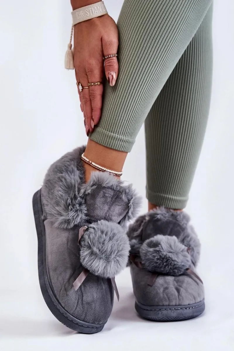 Wsuwane papcie damskie zostały wykonane z miłej w dotyku tkaniny. Model ten posiada na śródstopiu futrzany pompon z kokardką. Dodatkowo papcie zostały ocieplone wewnątrz eko futerkiem. Model osadzony na płaskiej, gumowej podeszwie. Idealne do domowego zacisza w jesienno-zimowe dni. Przy wyborze rozmiaru prosimy kierować się tabelą rozmiarów.