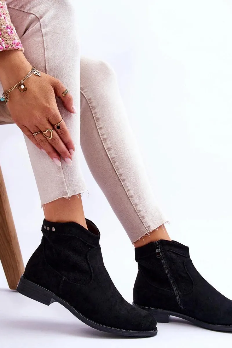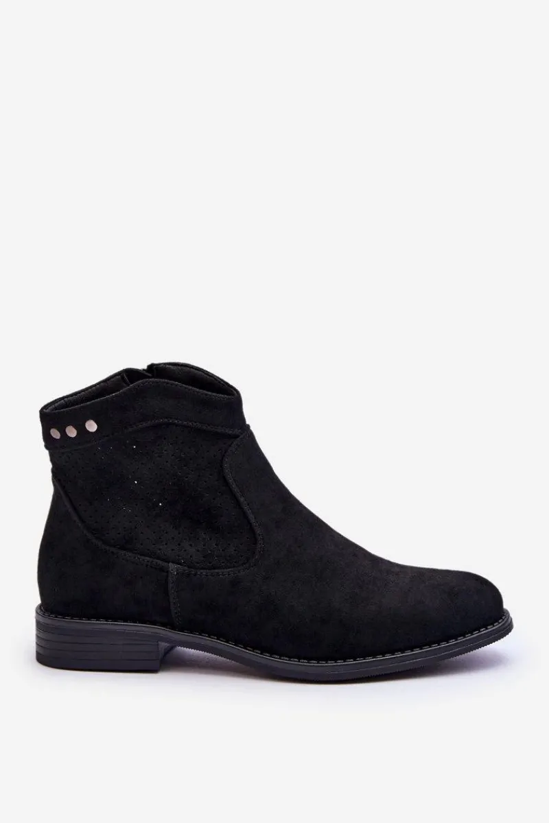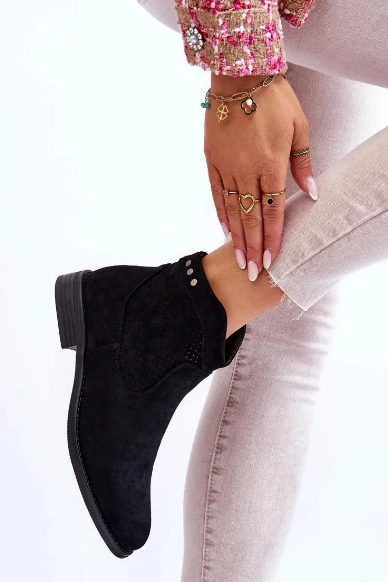 Klasyczne botki wykonane z miłego w dotyku eko zamszu z ażurową cholewką. Posiadają ozdobne elementy w postaci ćwieków. Osadzone na płaskim obcasie. Dodatkowo botki posiadają usztywniany zapiętek. Z boku cholewki znajduje się suwak ułatwiający zakładanie obuwia. Koniecznie sprawdź także pozostałe modele botków dostępnych w naszej ofercie! Przy wyborze rozmiaru prosimy sugerować się tabelą rozmiarów.