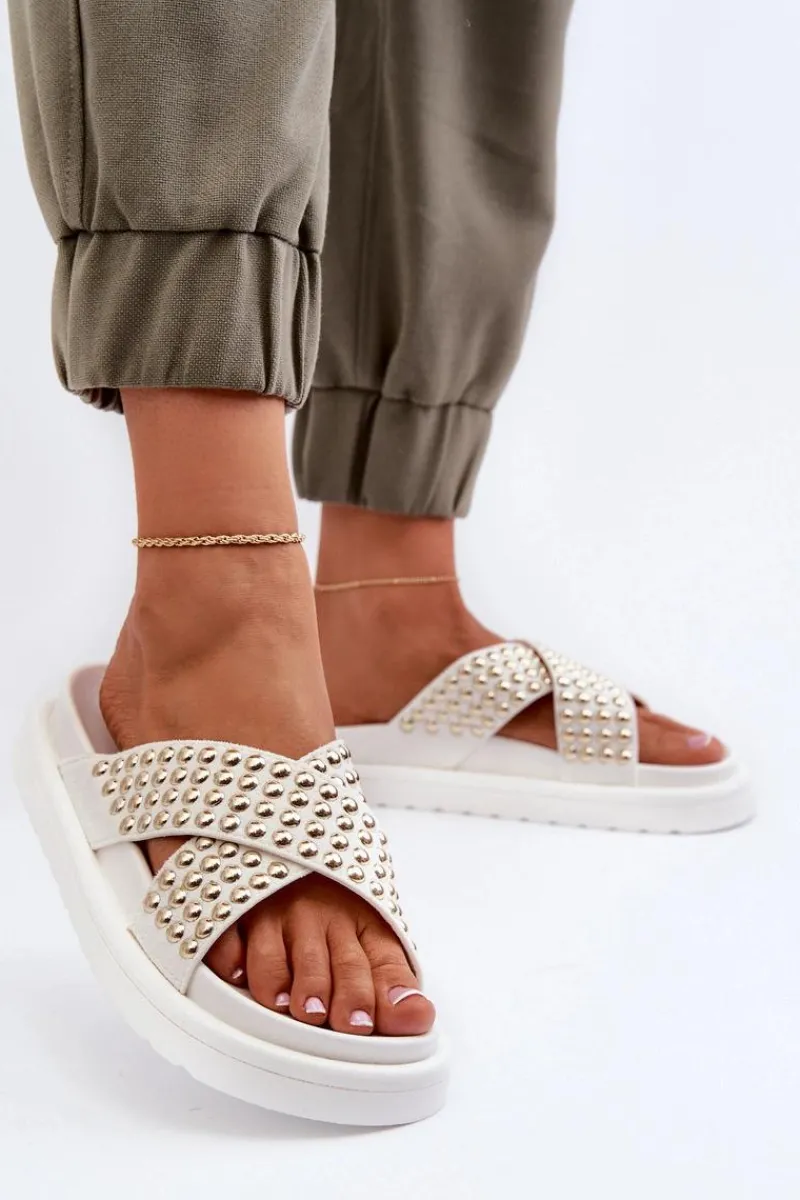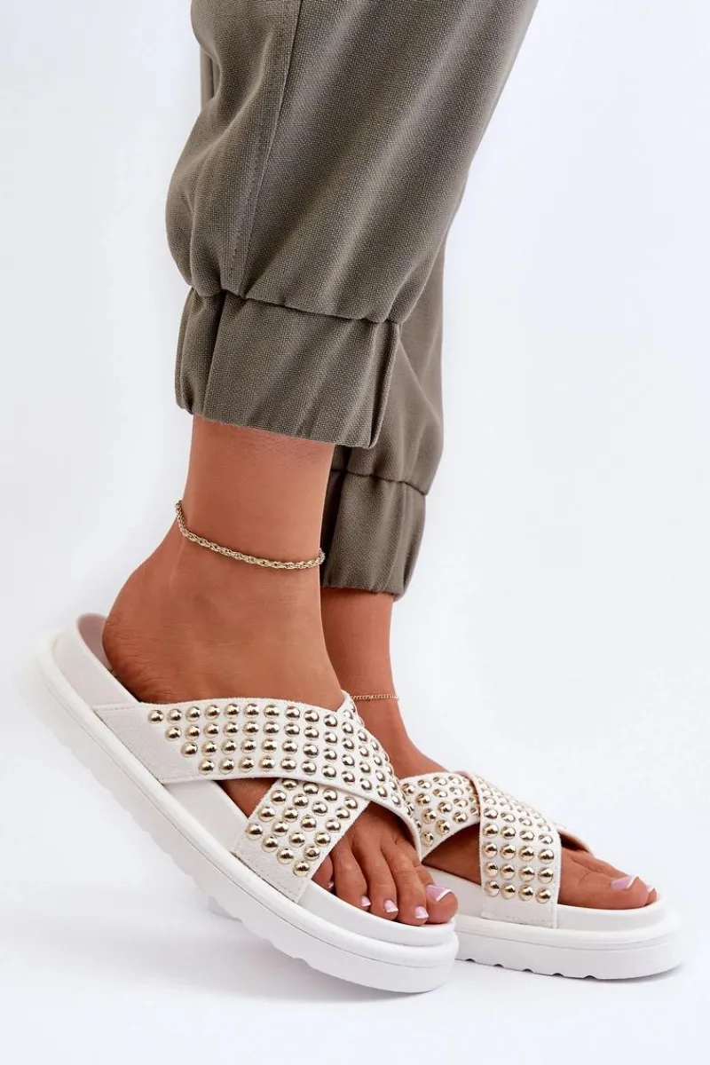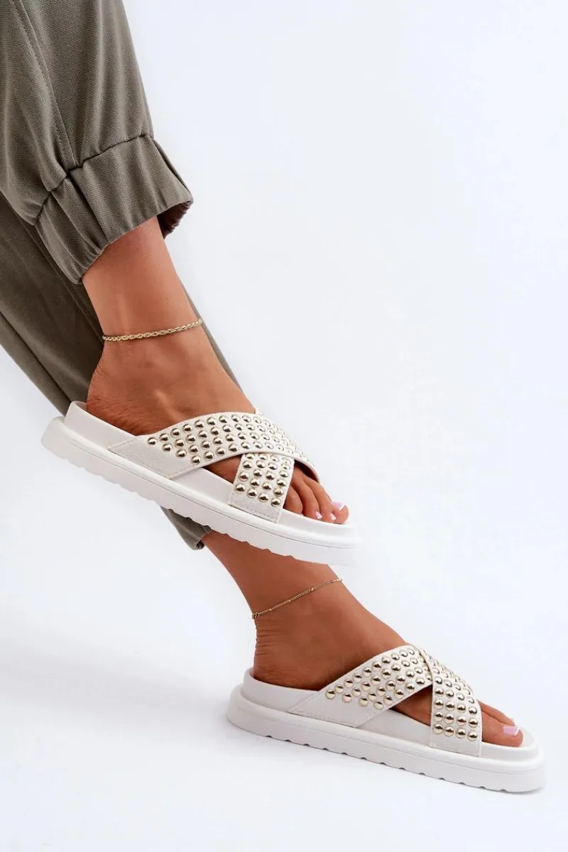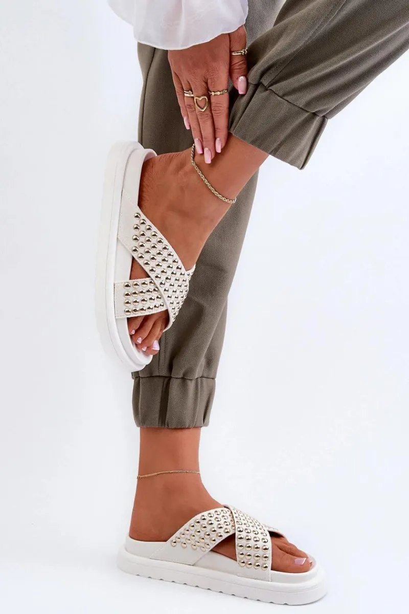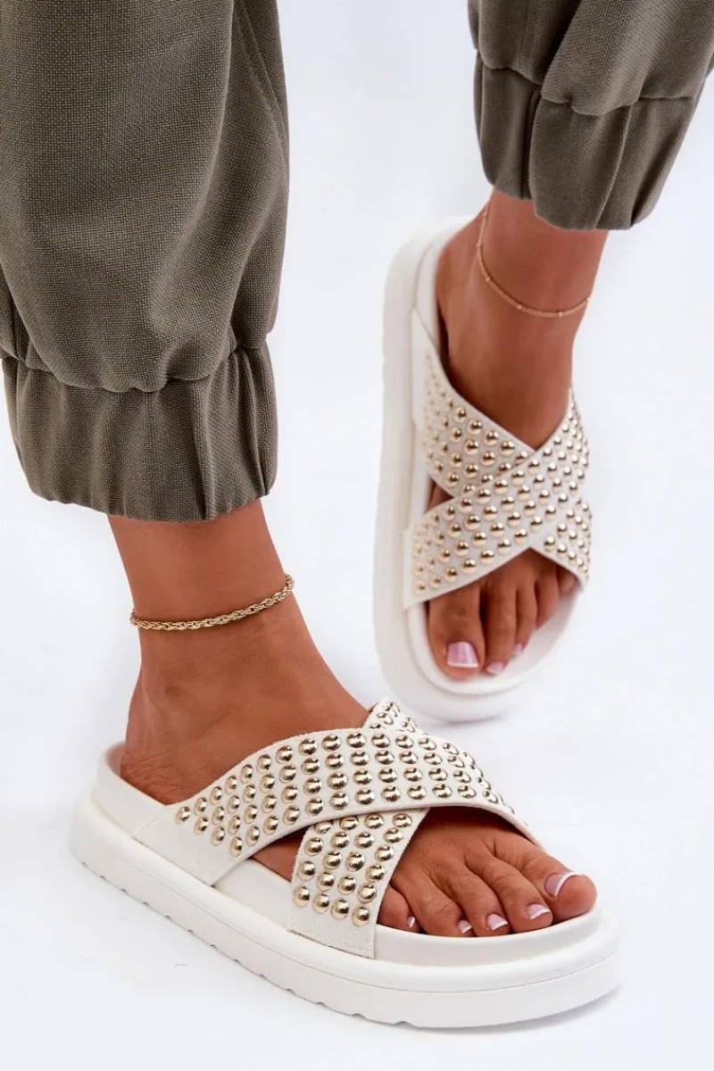 Klasyczne klapki damskie na platformie są idealnym wyborem na lato. Z przodu przeplatające się paski zdobione ćwiekami, co dodaje im nuty stylu i oryginalności. Dzięki platformie zapewniają dodatkową wygodę podczas chodzenia, a ich uniwersalny design sprawia, że doskonale komponują się z letnimi stylizacjami! Przy wyborze rozmiaru prosimy sugerować się tabelą rozmiarów.