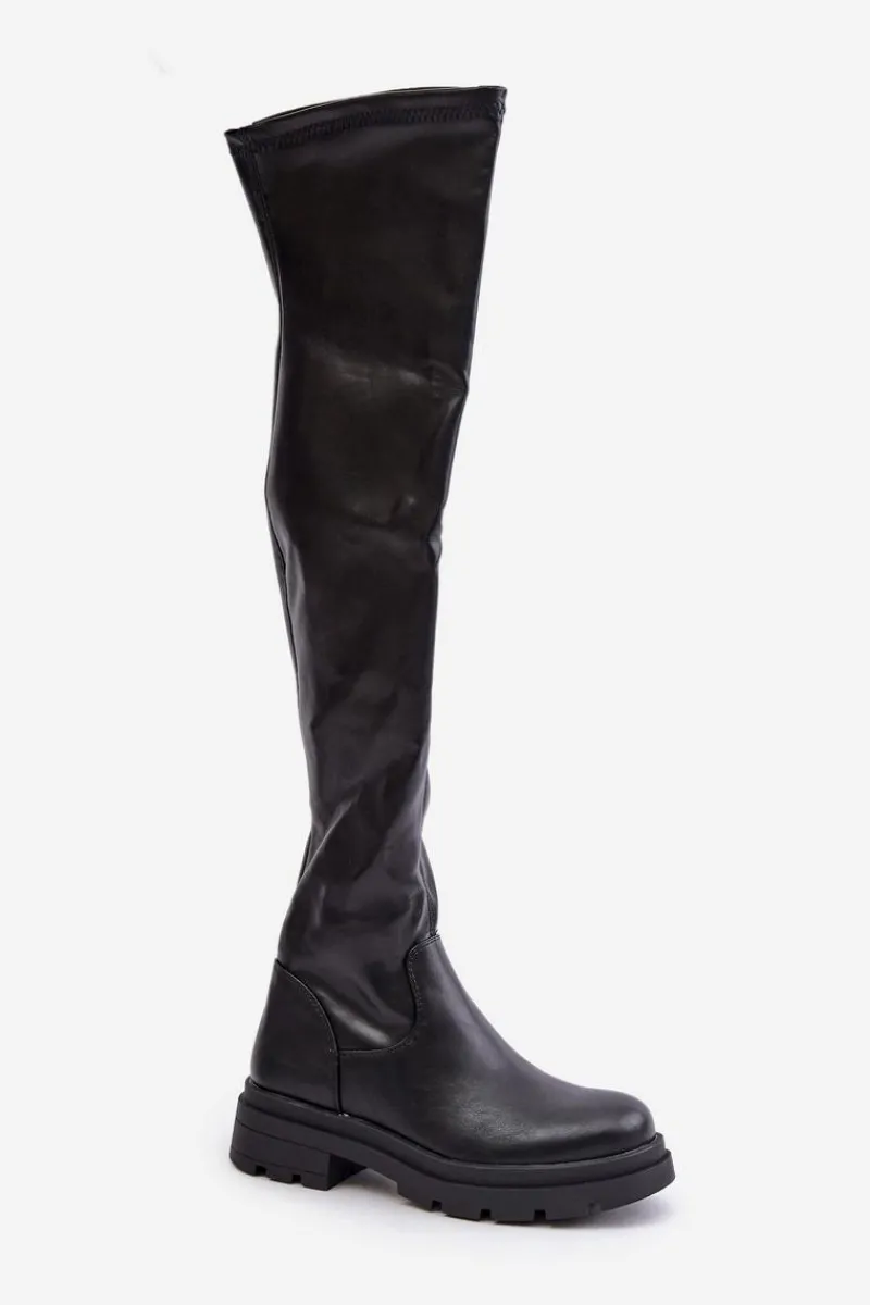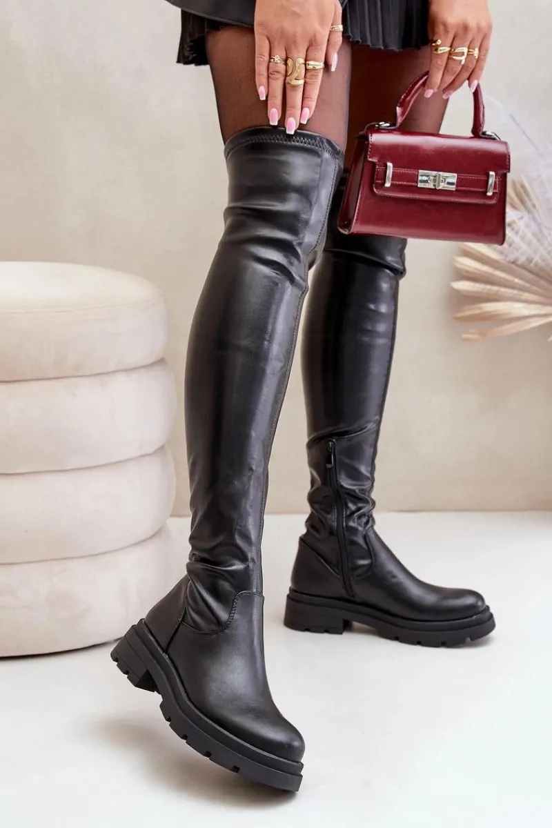 Kozaki za kolano z eko skóry to elegancka opcja na chłodniejsze dni. Osadzone na platformie z płaskim obcasem, gwarantują wygodę noszenia przez cały dzień. Model wsuwany z praktycznym zamkiem na dole ułatwia zakładanie. Ocieplenie kocem obuwniczym na wysokości stopy zapewnia ciepło, a ich stylowy design świetnie pasuje zarówno do sukienek, jak i spódnic, dodając każdej stylizacji modnego akcentu. Przy wyborze rozmiaru prosimy sugerować się tabelą rozmiarów.