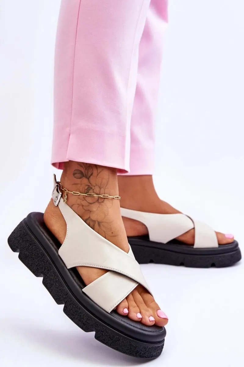 Modne sandały zostały wykonane z wysokiej jakości eko skóry. Posiadają zapinanie wokół kostki na klamrę z regulowanym paskiem. Wkładka została wykonana z miękkiej eko skóry. Sandały posiadają odkryte palce i piętę. Osadzone na masywnej platformie z tworzywa sztucznego. Te sandałki to idealny wybór na upalne dni! Przy wyborze rozmiaru prosimy sugerować się tabelą rozmiarów.