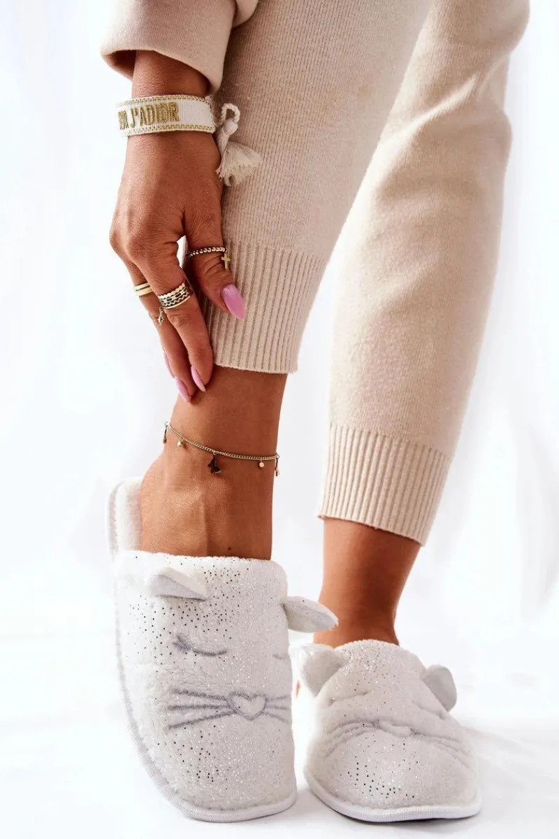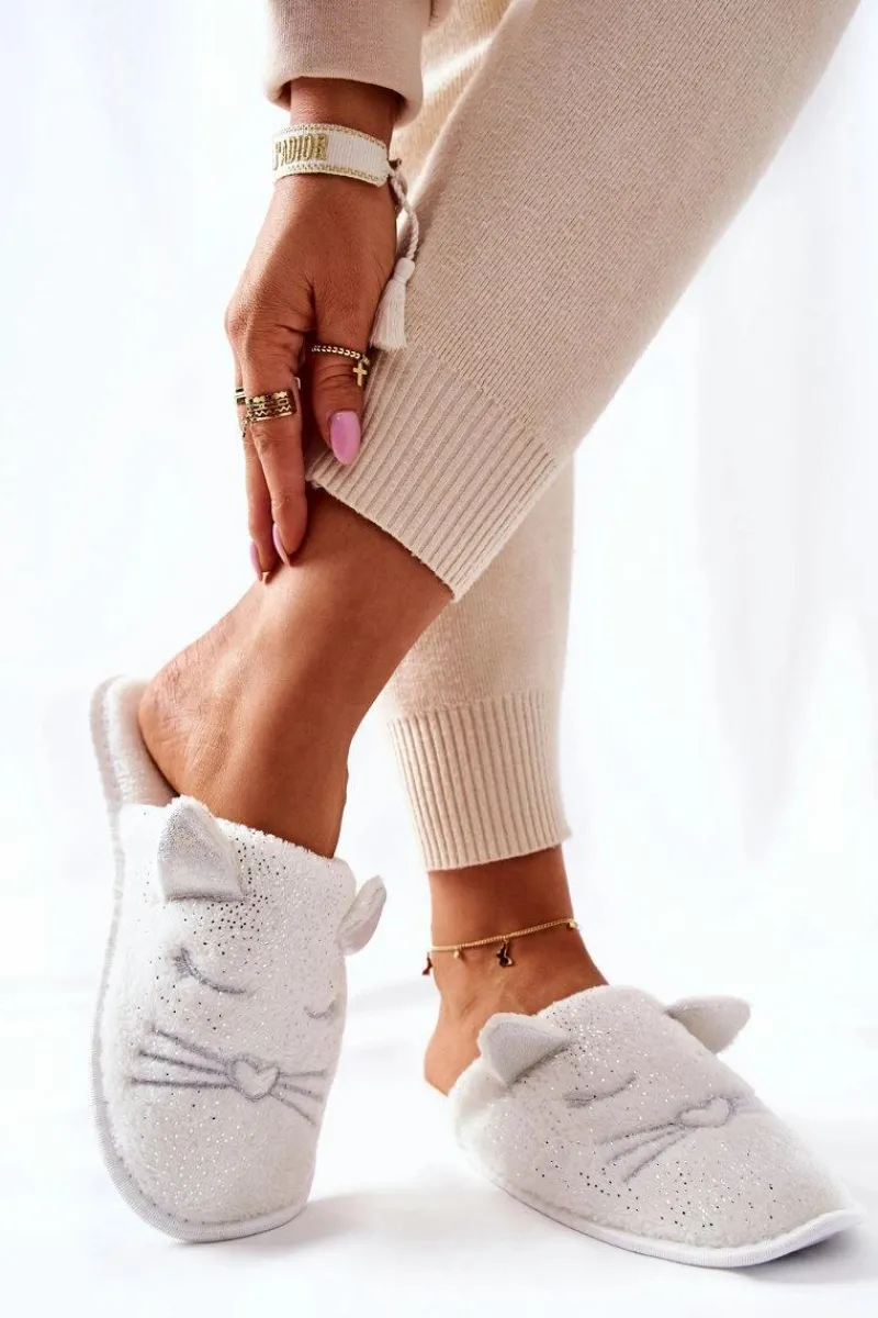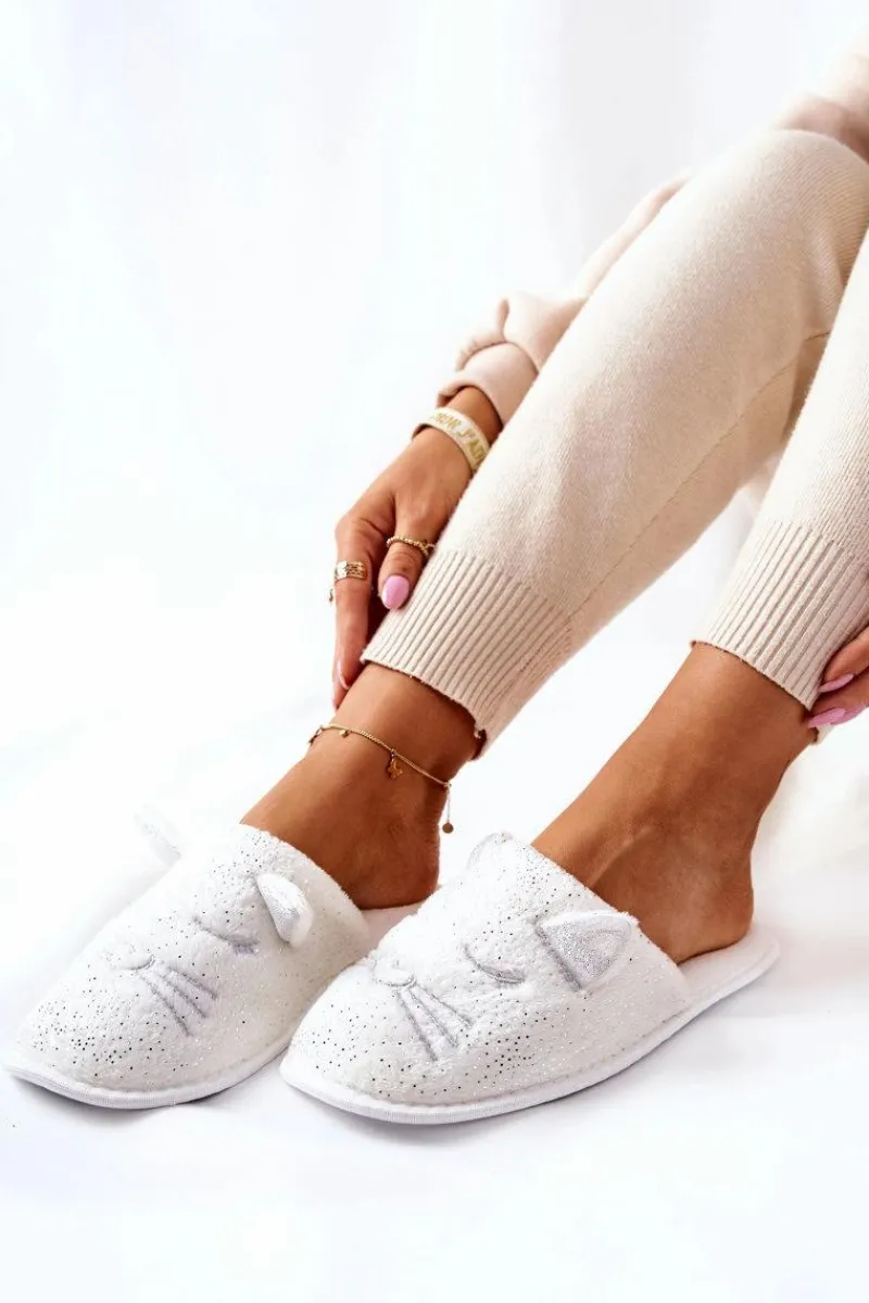 Błyszczące papcie na chłodne dni i wieczory. Wykonane z delikatnego i przyjemnego w dotyku materiału. Na przodzie znajduje się uroczy, wyszyty nosek z wąsami oraz przyszyte uszy. Papcie posiadają ocieplaną wkładkę. Spraw sobie nową parę papci i ciesz się wygodą i ciepłem! Przy wyborze rozmiaru prosimy sugerować się tabelą rozmiarów.