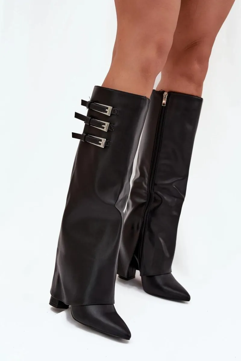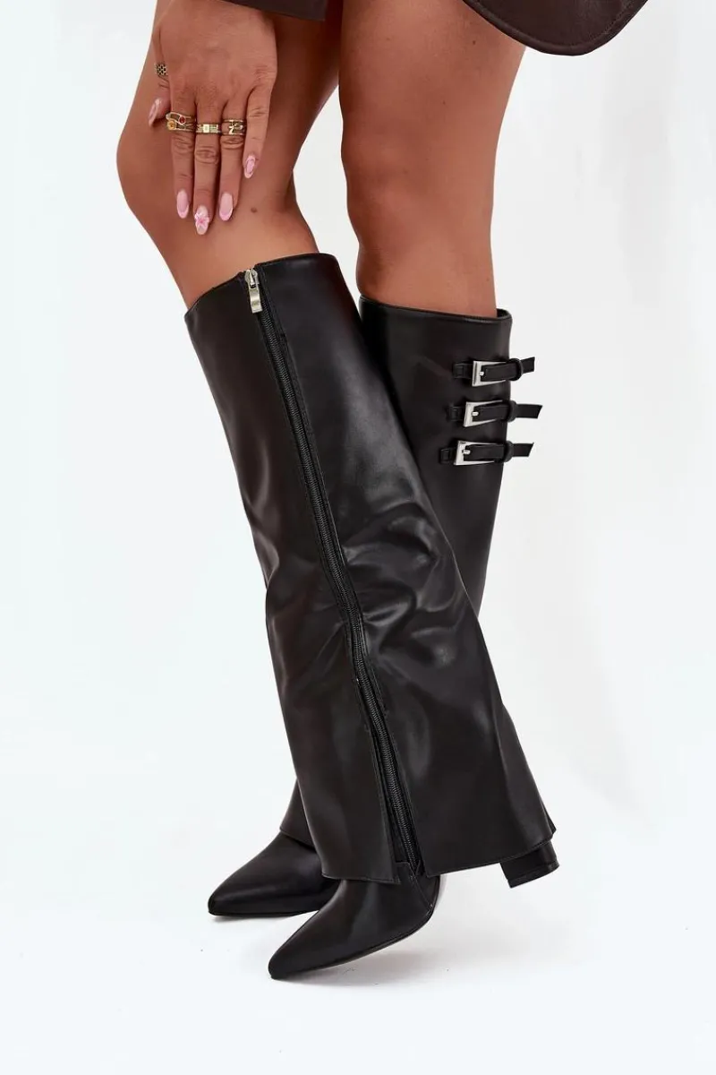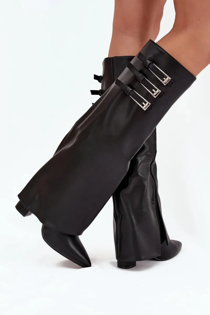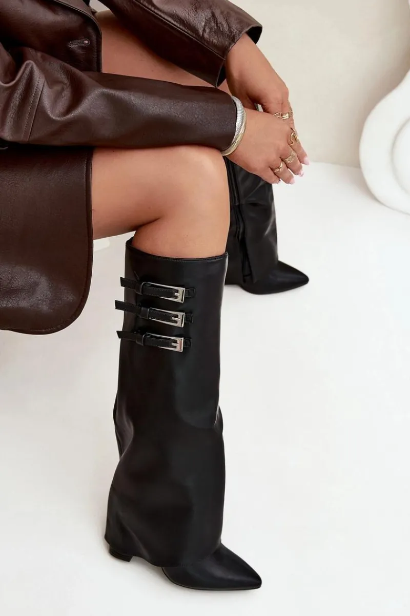 Kozaki damskie z eko skóry o stylowym fasonie z wywiniętą cholewką to połączenie elegancji i nowoczesnego designu. Zapinane na zamek, ze szpiczastymi noskami, optycznie wydłużają nogi. Obcas w formie słupka zapewnia komfort przez cały dzień. Na cholewce znajdują się trzy paseczki ze srebrnymi klamrami, które dodają wyjątkowego charakteru. Ocieplenie kocem obuwniczym gwarantuje ciepło, czyniąc je idealnym wyborem na chłodniejsze dni. Przy wyborze rozmiaru prosimy sugerować się tabelą rozmiarów.