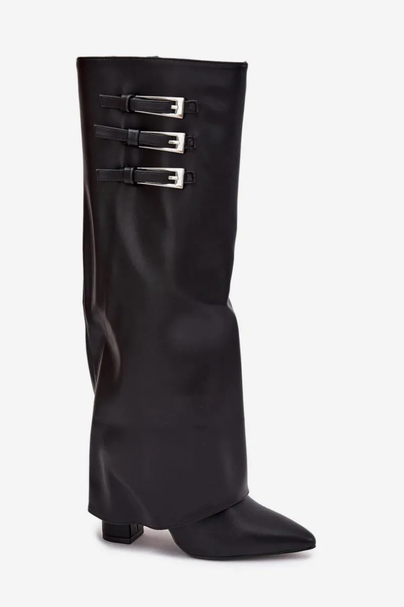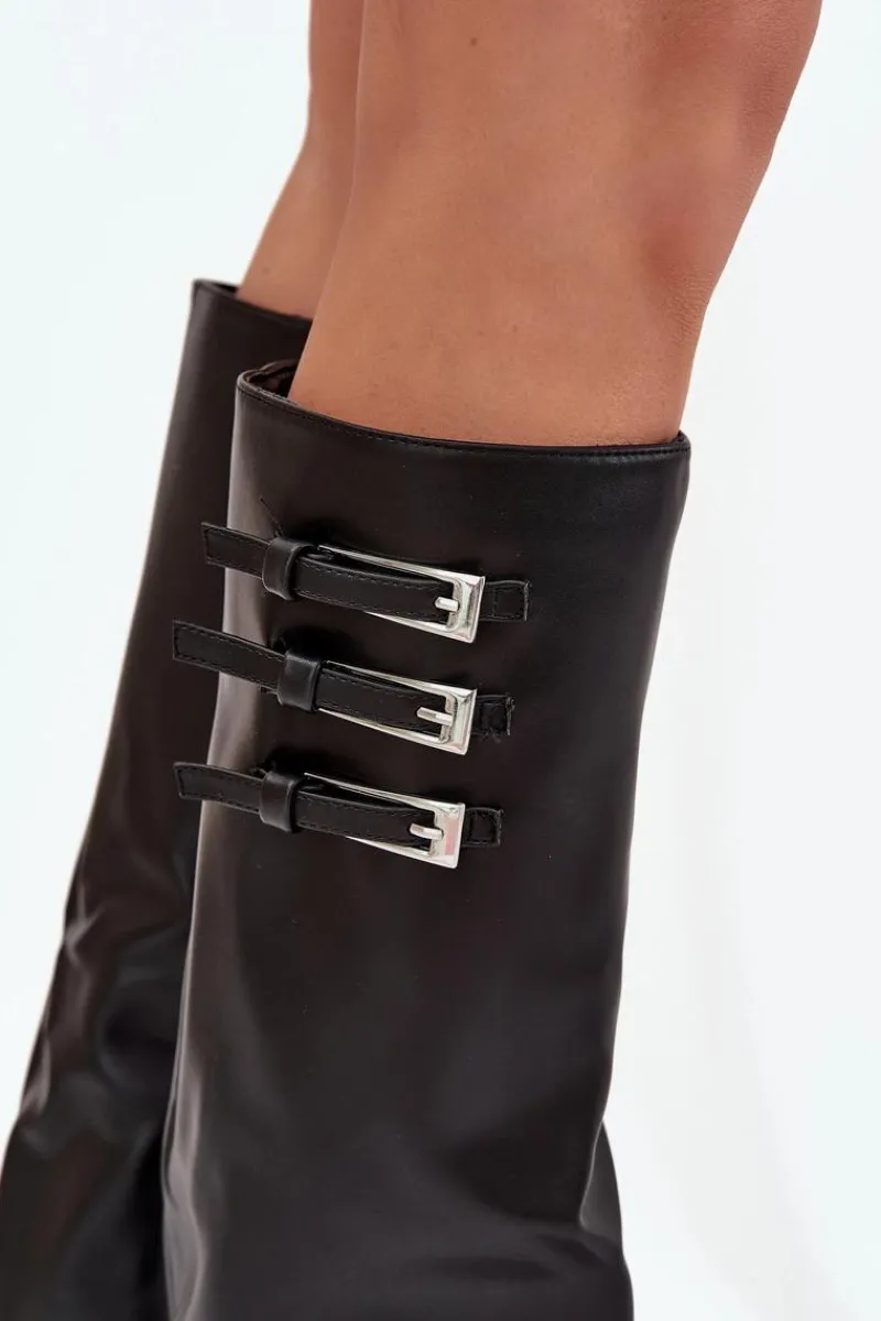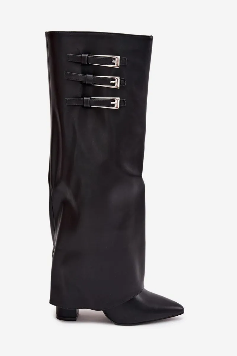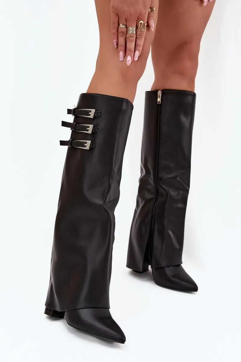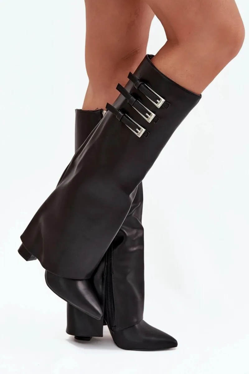 Kozaki damskie z eko skóry o stylowym fasonie z wywiniętą cholewką to połączenie elegancji i nowoczesnego designu. Zapinane na zamek, ze szpiczastymi noskami, optycznie wydłużają nogi. Obcas w formie słupka zapewnia komfort przez cały dzień. Na cholewce znajdują się trzy paseczki ze srebrnymi klamrami, które dodają wyjątkowego charakteru. Ocieplenie kocem obuwniczym gwarantuje ciepło, czyniąc je idealnym wyborem na chłodniejsze dni. Przy wyborze rozmiaru prosimy sugerować się tabelą rozmiarów.