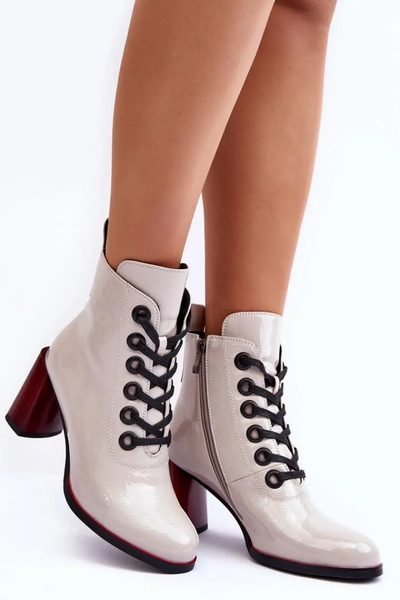 Botki marki S.Barski osadzone na obcasie w postaci słupka. Wykonane z eko skóry. Model zapinany na suwak po wewnętrznej stronie cholewki oraz dodatkowo posiada sznurowanie. Wnętrze ocieplone kocem obuwniczym. Zaokrąglone noski. Przy wyborze rozmiaru prosimy sugerować się tabelą rozmiarów.