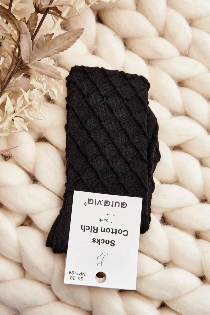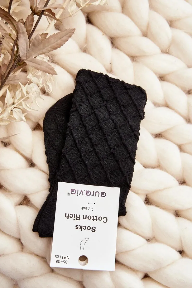 Damskie skarpety z ozdobnym tłoczeniem, świetnie sprawdzą się podczas chłodnych dni. Wykonane głównie z bawełny. Idealne jako dodatek do świątecznego prezentu. Koniecznie powinnaś je mieć!