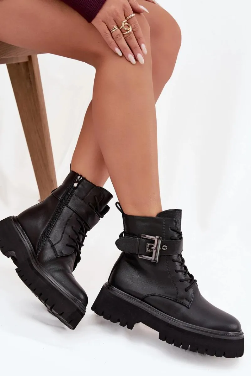 Botki workery damskie wykonane z naturalnej skóry. Model osadzony na platformie zapewnia stabilność oraz wygodę noszenia. Buty są sznurowane i zapinane na zamek, dzięki czemu doskonale dopasowują się do stopy i łatwo je zakładać. Wnętrze zostało ocieplone, co gwarantuje komfort i ciepło w chłodniejsze dni. Ozdobny pasek z klamrą nadaje im charakteru i modnego, lekko rockowego stylu. To doskonały wybór do codziennych stylizacji. Przy wyborze rozmiaru prosimy sugerować się tabelą rozmiarów.