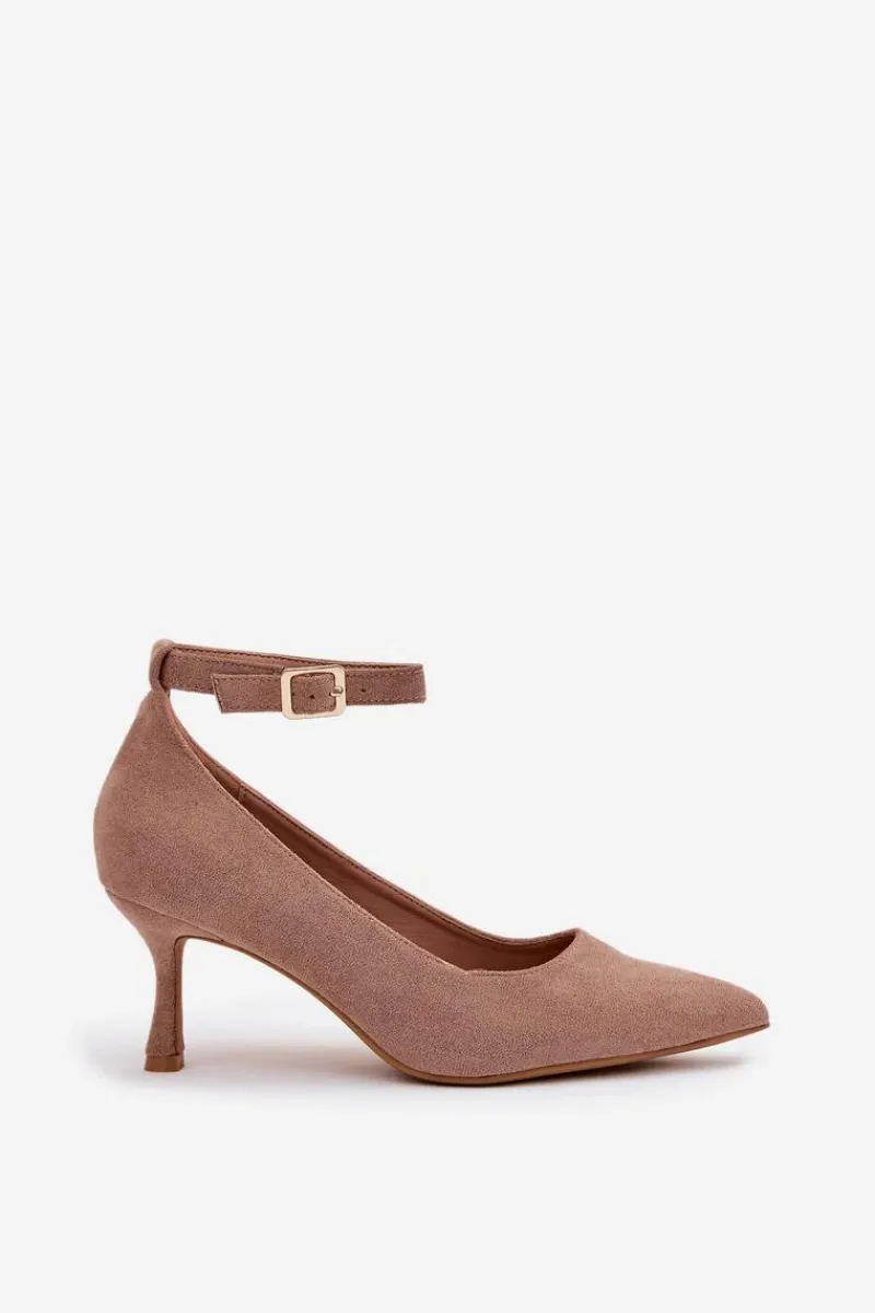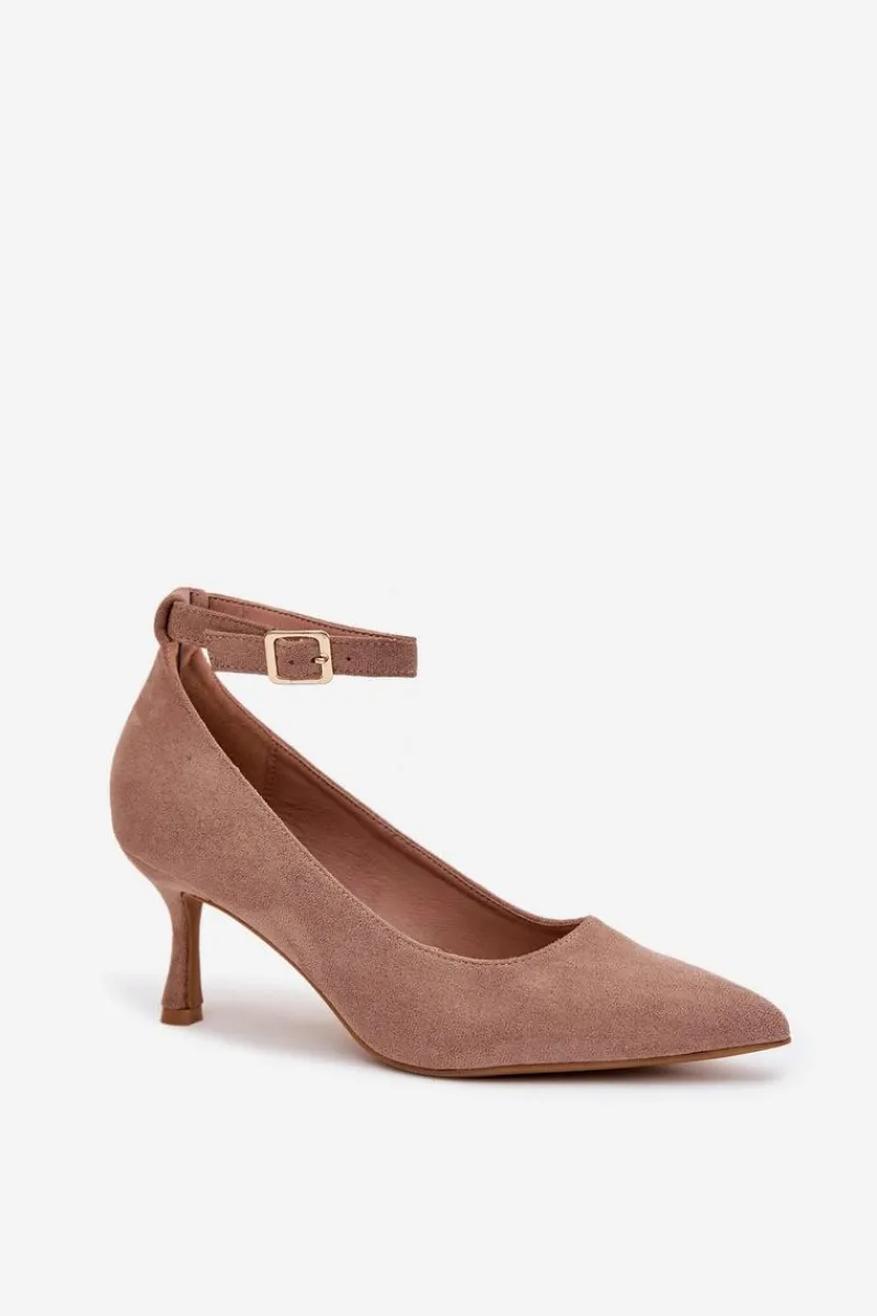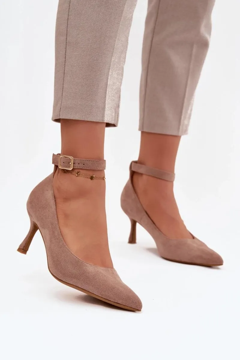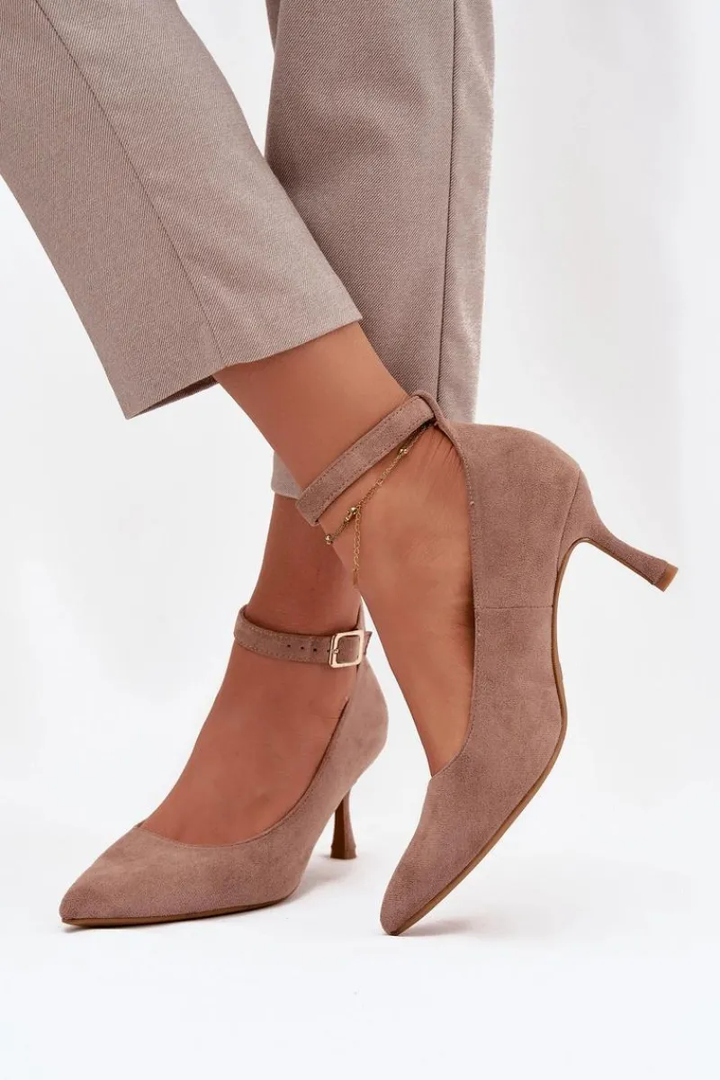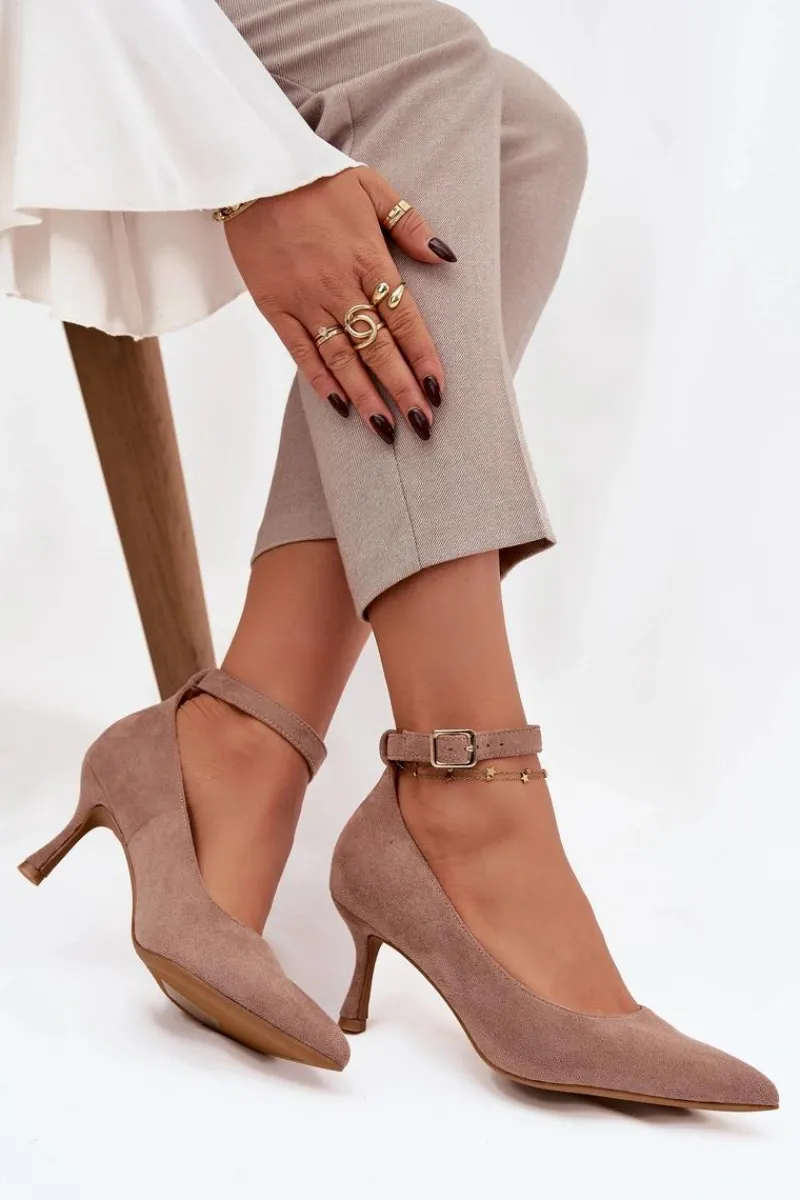 Czółenka – szpilki damskie wykonane z miękkiego eko zamszu. Model zachwyca klasycznym fasonem ze szpiczastym noskiem, który optycznie wysmukla nogi i dodaje sylwetce lekkości. Buty zapinane wokół kostki na regulowany pasek ze sprzączką pięknie podkreślają stopę, zapewniając jednocześnie stabilność i komfort podczas noszenia. Te czółenka doskonale sprawdzą się zarówno w stylizacjach wieczorowych, jak i eleganckich zestawach na co dzień.