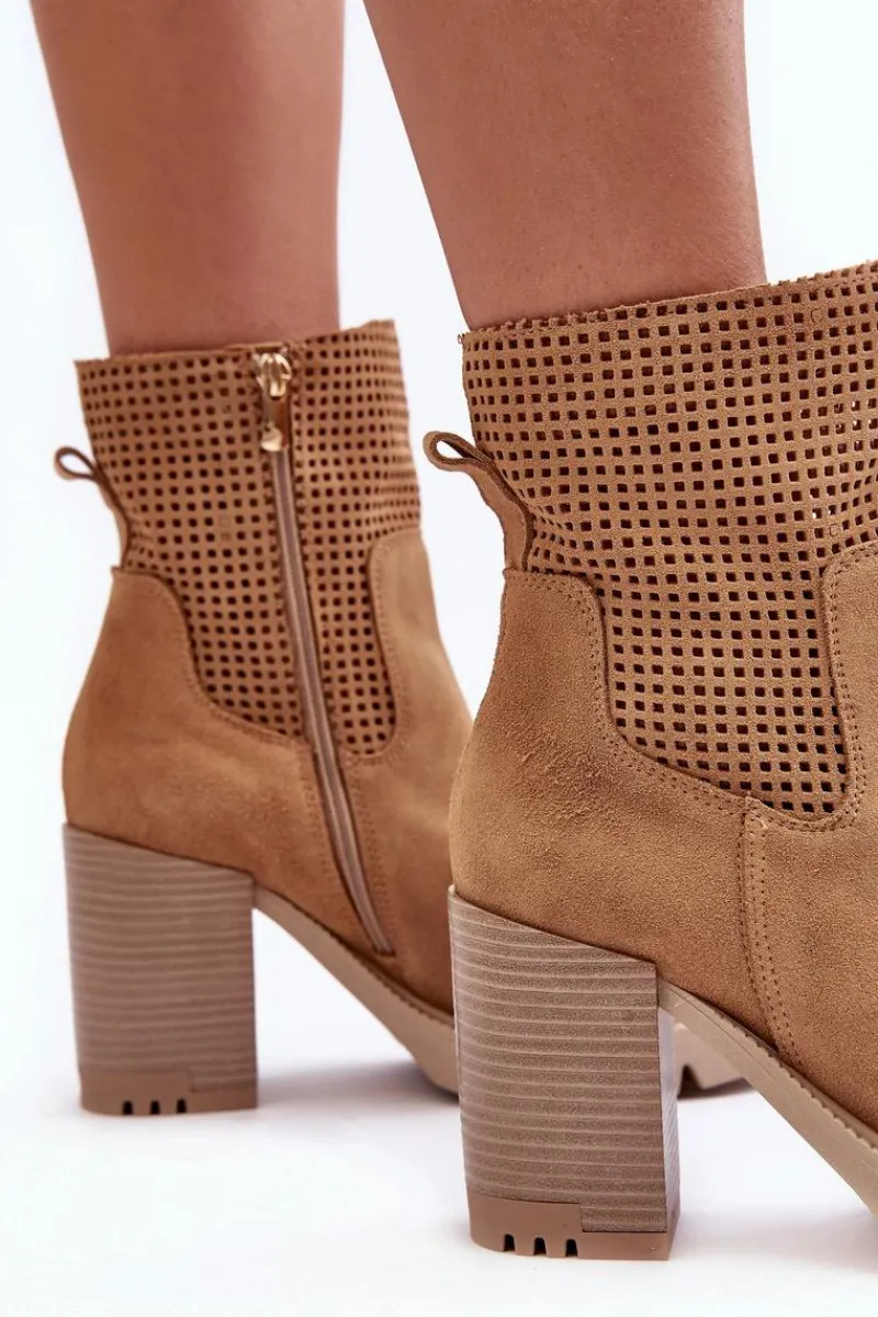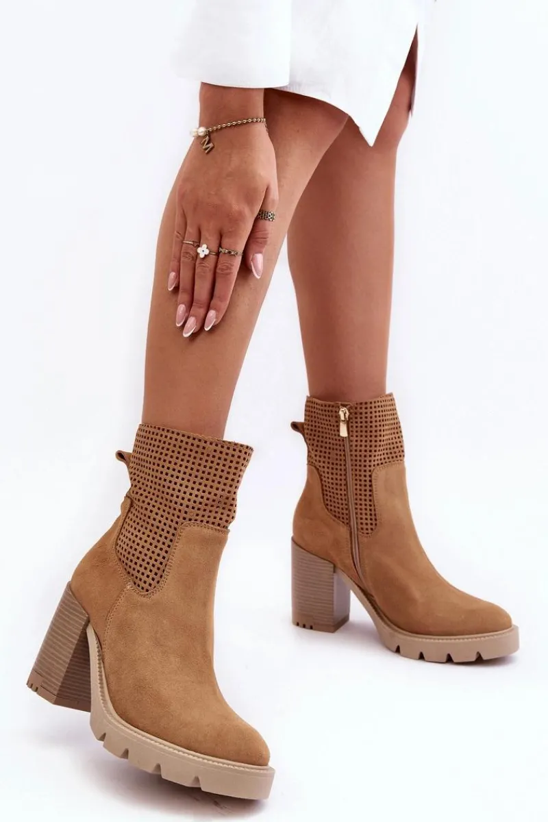 Modne, ażurowe botki na obcasie w postaci słupka zostały wykonane z wysokiej jakości skóry naturalnej. Zapinane na suwak z boku cholewki. Miękka, niezwykle wygodna wkładka została wykonana również z naturalnej skóry. Świetny model do wielu stylizacji! Przy wyborze rozmiaru prosimy sugerować się tabelą rozmiarów.
