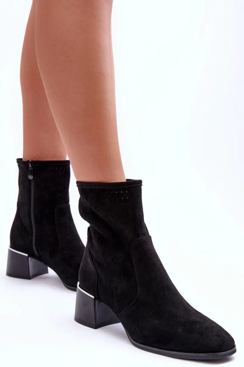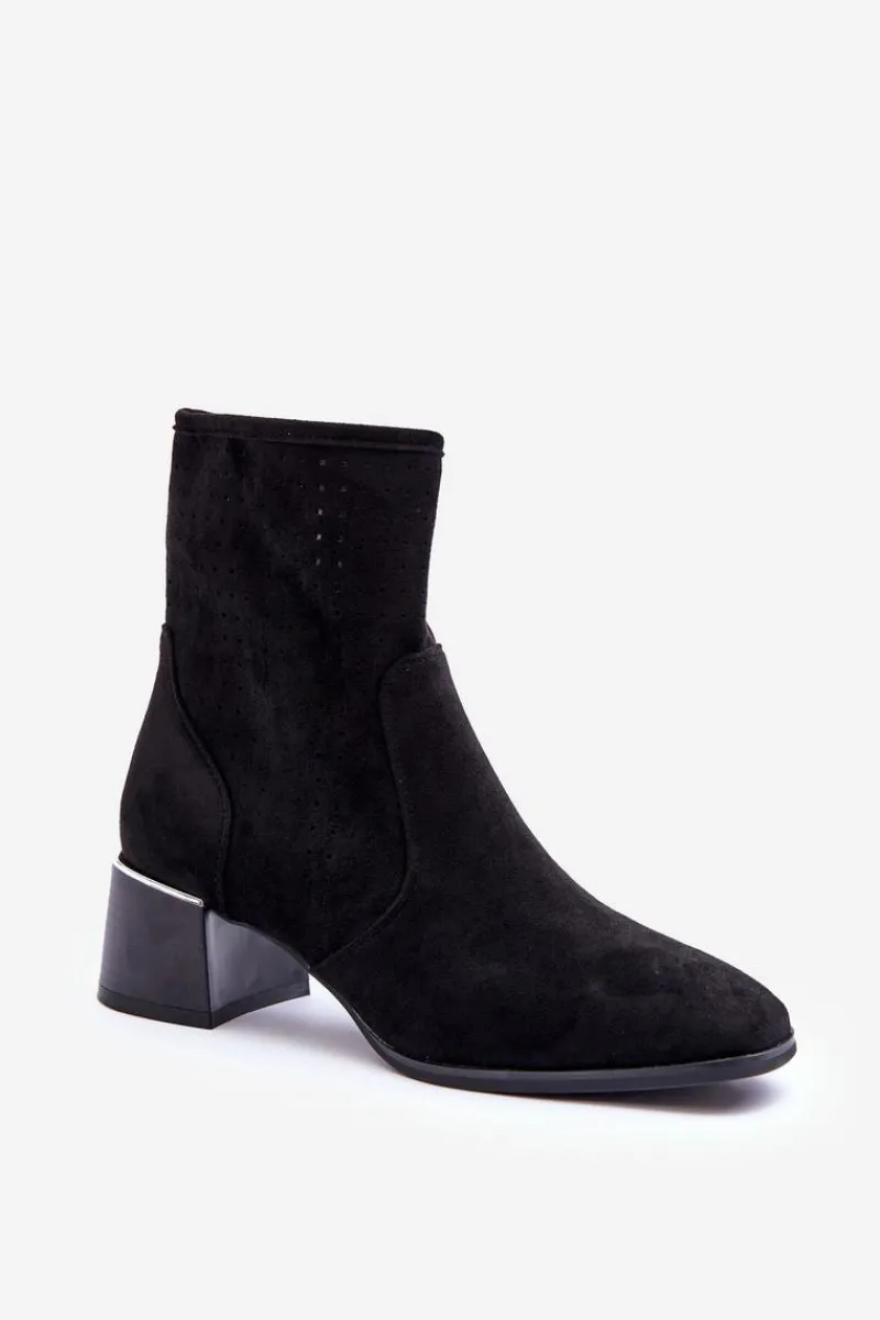 Online Zamszowe Ażurowe Botki Na Obcasie Czarne Perale Damskie Botki Wiosenne|Czarne Botki