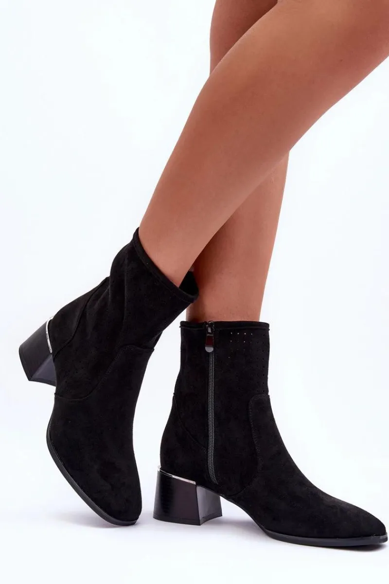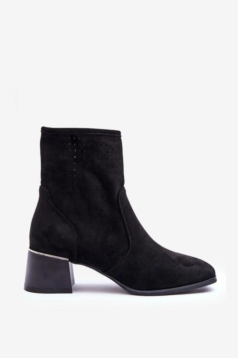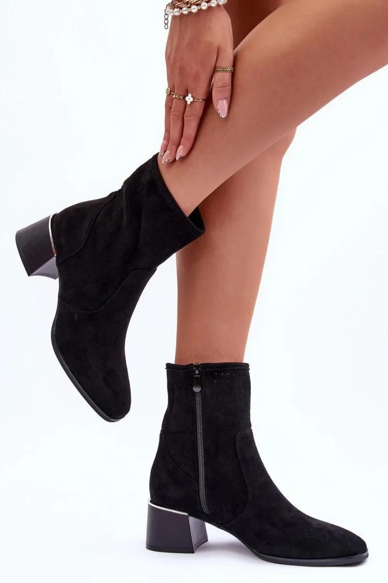 Eleganckie botki za kostkę zostały wykonane z eko zamszu. Osadzone na niskim obcasie. Ażurowy wzór na cholewce oraz lustrzany element nad obcasem. Miękka wkładka zapewni komfortowe użytkowanie obuwia. Zapiętek jest dodatkowo usztywniany. Przy wyborze rozmiaru prosimy sugerować się tabelą rozmiarów.