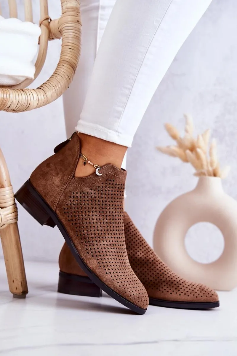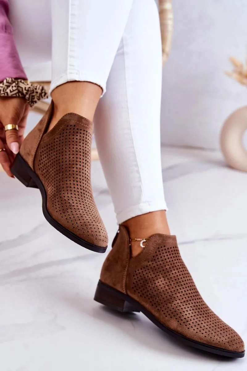 Botki wykonane z eko zamszu w ażurowy wzór idealnie pasują do wielu kobiecych stylizacji. Wewnątrz wkładka została wykonana z eko skóry. Zakładanie ułatwi wszyty z tyłu suwak. Płaski obcas zapewni stabilność. Świetnie sprawdzą się w sezonie wiosenno-letnim. Koniecznie musisz je mieć! Przy wyborze rozmiaru prosimy sugerować się tabelą rozmiarów.