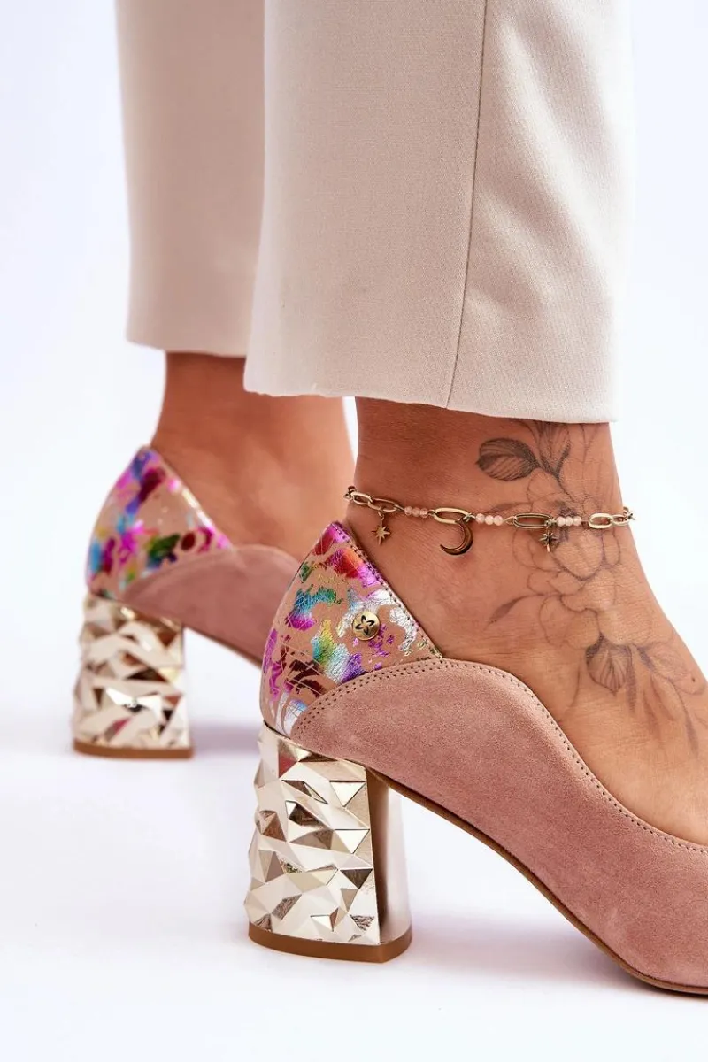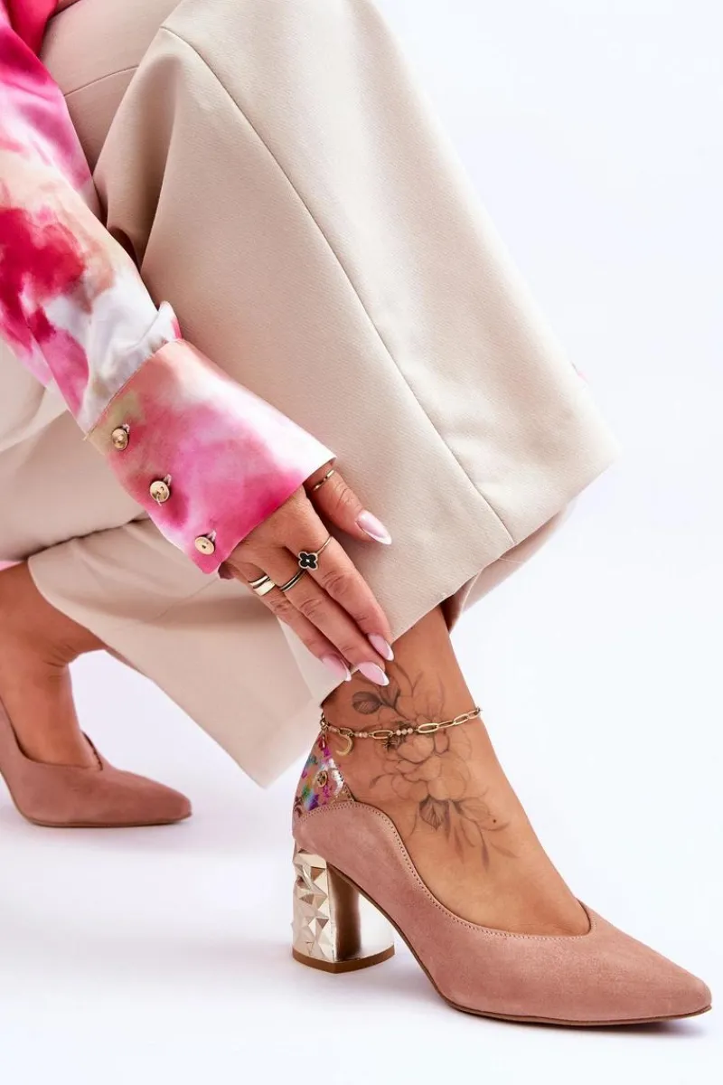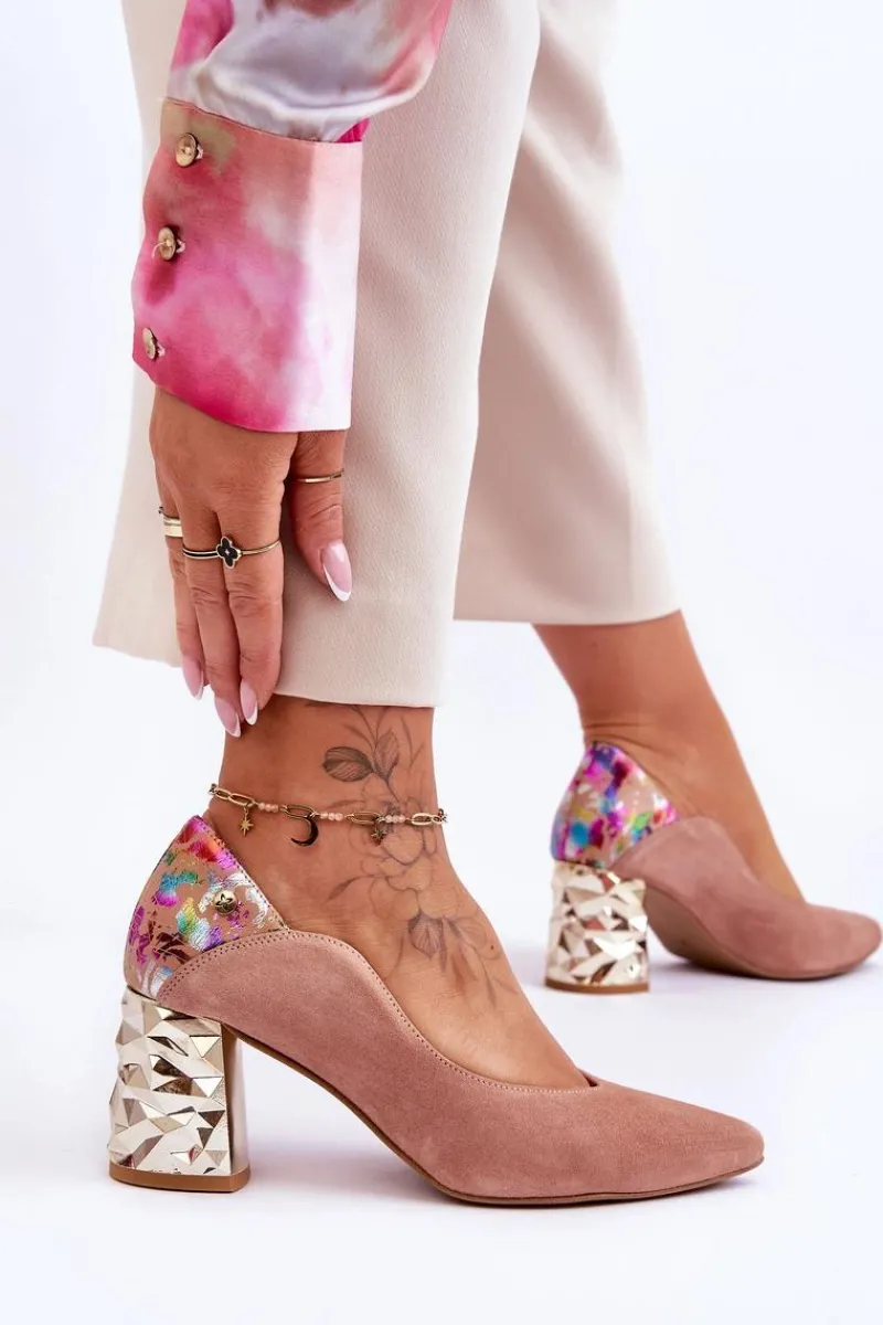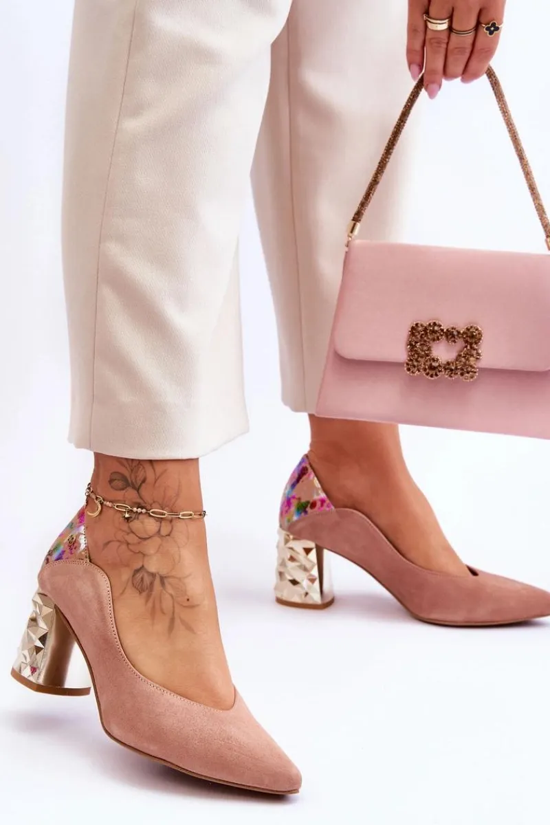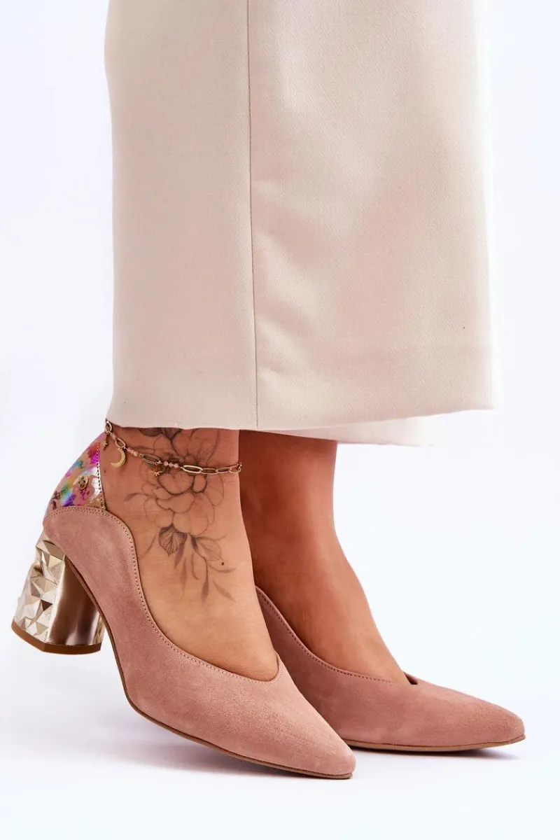 Online Zamszowe Czółenka Z Ozdobnym Obcasem 05042-15 Różowe Damskie Czółenka Na Słupku|Czółenka Klasyczne