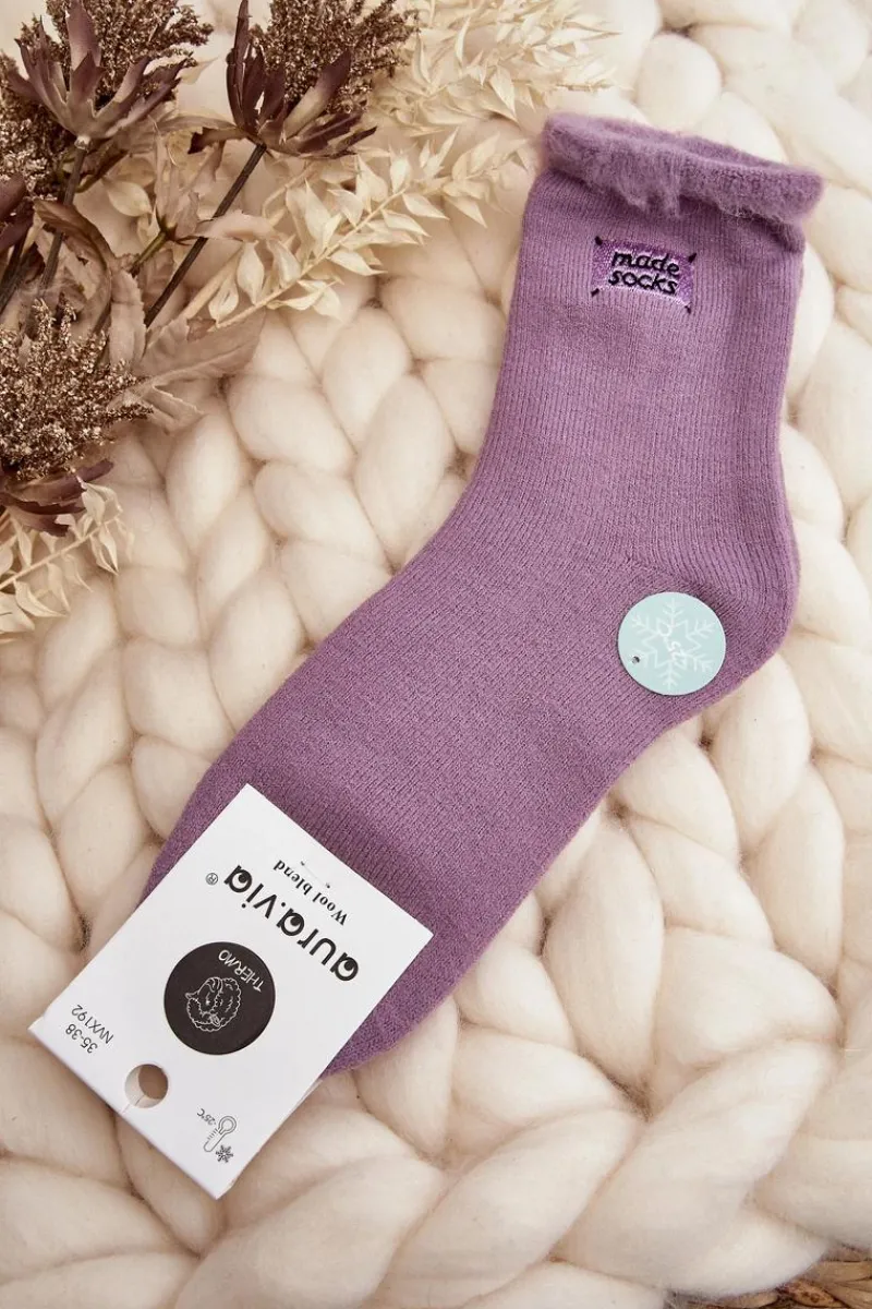 Ciepłe skarpety damskie idealne na mroźne dni. Model z małą naszywką. Lekki ściągacz sprawi, że będą idealnie dopasowane do tęgości nogi. Koniecznie powinnaś je mieć!