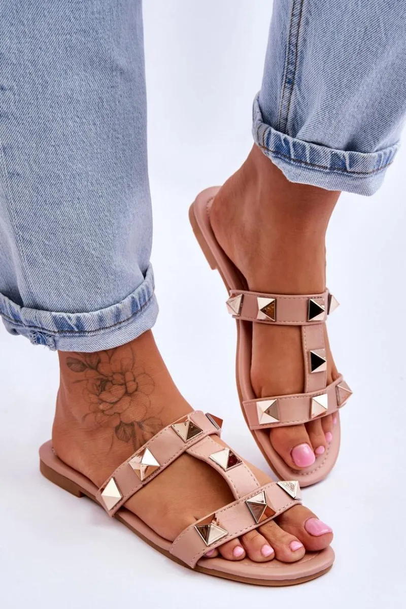 Damskie, klasyczne klapki zostały wykonane z eko skóry. Posiadają modne wycięcia na bokach. Dodatkowo zostały ozdobione dużymi ćwiekami. Klapki osadzono na płaskim obcasie z gumową, antypoślizgową podeszwą. Model ten z pewnością przypadnie do gustu każdej kobiecie podczas upalnych dni. Miękka, eko skórzana wkładka pozwoli na komfortowe użytkowanie obuwia nawet przez cały dzień. Przy wyborze rozmiaru prosimy sugerować się tabelą rozmiarów.