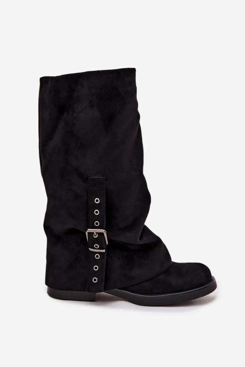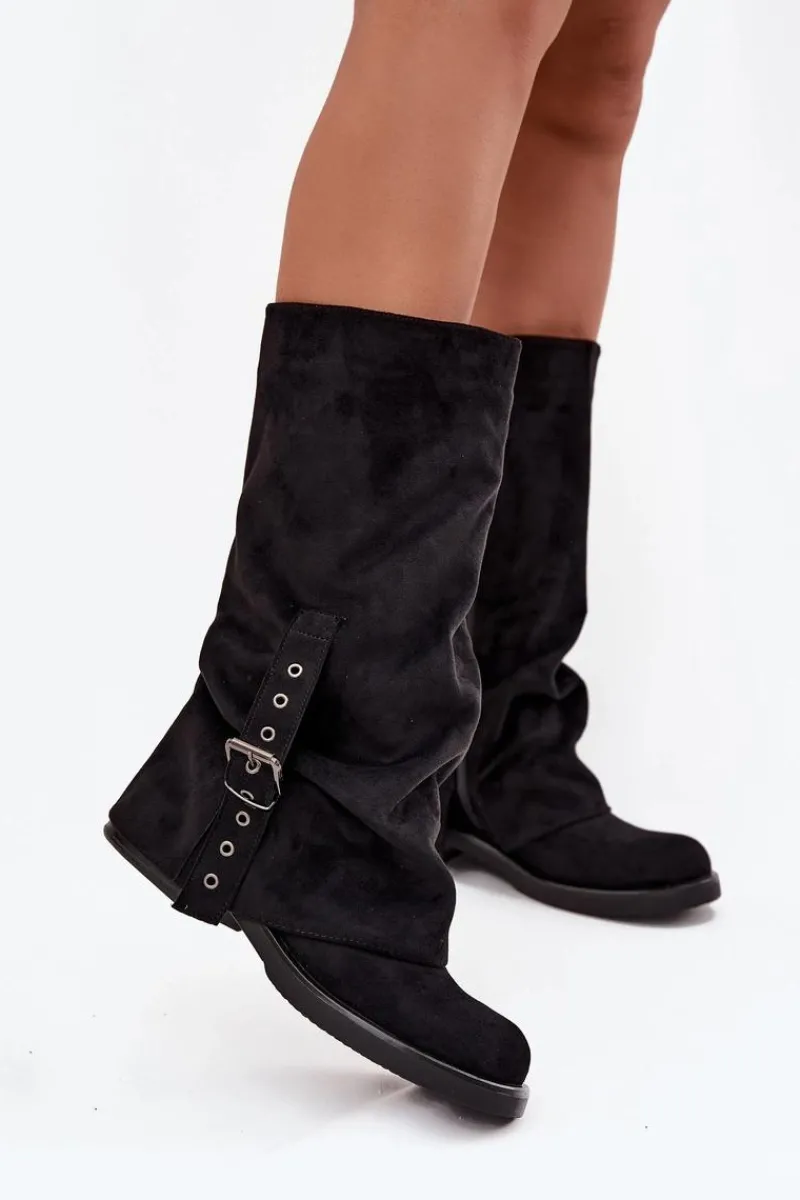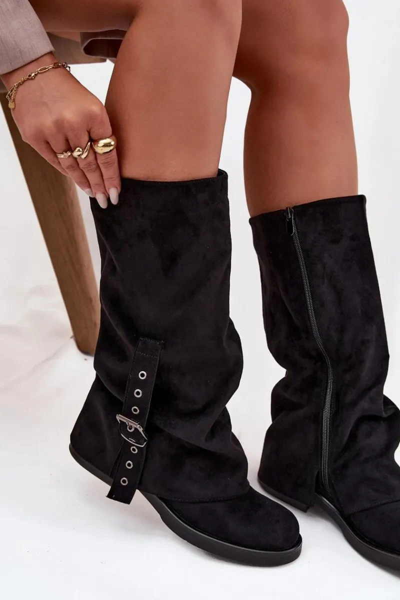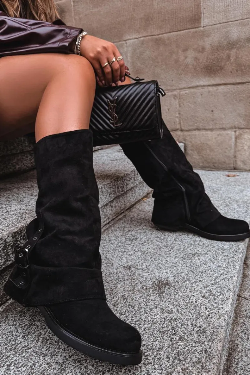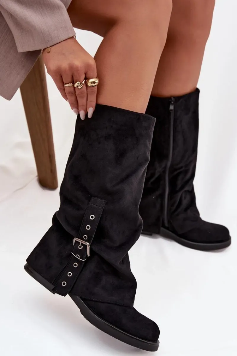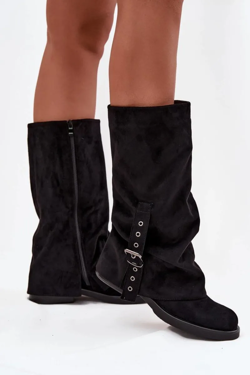 Stylowe kozaki damskie z eko zamszu to doskonałe połączenie wygody i modnego wyglądu. Wykonane z miękkiego, przyjemnego w dotyku materiału, prezentują się wyjątkowo elegancko i sprawdzą się zarówno w codziennych, jak i bardziej stylowych zestawach. Model osadzony jest na płaskim obcasie, dzięki czemu zapewnia komfort podczas chodzenia. Charakterystyczna marszczona cholewka nadaje im lekkości i nowoczesnego wyglądu, a ozdobny pasek z klamrą u dołu stanowi subtelny, stylowy akcent. Zaokrąglone noski dodają całości delikatności, a zamek błyskawiczny z boku ułatwia zakładanie i zdejmowanie butów. To idealna propozycja dla kobiet ceniących modny wygląd bez rezygnacji z wygody.Kozaki świetnie komponują się z dopasowanymi spodniami, spódnicami midi oraz dzianinowymi sukienkami – tworząc stylowe zestawy. Przy wyborze rozmiaru prosimy sugerować się tabelą rozmiarów.