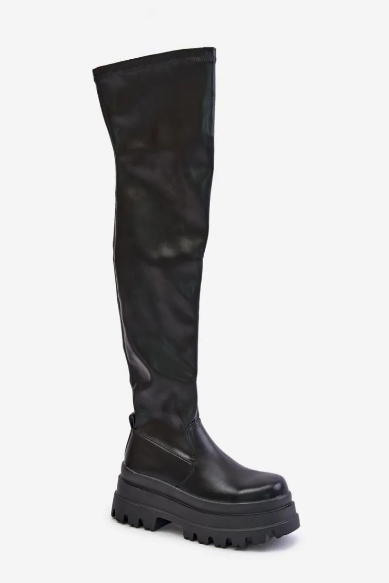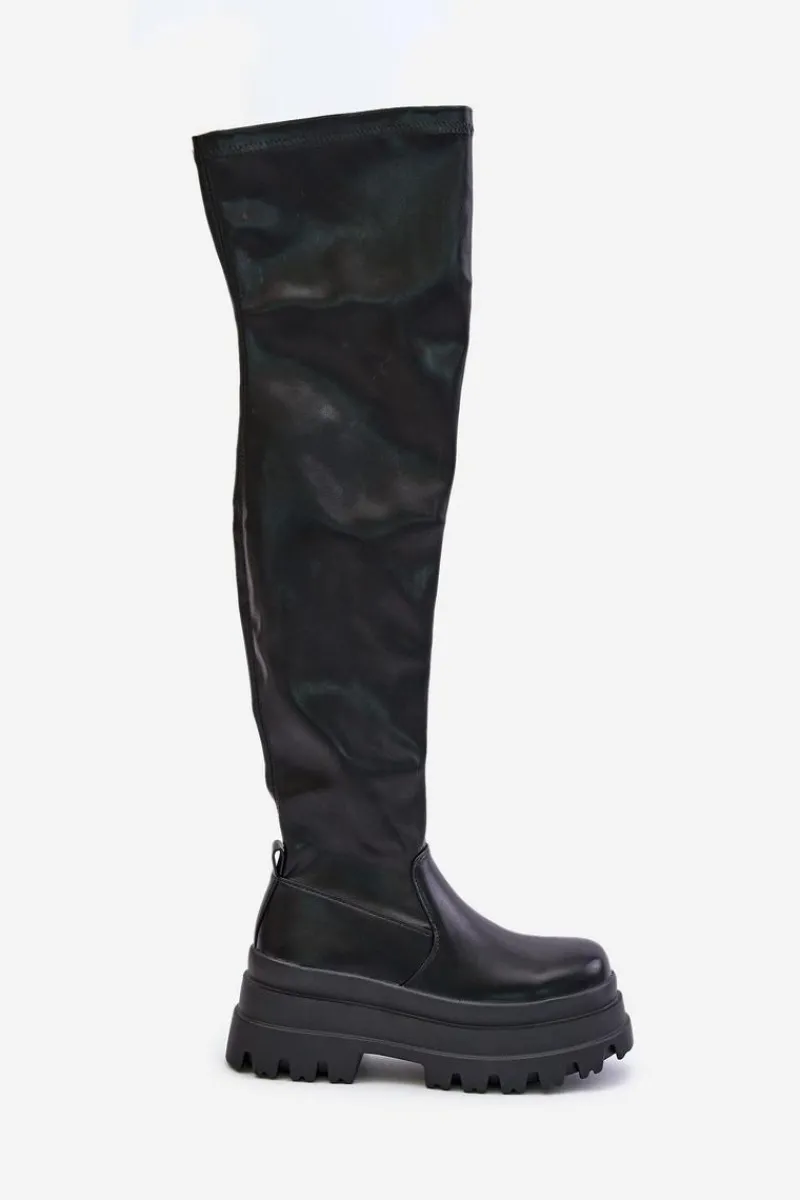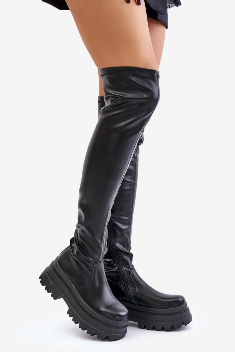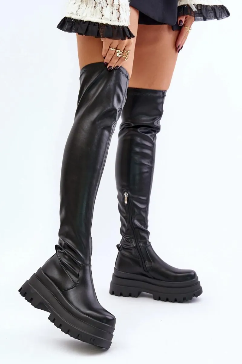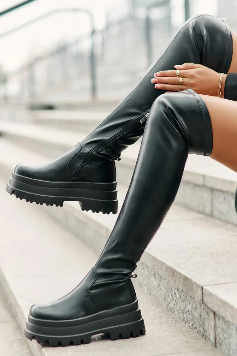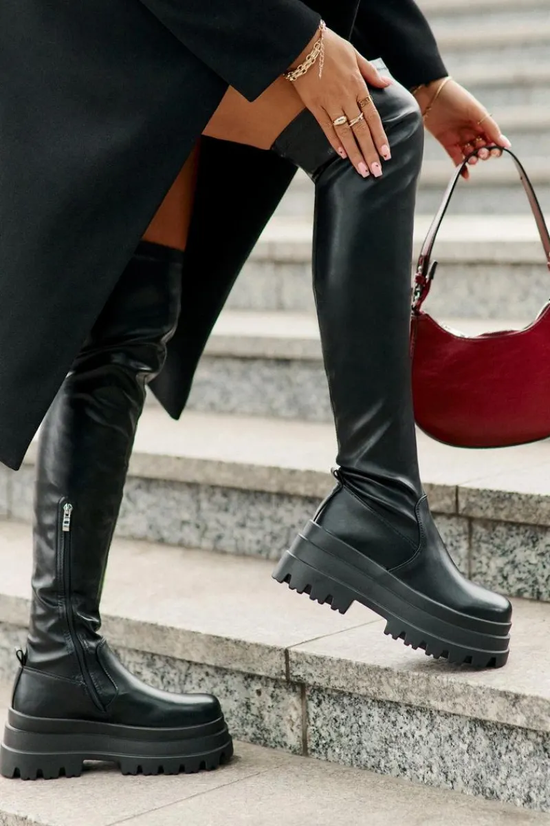 Kozaki za kolano osadzone na masywnej platformie to stylowy wybór na chłodniejsze dni. Model wsuwany, z dodatkowym suwakiem na dole cholewki, co ułatwia zakładanie i dopasowanie. Ocieplane wyłącznie na poziomie stopy, zapewniają ciepło i komfort noszenia. Modny fason, który doda charakteru każdej stylizacji. Przy wyborze rozmiaru prosimy sugerować się tabelą rozmiarów.
