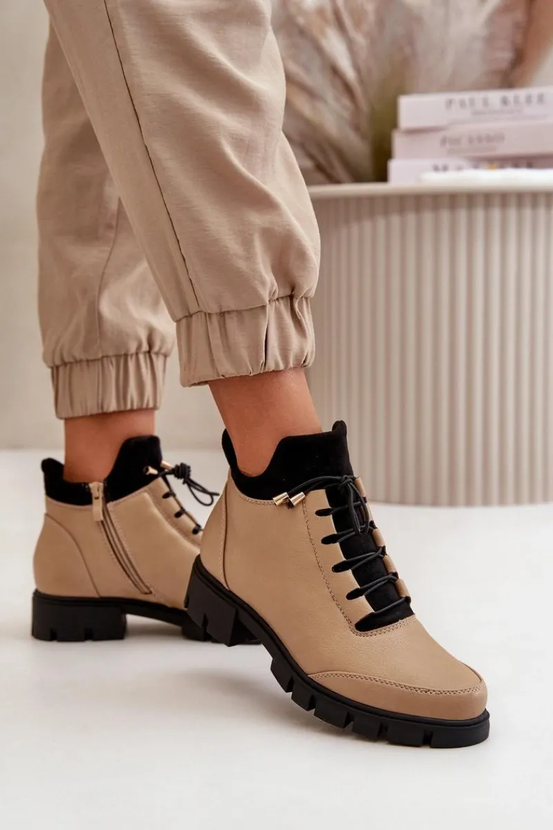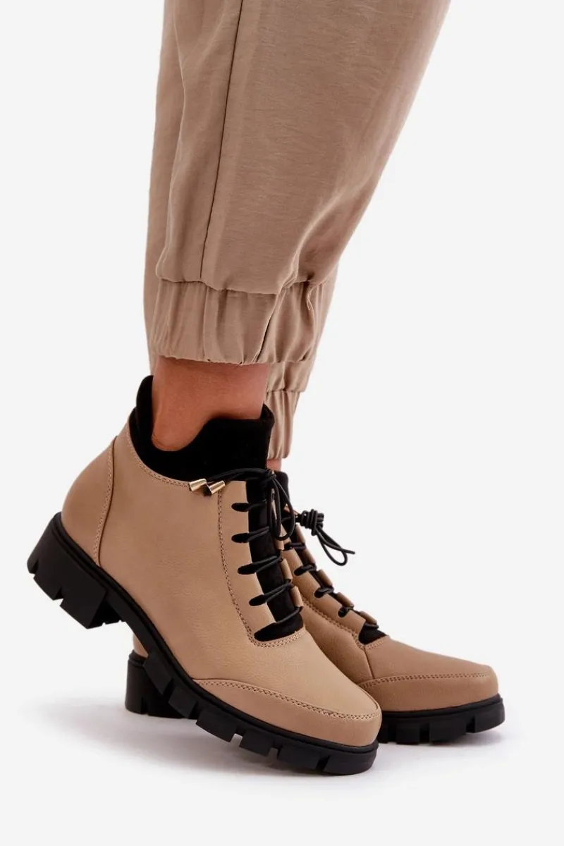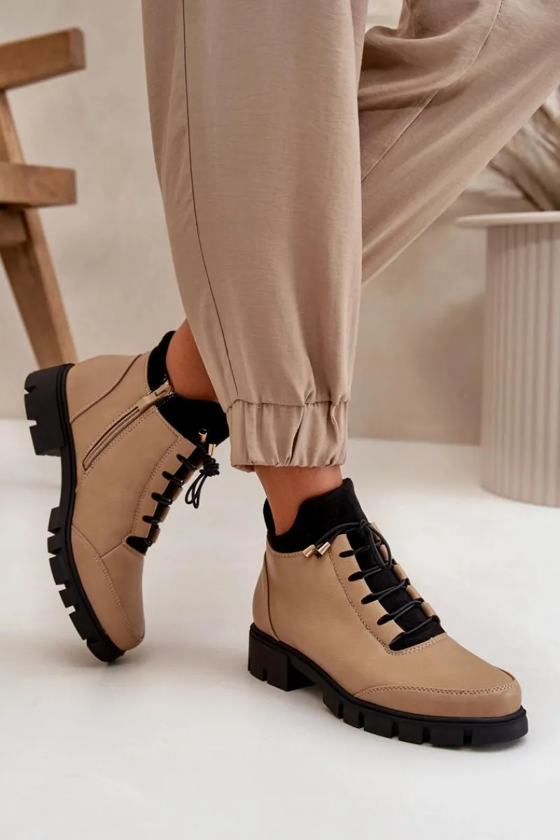 Botki damskie od marki Jezzi. Wykonane z eko skóry. Niska cholewka sięgająca za kostkę. Osadzone na płaskim obcasie. Zapinane na zamek oraz dodatkowo posiadają sznurowanie, co pozwala na idealne dopasowanie do stopy. Środek ocieplony miłym w dotyku kocem obuwniczym. Klasyczny fason do casualowych stylizacji! Przy wyborze rozmiaru prosimy sugerować się tabelą rozmiarów.