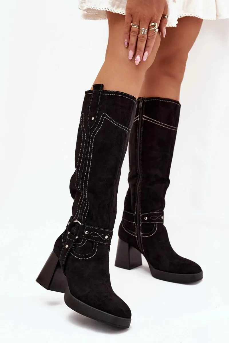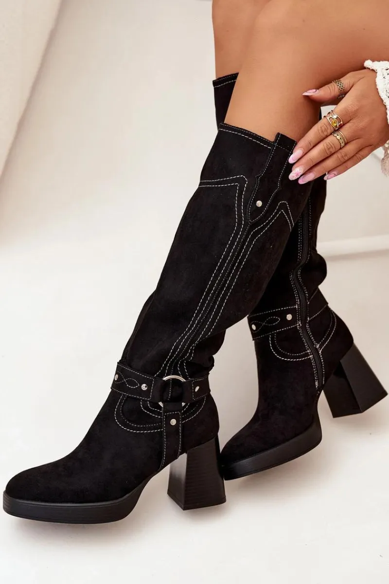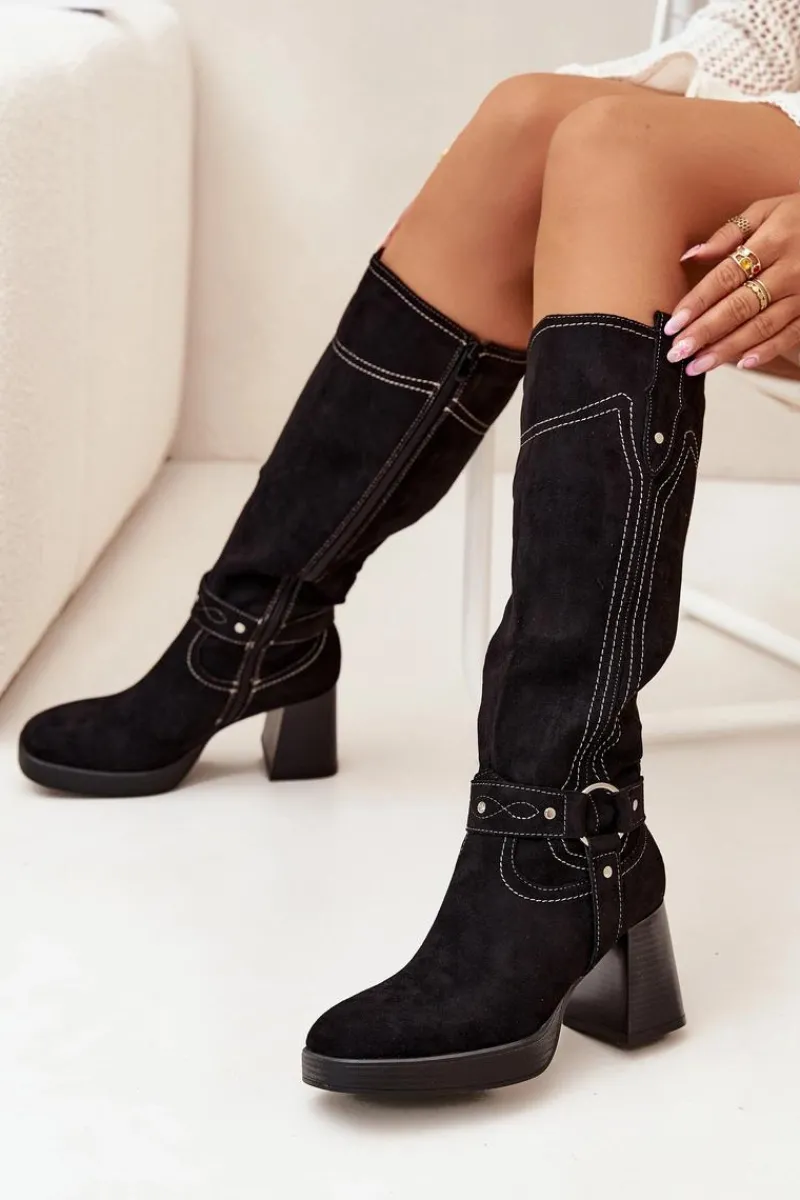 Outlet Boto Ocieplane Kozaki Damskie Na Słupku Z Przeszyciami Czarne Alessara Czarny