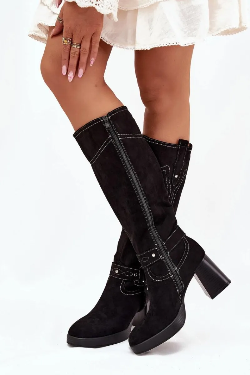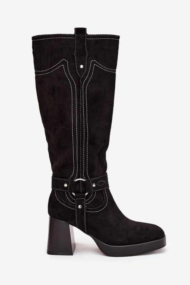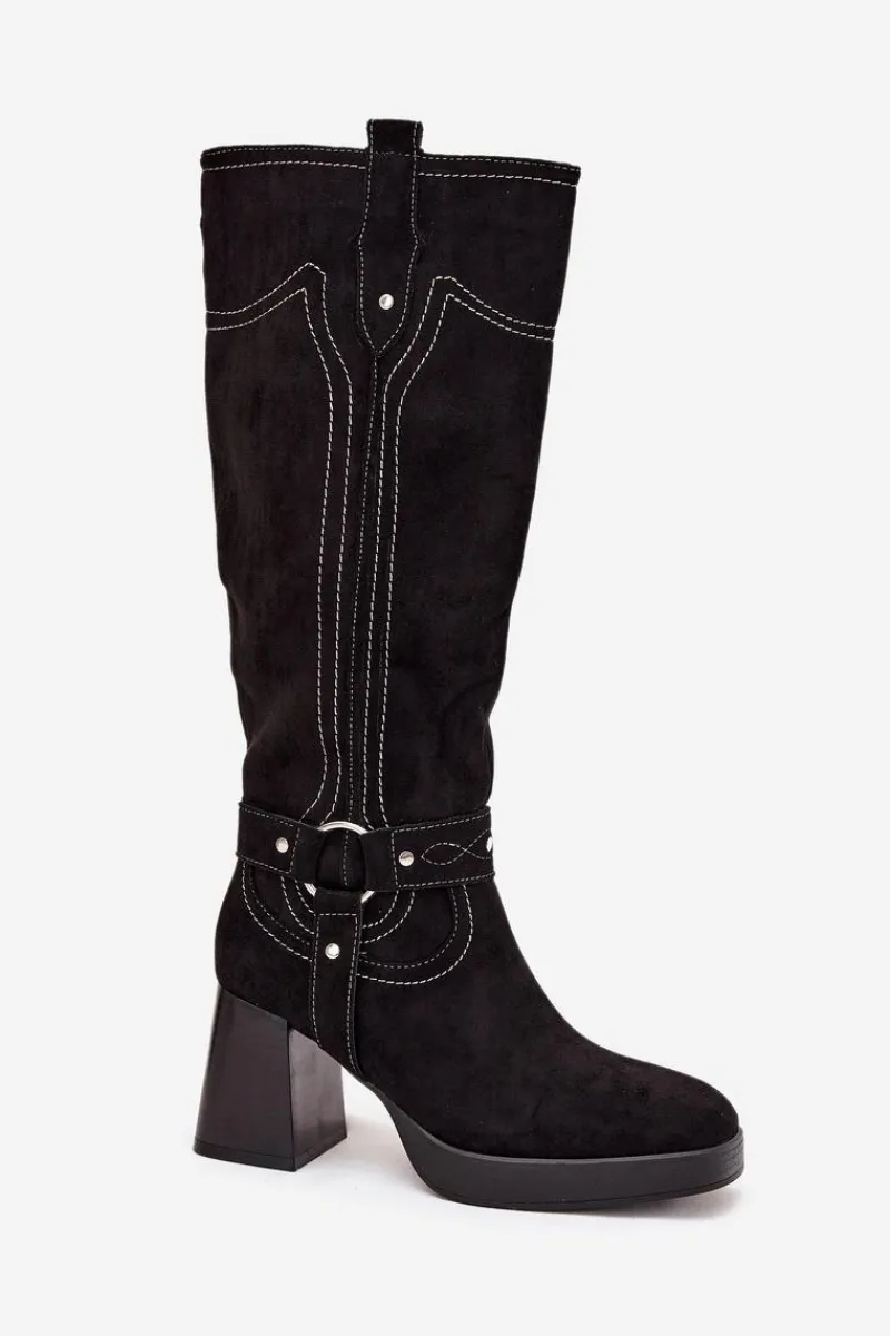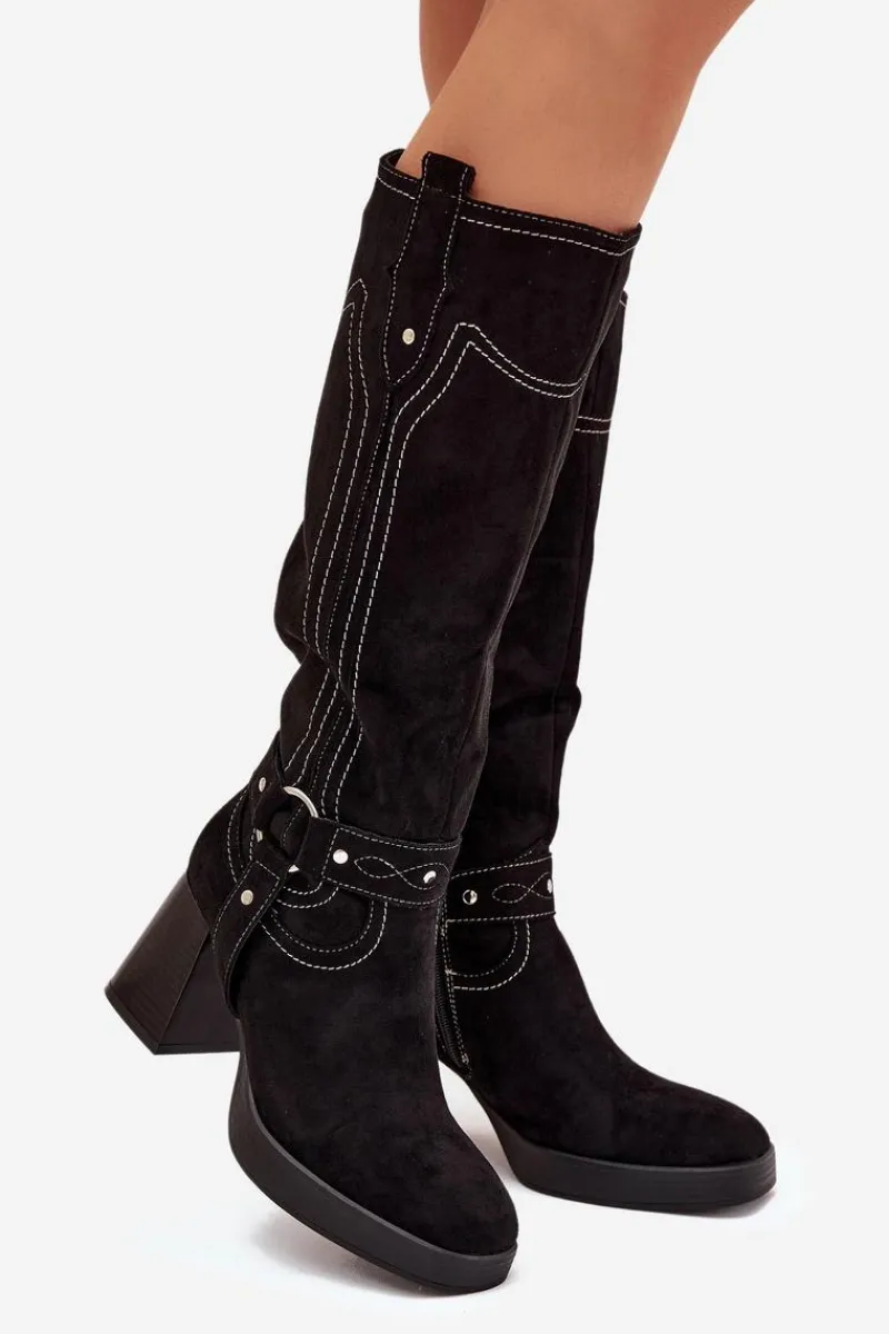 Outlet Boto Ocieplane Kozaki Damskie Na Słupku Z Przeszyciami Czarne Alessara Czarny