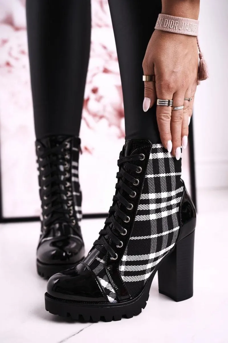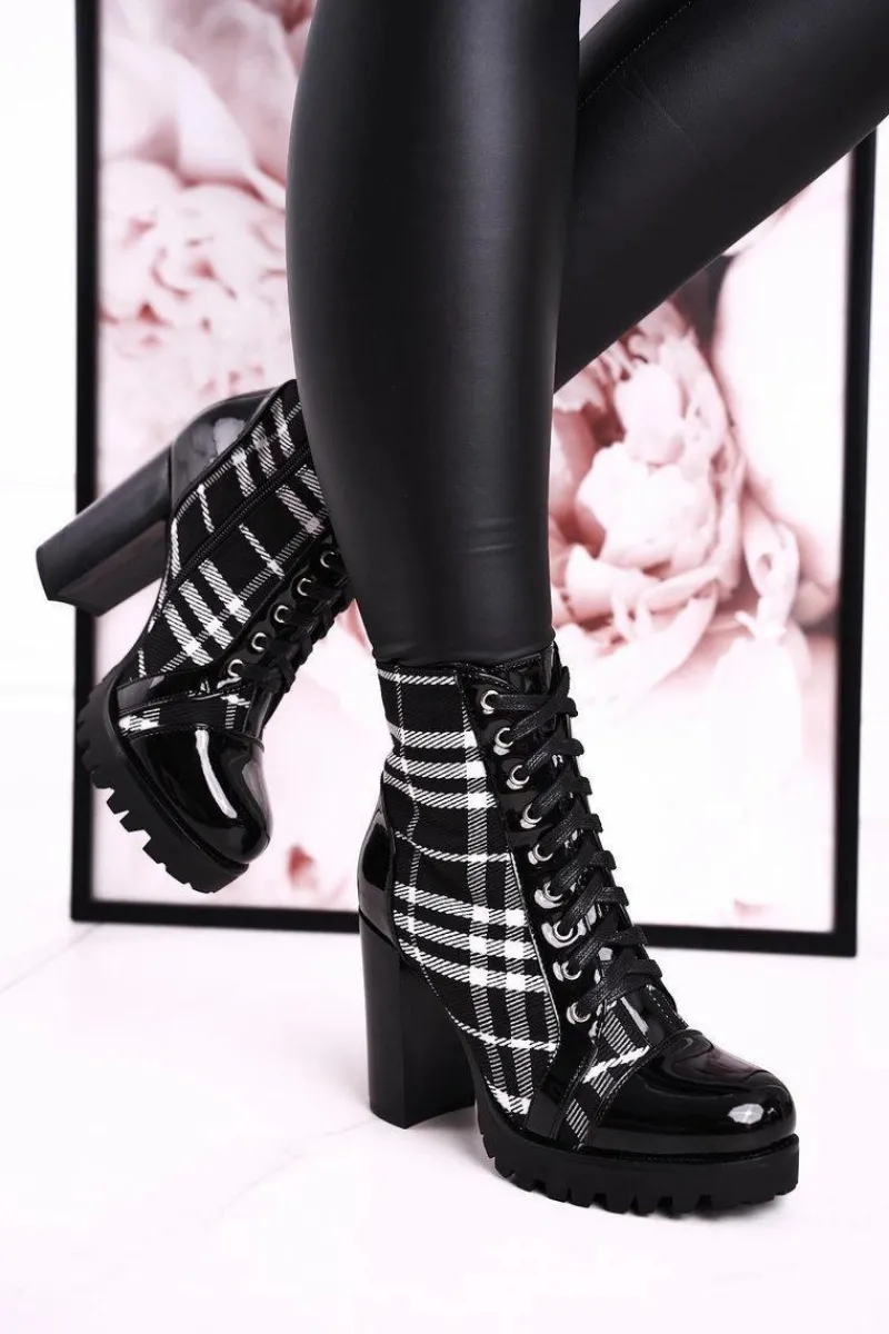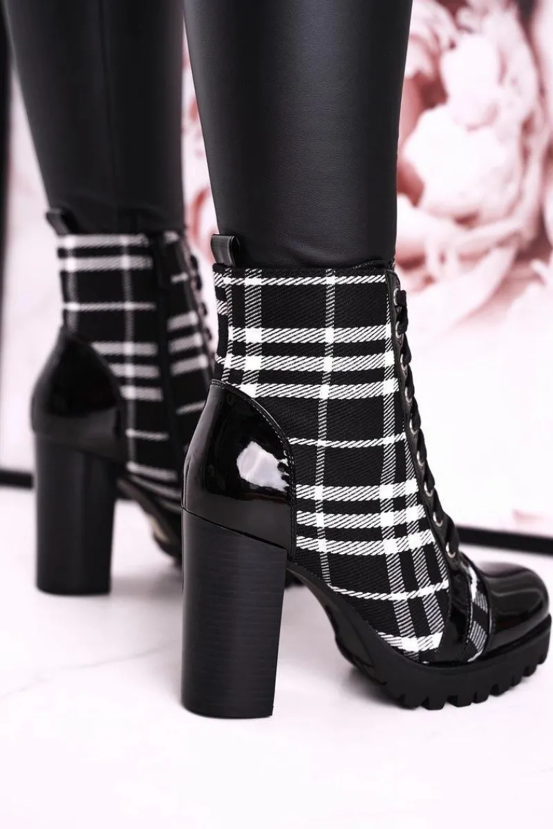 Outlet Damskie Botki Na Słupku W Kratę Czarne Blair Damskie Botki Sznurowane|Botki Na Słupku