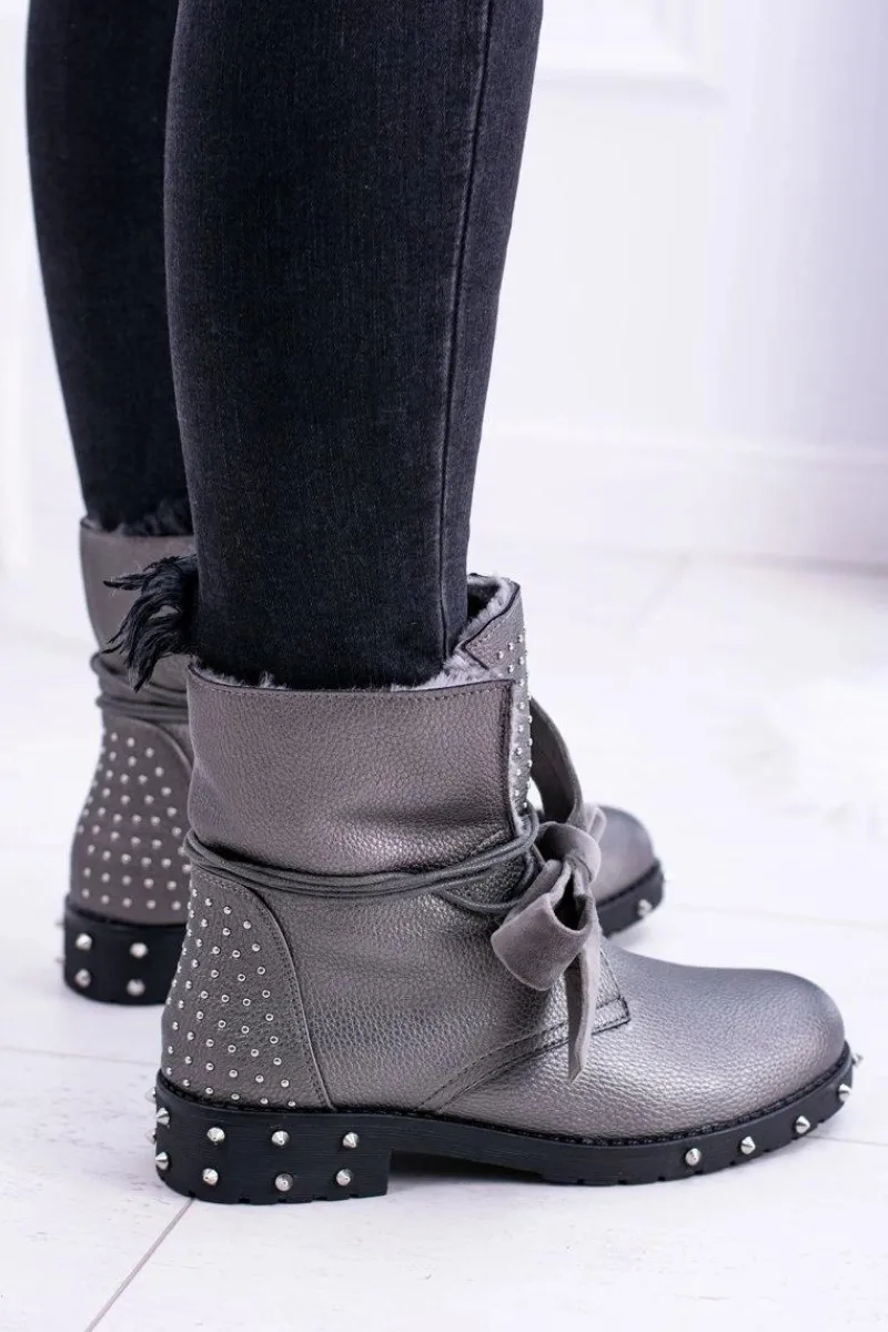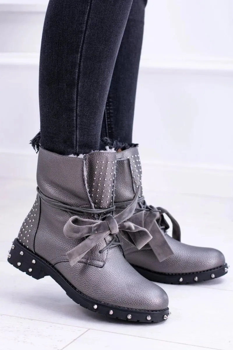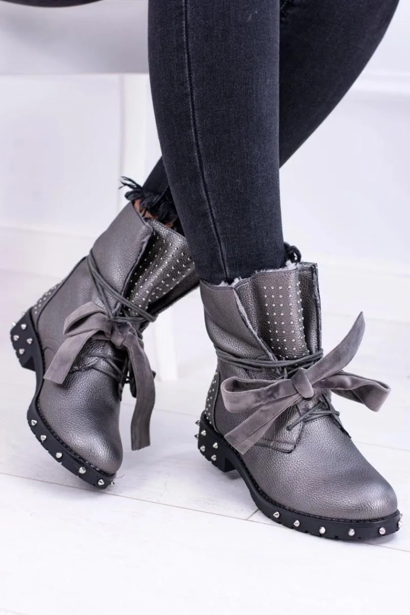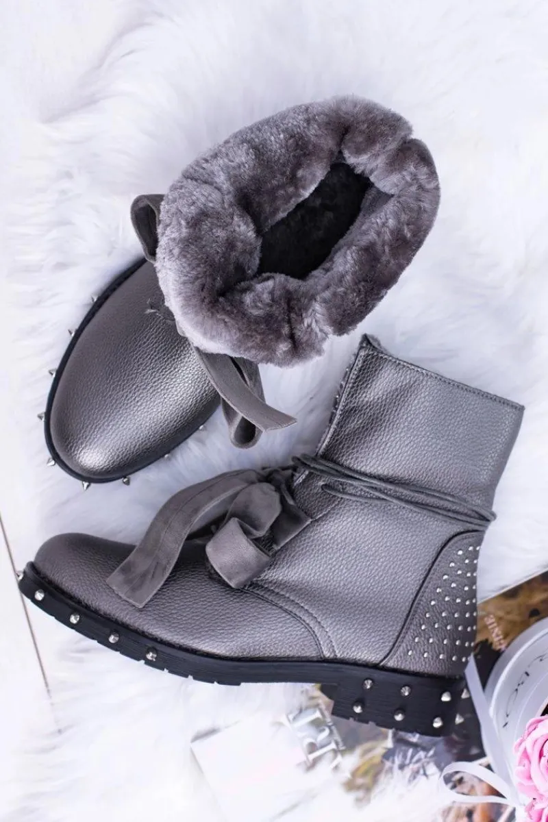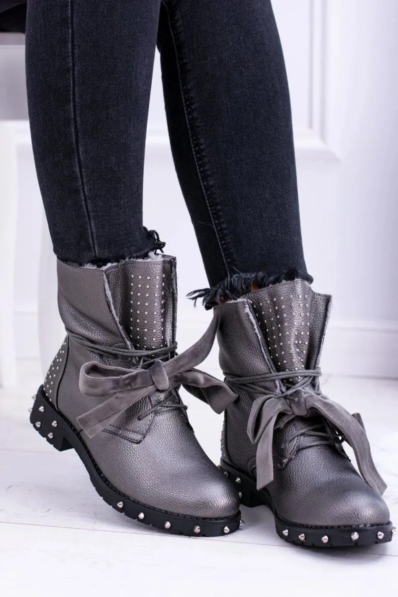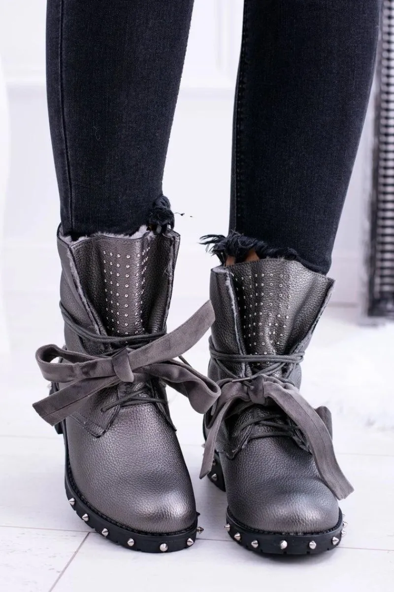 Outlet Damskie Botki Ocieplane Z Kolcami i Dżetami Srebrne Neso Damskie Botki Sznurowane|Botki Zimowe Damskie