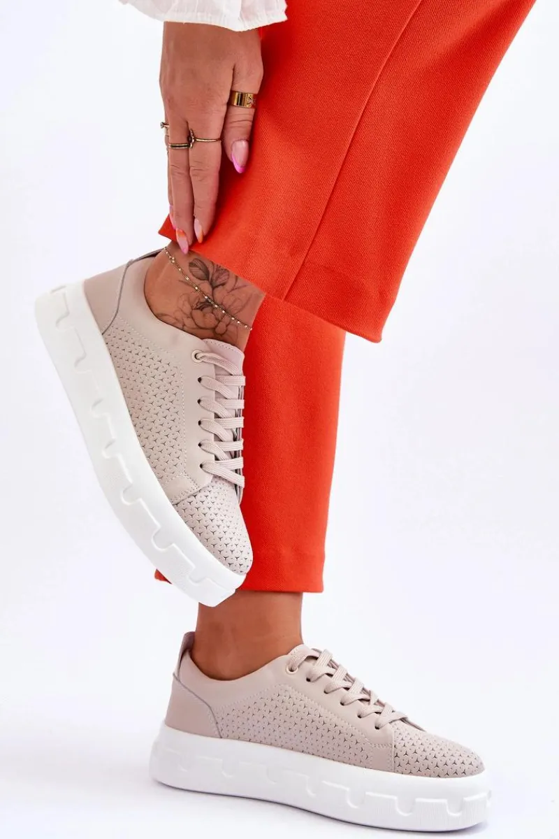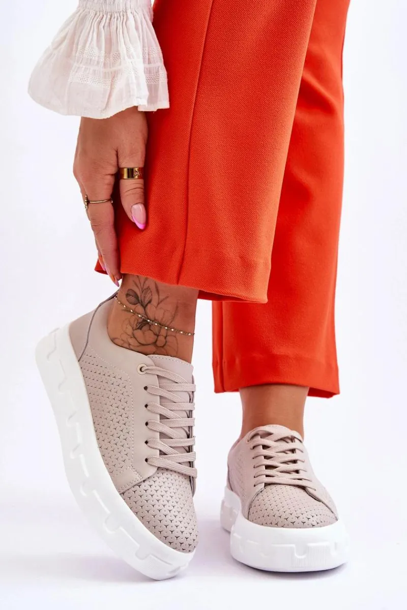 Te buty powinny być Twoje! Wykonane z wysokiej jakości naturalnej skóry z ciekawym wzorem. Osadzone na masywnej platformie wykonanej z tworzywa sztucznego. Model ten posiada klasyczne sznurowanie. Wkładka Comfort zapewni wygodę nawet przez cały dzień. Świetny model do dresów, jeansów czy dłuższych, prążkowanych sukienek.Przy wyborze rozmiaru prosimy sugerować się tabelą rozmiarów.