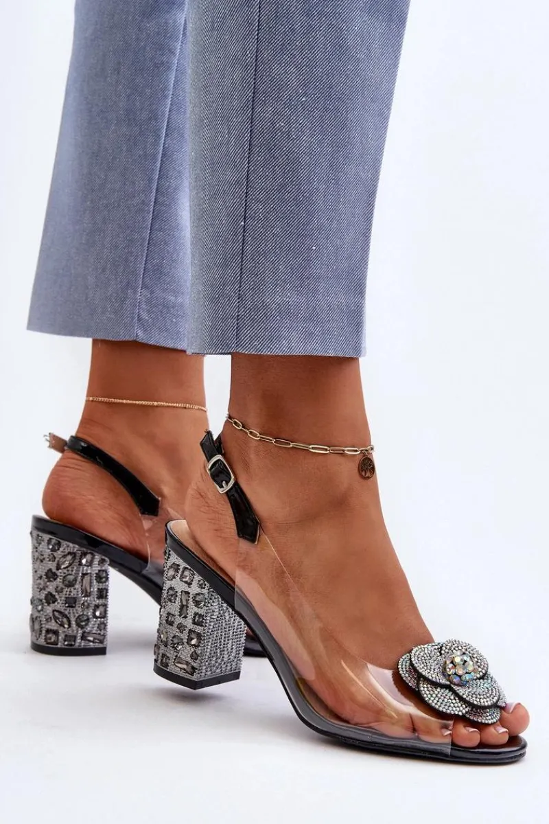 Eleganckie Sandały damskie z transparentną cholewką. Ozdoba z przodu nadaje subtelności. Obcas słupek wyróżnia się wyjątkowym wyglądem. Doskonałe na wieczorne wyjścia czy specjalne okazje, te sandały dodadzą Twojej stylizacji niepowtarzalnego uroku. Przy wyborze rozmiaru prosimy sugerować się tabelą rozmiarów.