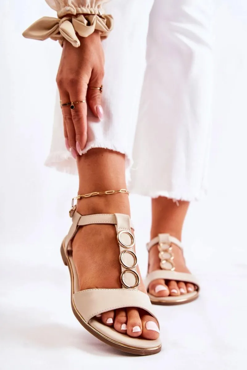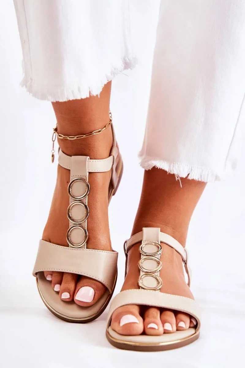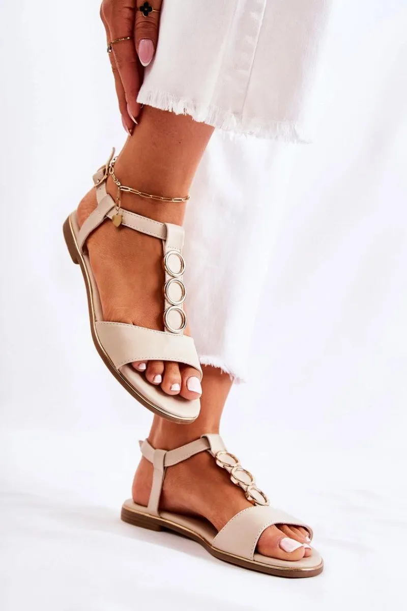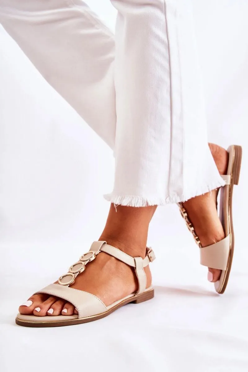 Szukasz lekkiego i przewiewnego obuwia na upalne dni? Te sandały będą idealne! Wykonane z eko skóry. Posiadają zdobienie w postaci kół na środkowym pasku. Zapinane wokół kostki na regulowany pasek ze sprzączką, który pozwoli na odpowiednie dopasowanie obuwia. Nosek odkryty, zaokrąglony. Osadzone na płaskim obcasie, z podeszwą z gumowego tworzywa, która jest dodatkowo antypoślizgowa. Wkładka miękka, wygodna, wykonana z eko skóry. Przy wyborze rozmiaru prosimy kierować się tabelą rozmiarów.