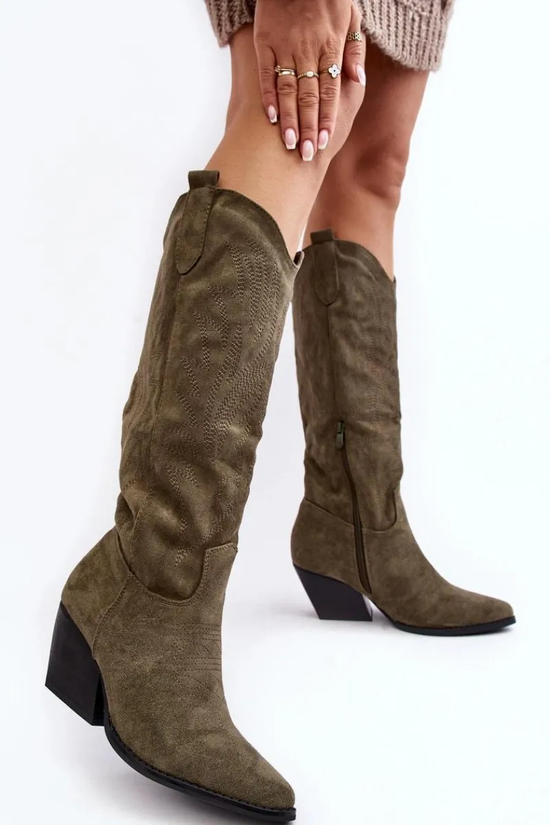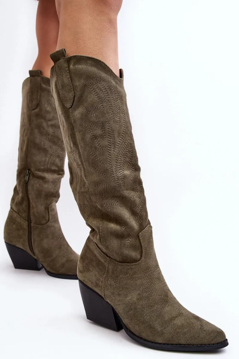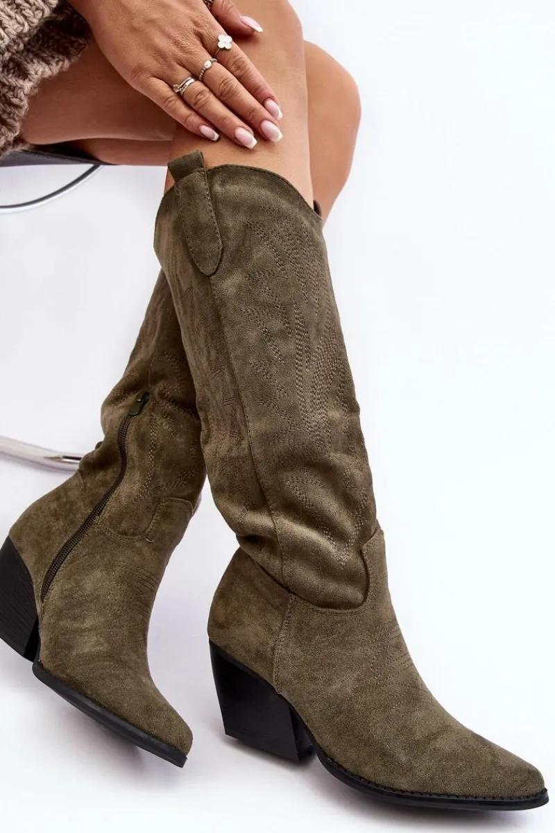 Damskie kozaki przed kolano wykonane z eko zamszu. Osadzone na obcasie w postaci niskiego słupka. Noski w szpic optycznie wysmuklą nogi. Zapiętek jest usztywniony. Miękka wkładka zapewni komfort podczas użytkowania. Cholewka ozdobiona licznymi przeszyciami. Model wsuwany z dodatkowym suwakiem. Świetnie sprawdzą się podczas jesiennych stylizacji! Przy wyborze rozmiaru prosimy sugerować się tabelą rozmiarów.
