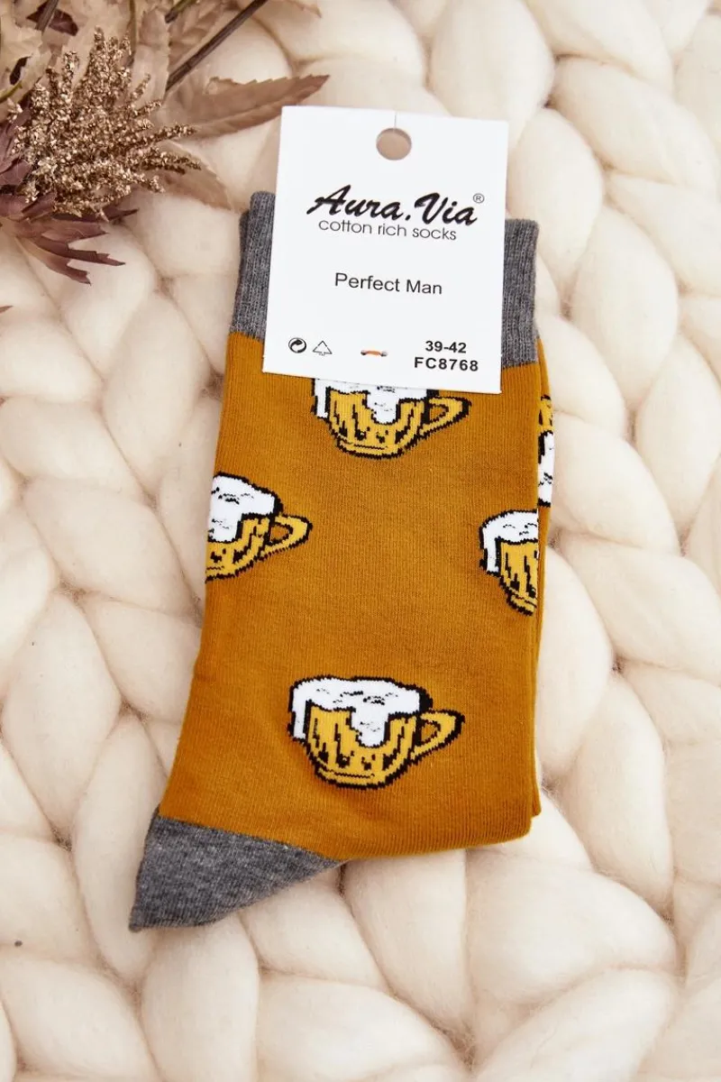 Outlet Męskie Skarpetki We Wzory Piwo Żółto-Szare Skarpetki|Skarpetki