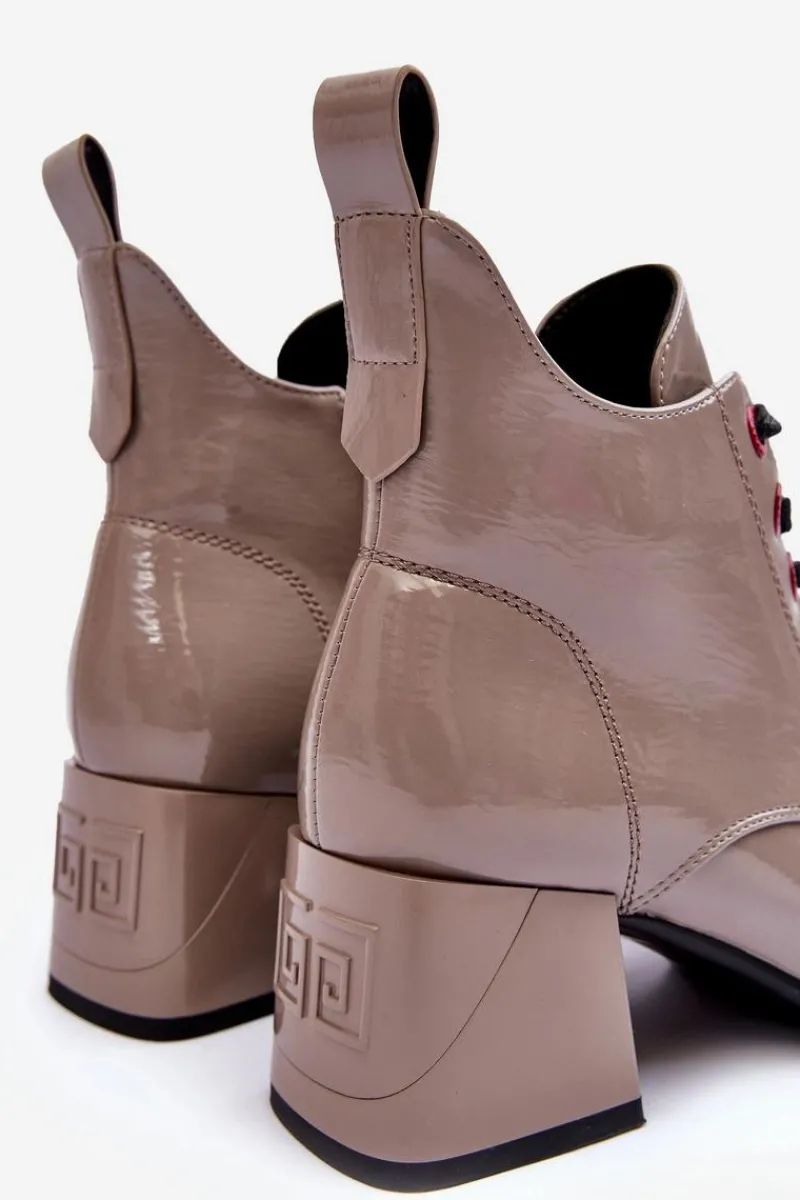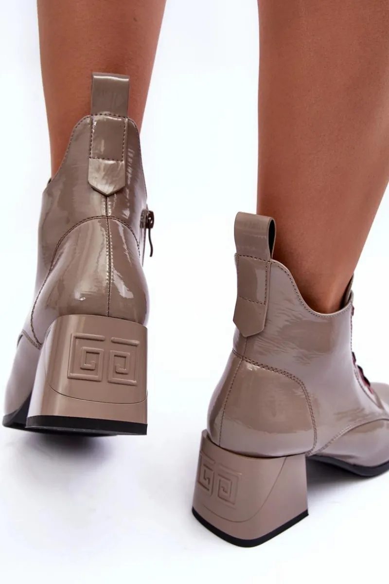 Botki damskie z niską cholewką wykonane z eko skóry. Osadzone na obcasie w postaci klocka. Noski w migdał. Środek ocieplony kocem obuwniczym. Model zapinany na suwak z boku oraz dodatkowo sznurowany. Miękka wkładka zapewni komfortowe użytkowanie obuwia. Zapiętek jest usztywniony. Przy wyborze rozmiaru prosimy sugerować się tabelą rozmiarów.