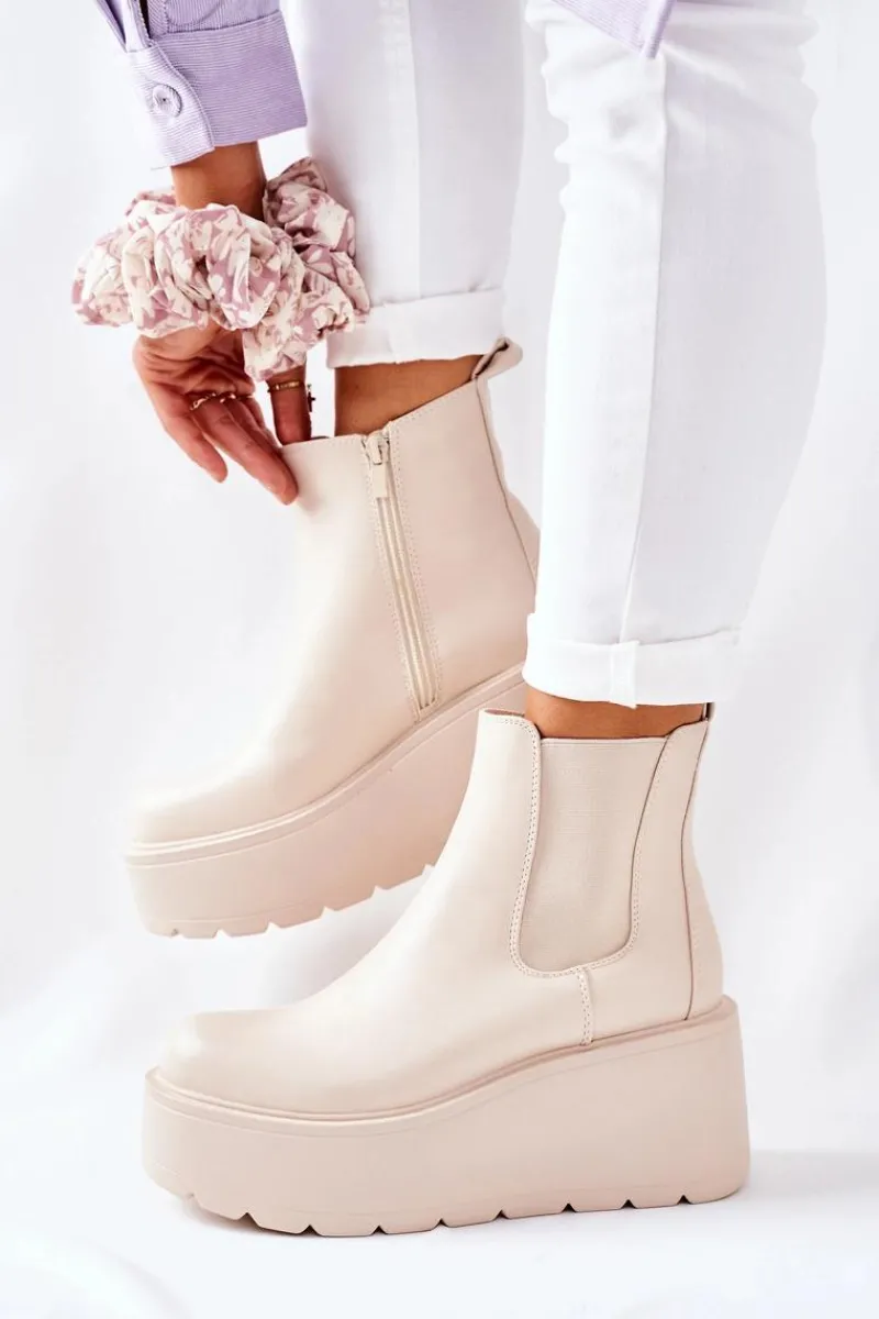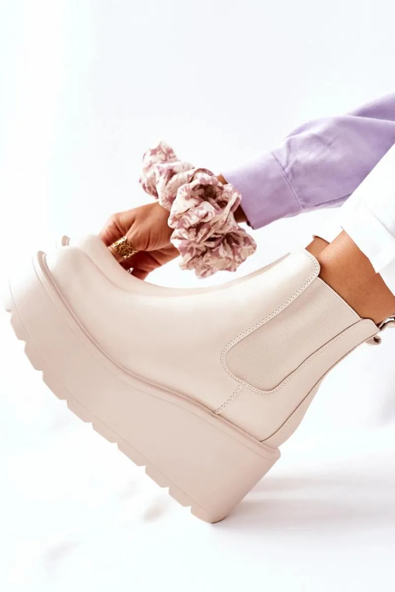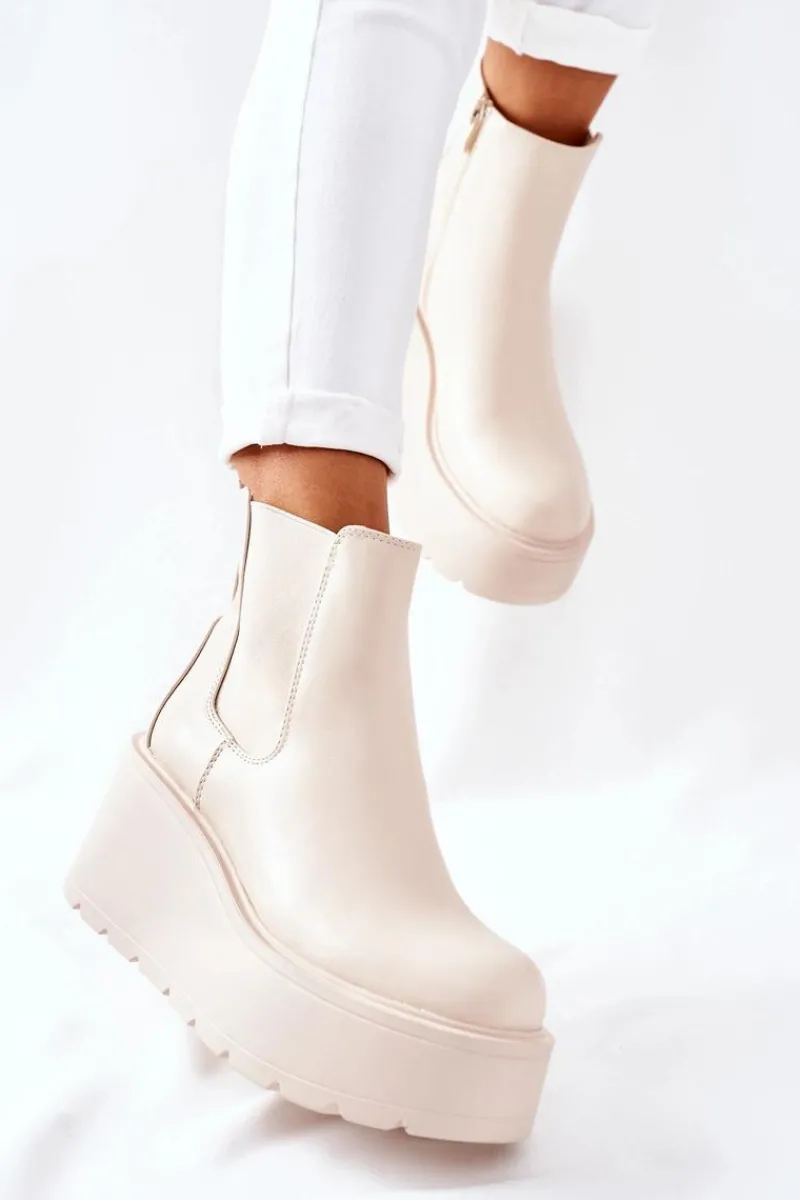 Botki damskie wykonane z eko skóry. Wnętrze botków ocieplone jest miłym w dotyku kocem obuwniczym. Wysoka platforma. Przy wyborze rozmiaru prosimy sugerować się tabelą rozmiarów.