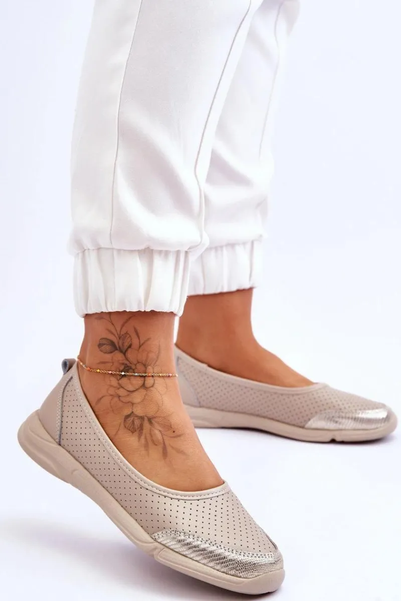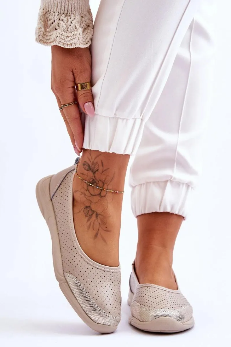 Modne, damskie balerinki idealnie sprawdzą się na wiele okazji. Wykonane z naturalnej skóry w ażurowy wzorek. Posiadają miękką, skórzaną wkładkę, która zapewni komfort podczas użytkowania. Niezwykle lekki model. Taki fason obuwia powinien znaleźć się w każdej garderobie! Niski obcas zapewni stabilność w każdej sytuacji. Przy wyborze rozmiaru prosimy sugerować się tabelą rozmiarów.