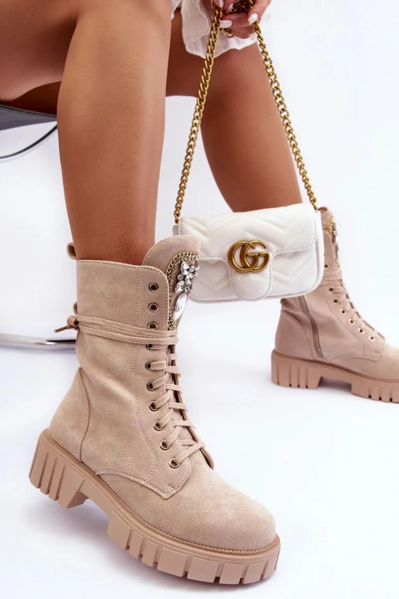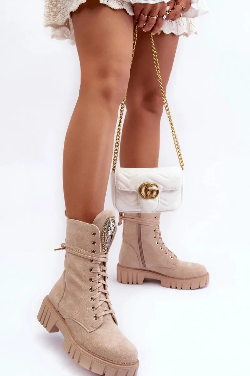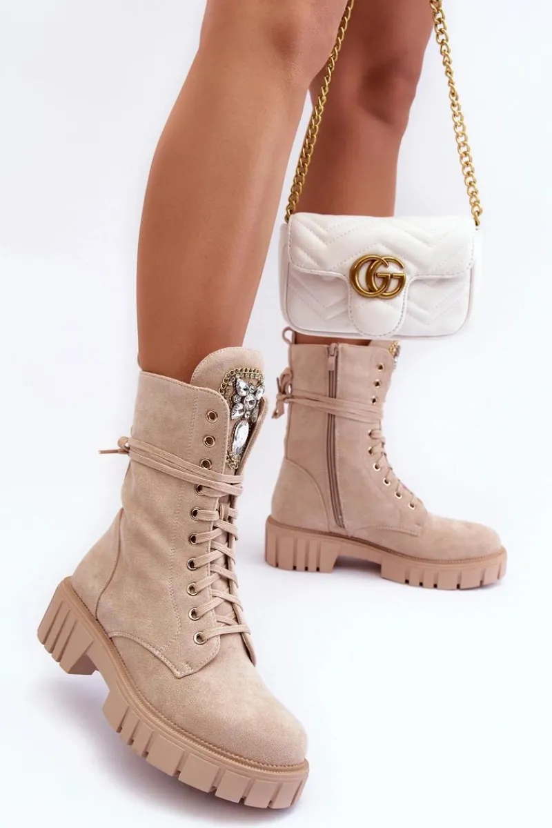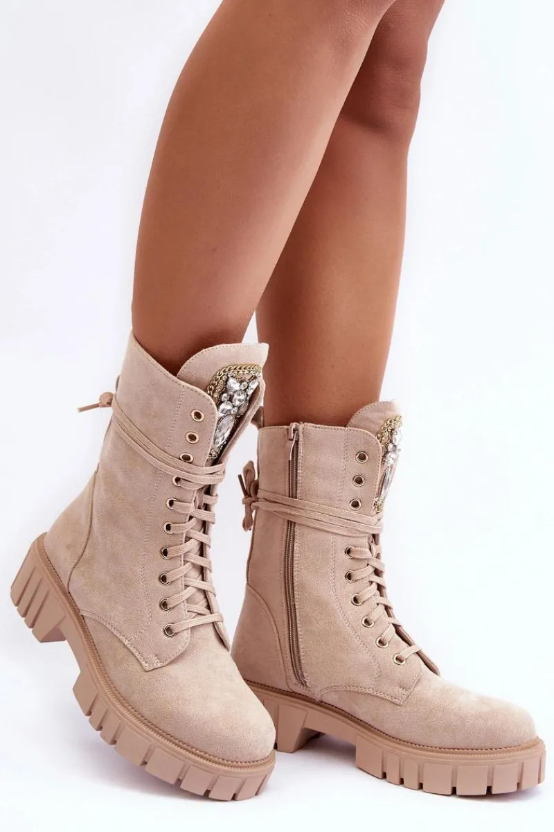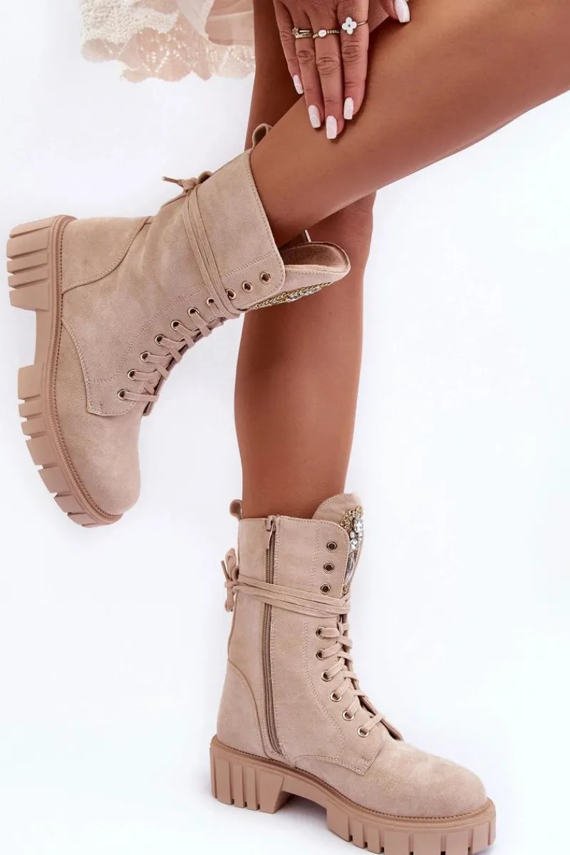 Botki damskie wykonane z eko zamszu i ocieplone kocem obuwniczym. Cholewka za kostkę. Z przodu sznurowanie oraz dodatkowe zapięcie na suwak z boku cholewki. Osadzone na płaskim obcasie i platformie. Na języku biżuteryjna ozdoba. To świetne botki na jesień i zimę! Będą pasować do wielu stylizacji. Przy wyborze rozmiaru prosimy sugerować się tabelą rozmiarów.