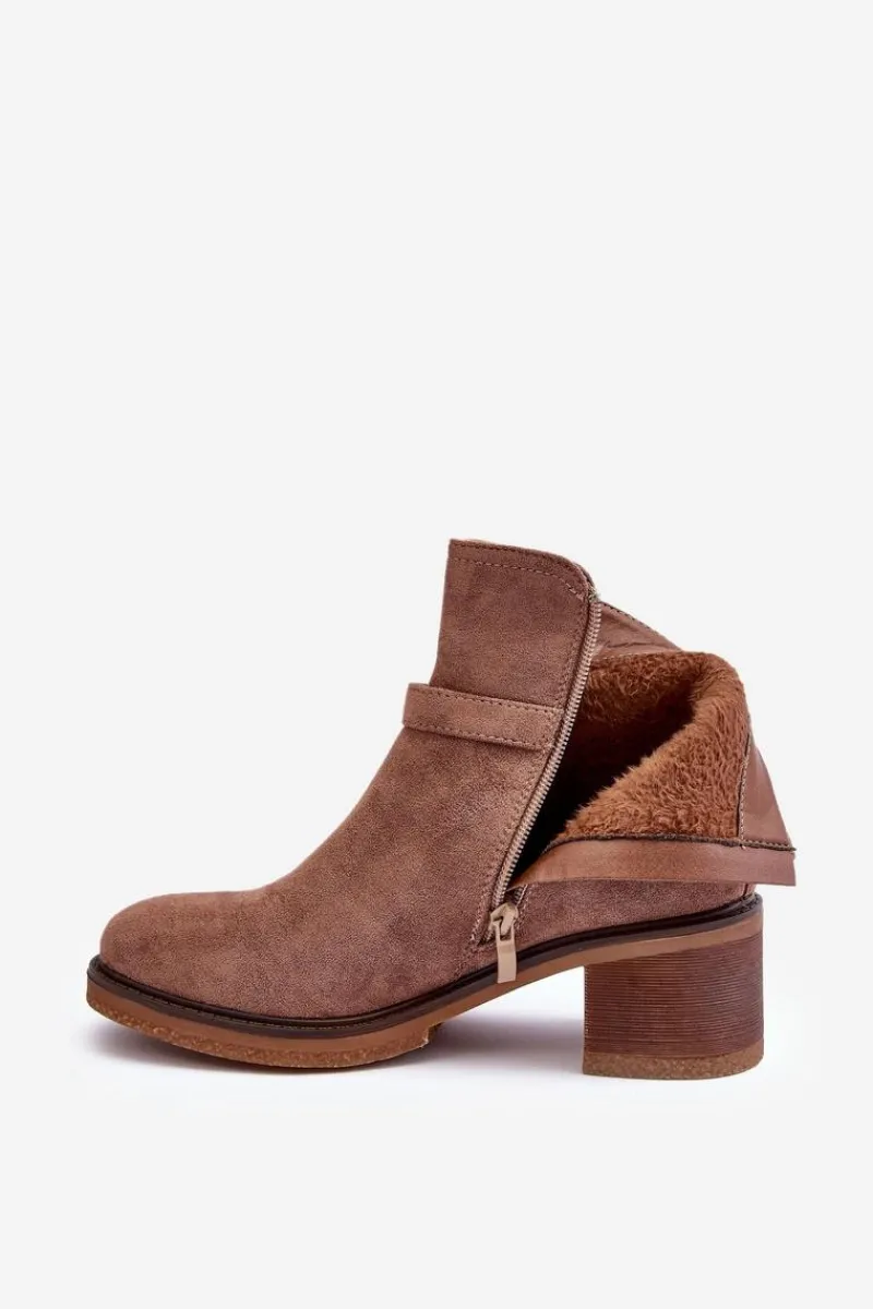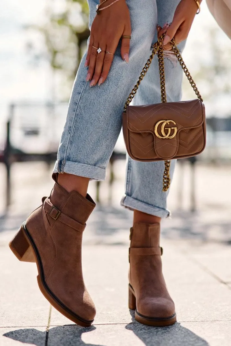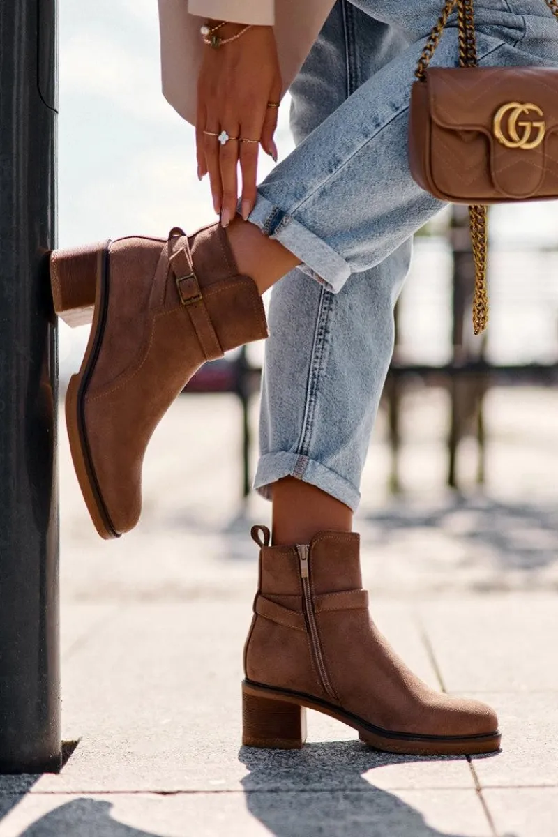 Klasyczne botki wykonane z eko zamszu. Osadzone na obcasie w postaci klocka. Wnętrze ocieplone kocem obuwniczym. Z boku cholewki znajduje się pasek z klamrą. Modny fason sprawia, że możesz założyć je do wielu stylizacji. Nosek zaokrąglony. Buty posiadają także usztywniany zapiętek. W tych botkach jesienne dni nie będą już takie straszne! Przy wyborze rozmiaru prosimy sugerować się tabelą rozmiarów.