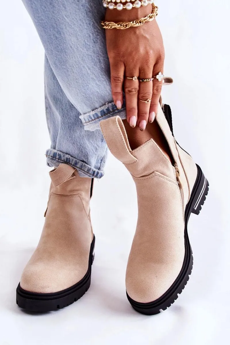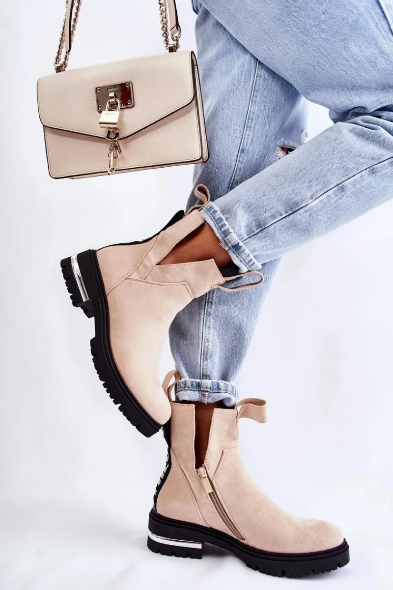 Damskie botki posiadają efektowne wycięcia po bokach cholewki. Z przodu oraz z tyłu posiadają pętelki ułatwiające zakładanie obuwia. Dodatkowo z boku cholewki znajduje się suwak. Botki zostały wykonane z miłego w dotyku eko zamszu. Posiadają usztywniany zapiętek. W środku ocieplone kocem obuwniczym. Osadzone na płaskim obcasie i niewysokiej platformie.Przy wyborze rozmiaru prosimy sugerować się tabelą rozmiarów.
