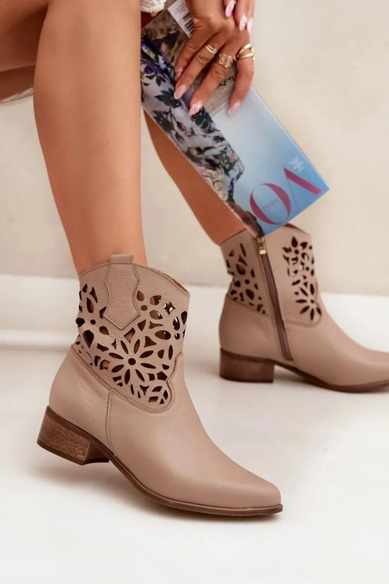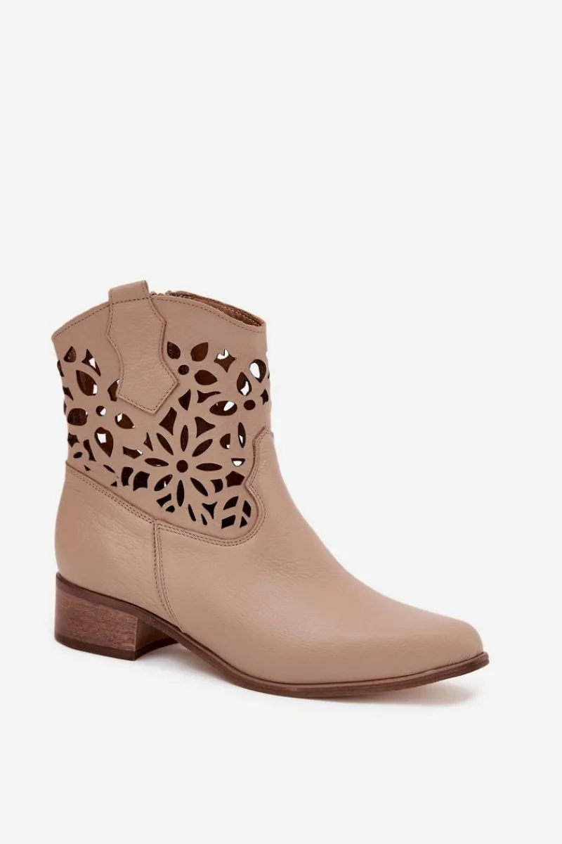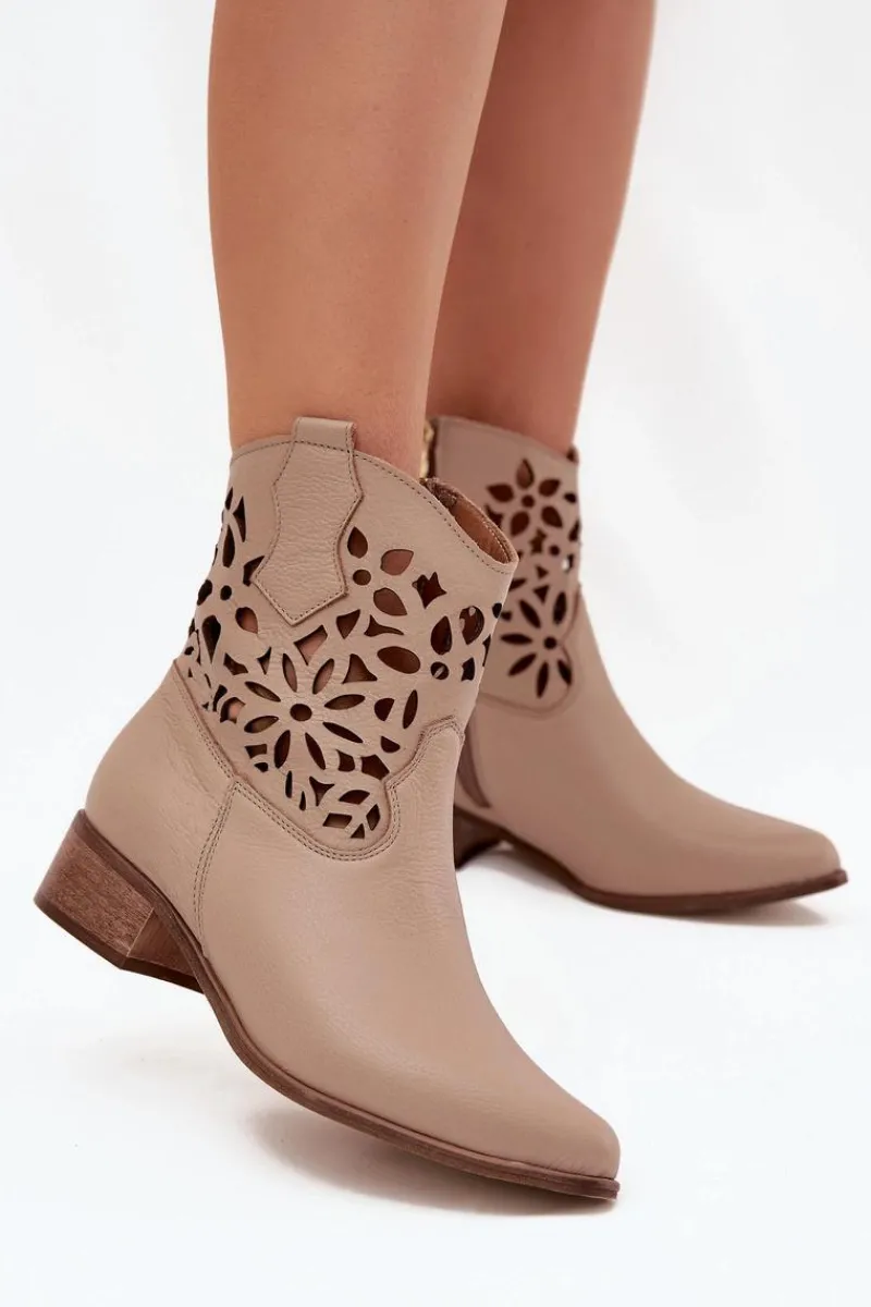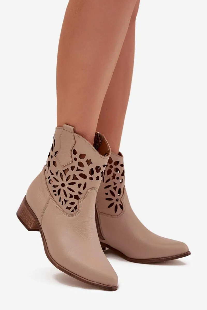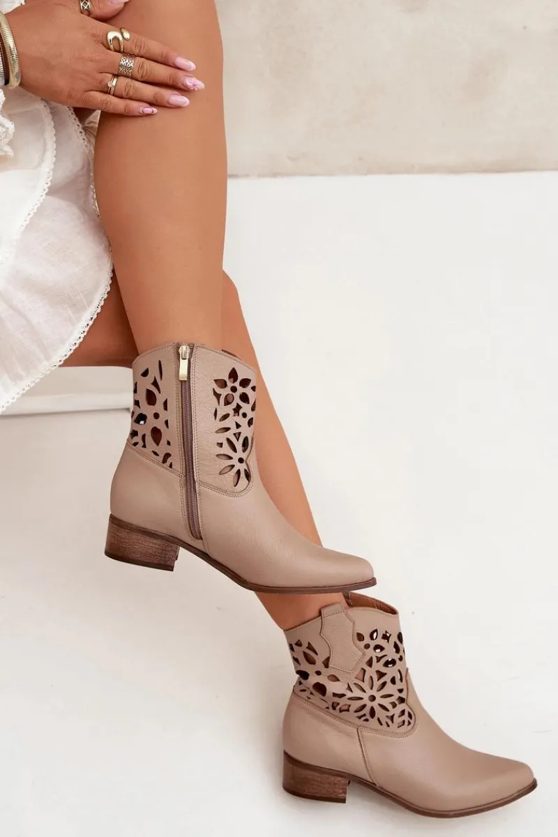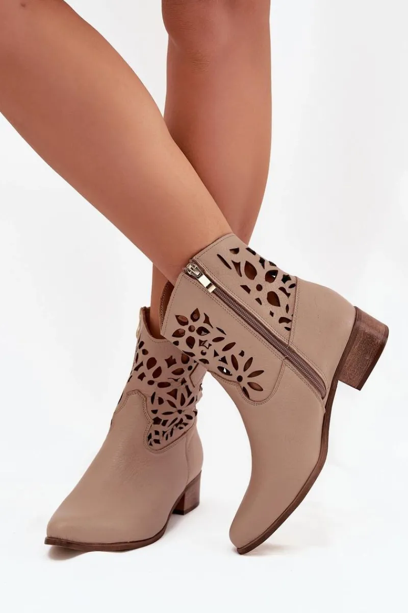 Botki damskie wykonane z naturalnej skóry. Osadzone na niskim obcasie, co sprawia, że są zarówno stylowe, jak i wygodne. Ażurowy wzorek na cholewce dodaje im elegancji. Model ten zapiany jest na zamek, co ułatwia zakładanie obuwia. Miękka wkładka gwarantuje komfort noszenia. Przy wyborze rozmiaru prosimy sugerować się tabelą rozmiarów.