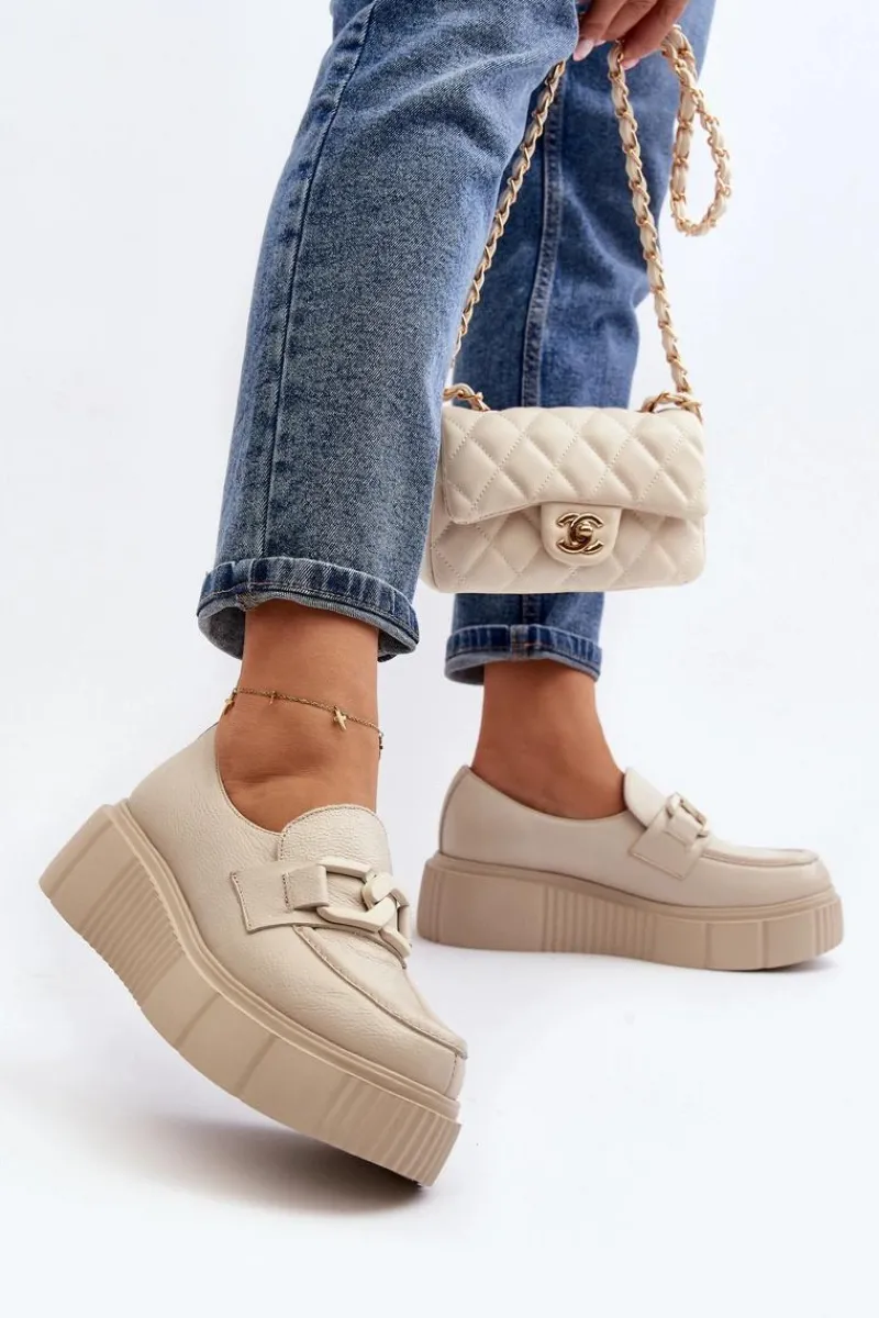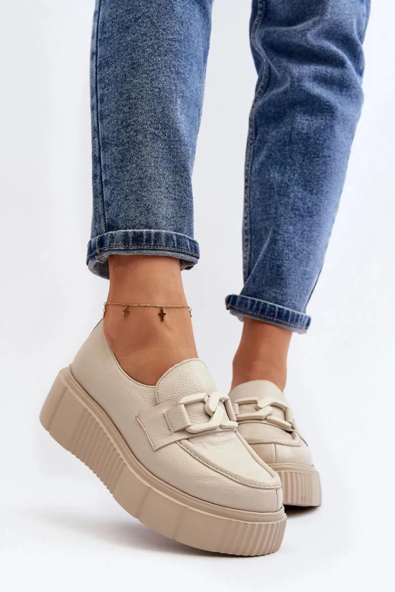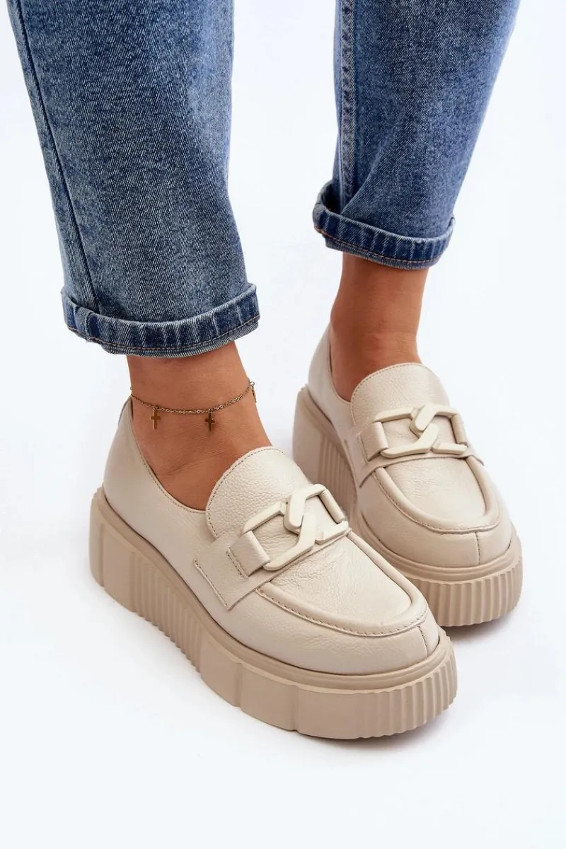 Damskie, wsuwane półbuty zostały wykonane z naturalnej skóry. Posiadają zaokrąglony nosek. Osadzone na masywnej platformie. Na przodzie znajduje się dekoracyjny łańcuch. Pod językiem znajduje się elastyczna gumka, dzięki której but będzie bardziej dopasowany do stopy. Półbuty posiadają usztywniany zapiętek. Modne, wygodne, a także wykonane z dbałością o detale. Władka wykonana z naturalnej skóry zadba o Twój komfort. Przy wyborze rozmiaru prosimy sugerować się tabelą rozmiarów.