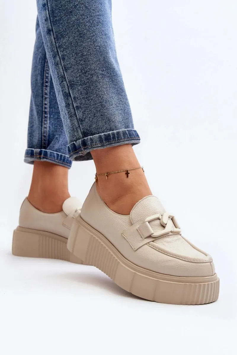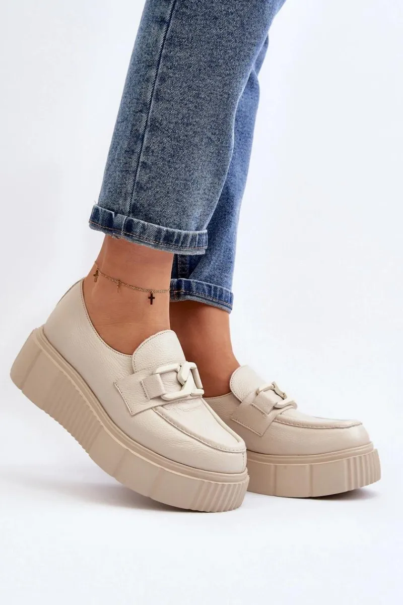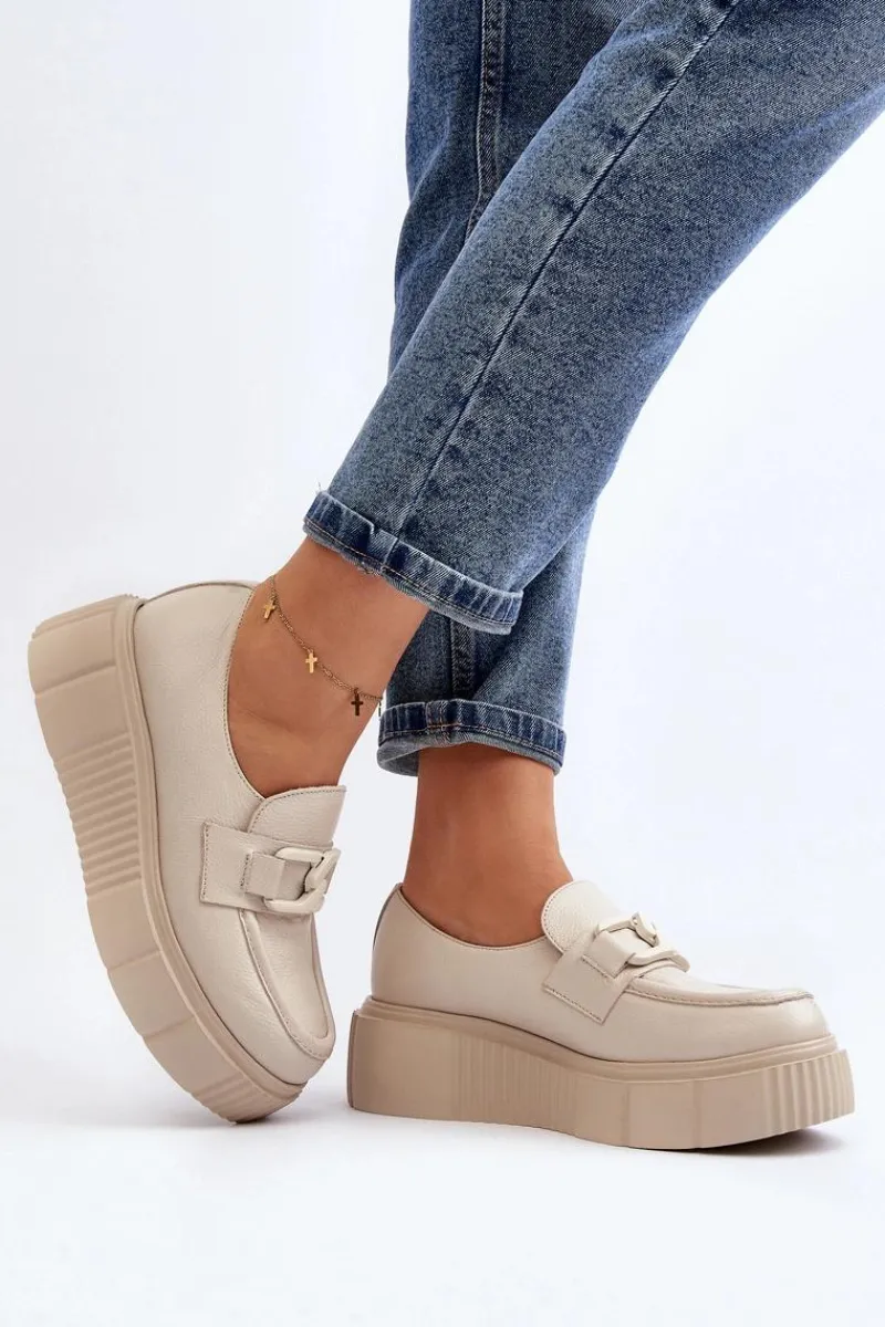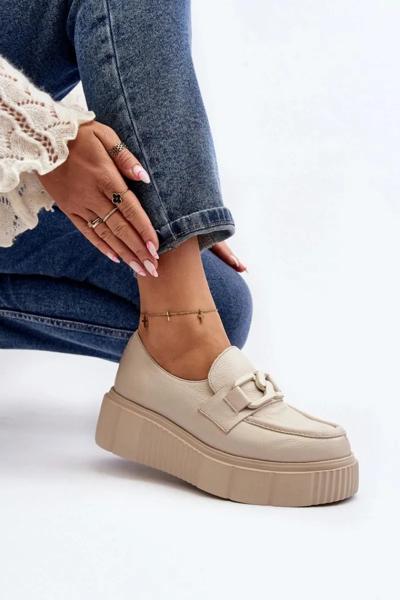 Damskie, wsuwane półbuty zostały wykonane z naturalnej skóry. Posiadają zaokrąglony nosek. Osadzone na masywnej platformie. Na przodzie znajduje się dekoracyjny łańcuch. Pod językiem znajduje się elastyczna gumka, dzięki której but będzie bardziej dopasowany do stopy. Półbuty posiadają usztywniany zapiętek. Modne, wygodne, a także wykonane z dbałością o detale. Władka wykonana z naturalnej skóry zadba o Twój komfort. Przy wyborze rozmiaru prosimy sugerować się tabelą rozmiarów.