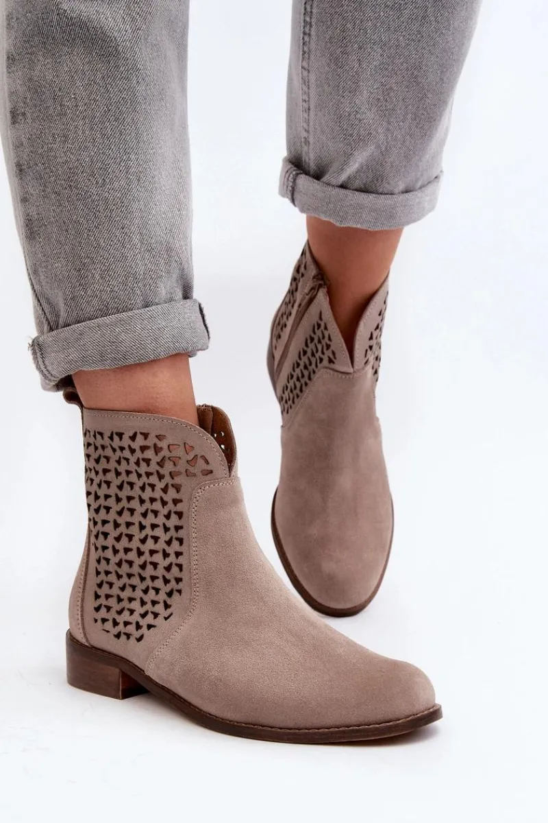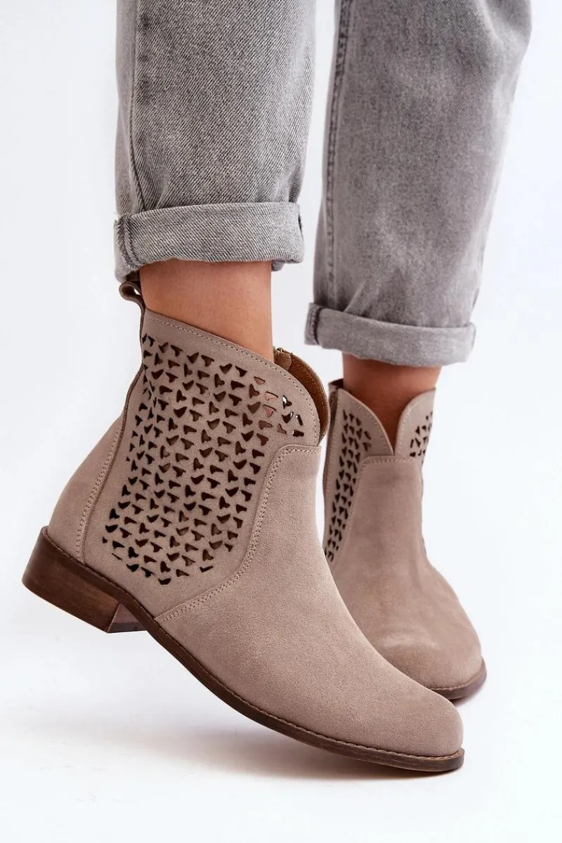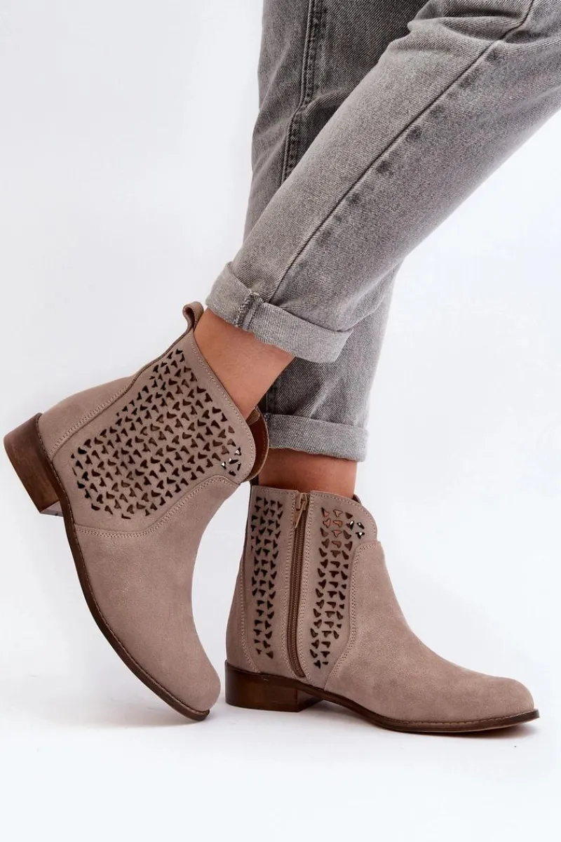 Botki zostały wykonane z naturalnego zamszu. Zakładanie ułatwi wszyty na boku suwak. Botki posiadają ażurowy wzorek. Posiadają płaski obcas oraz wygodną, wykonaną z naturalnej skóry wkładkę. Ten niezwykle komfortowy model powinien znaleźć się w Twojej szafie! Przy wyborze rozmiaru prosimy sugerować się tabelą rozmiarów.