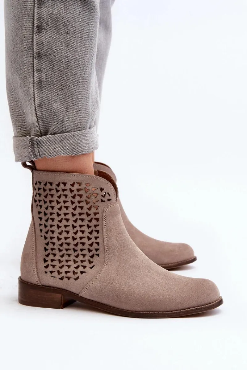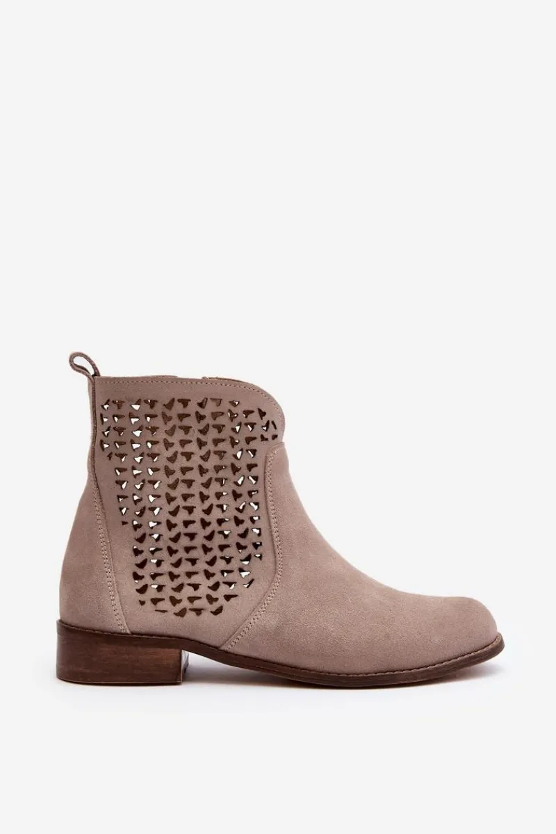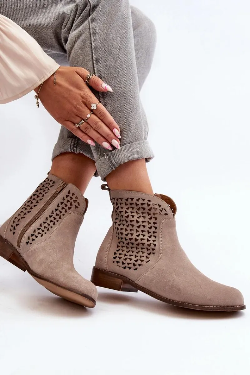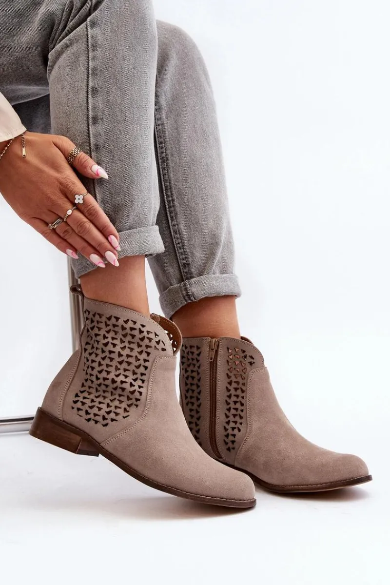 Botki zostały wykonane z naturalnego zamszu. Zakładanie ułatwi wszyty na boku suwak. Botki posiadają ażurowy wzorek. Posiadają płaski obcas oraz wygodną, wykonaną z naturalnej skóry wkładkę. Ten niezwykle komfortowy model powinien znaleźć się w Twojej szafie! Przy wyborze rozmiaru prosimy sugerować się tabelą rozmiarów.