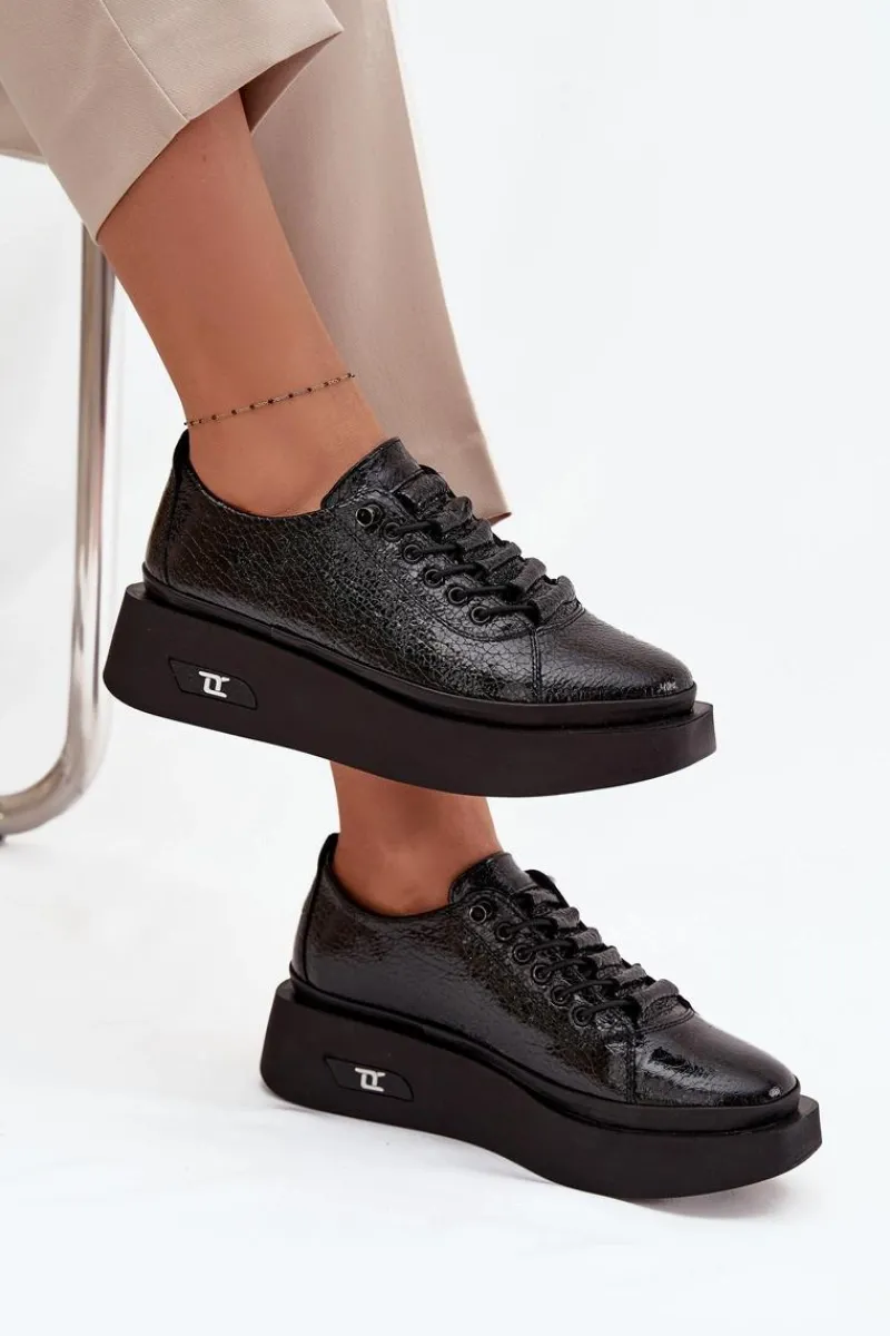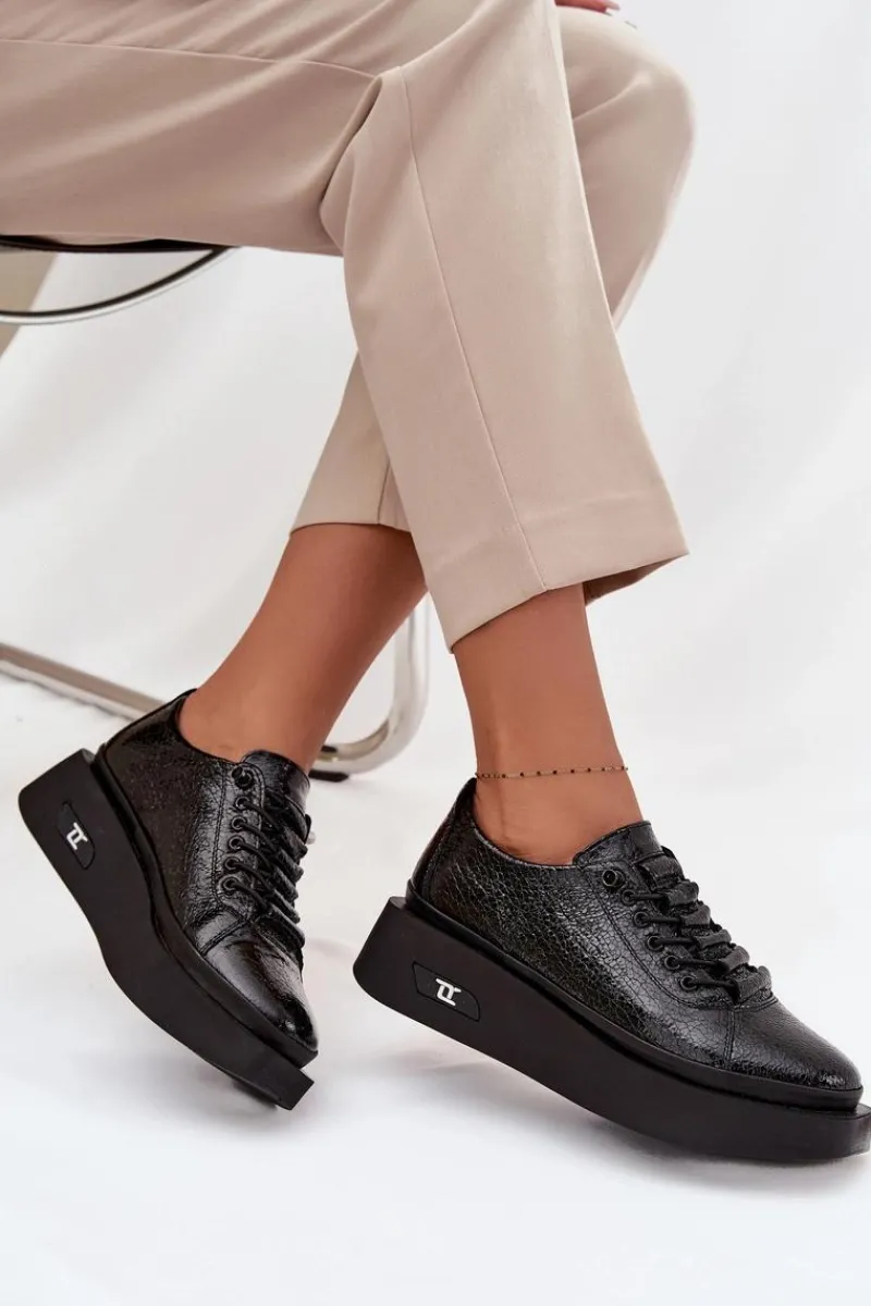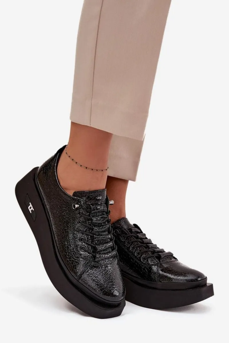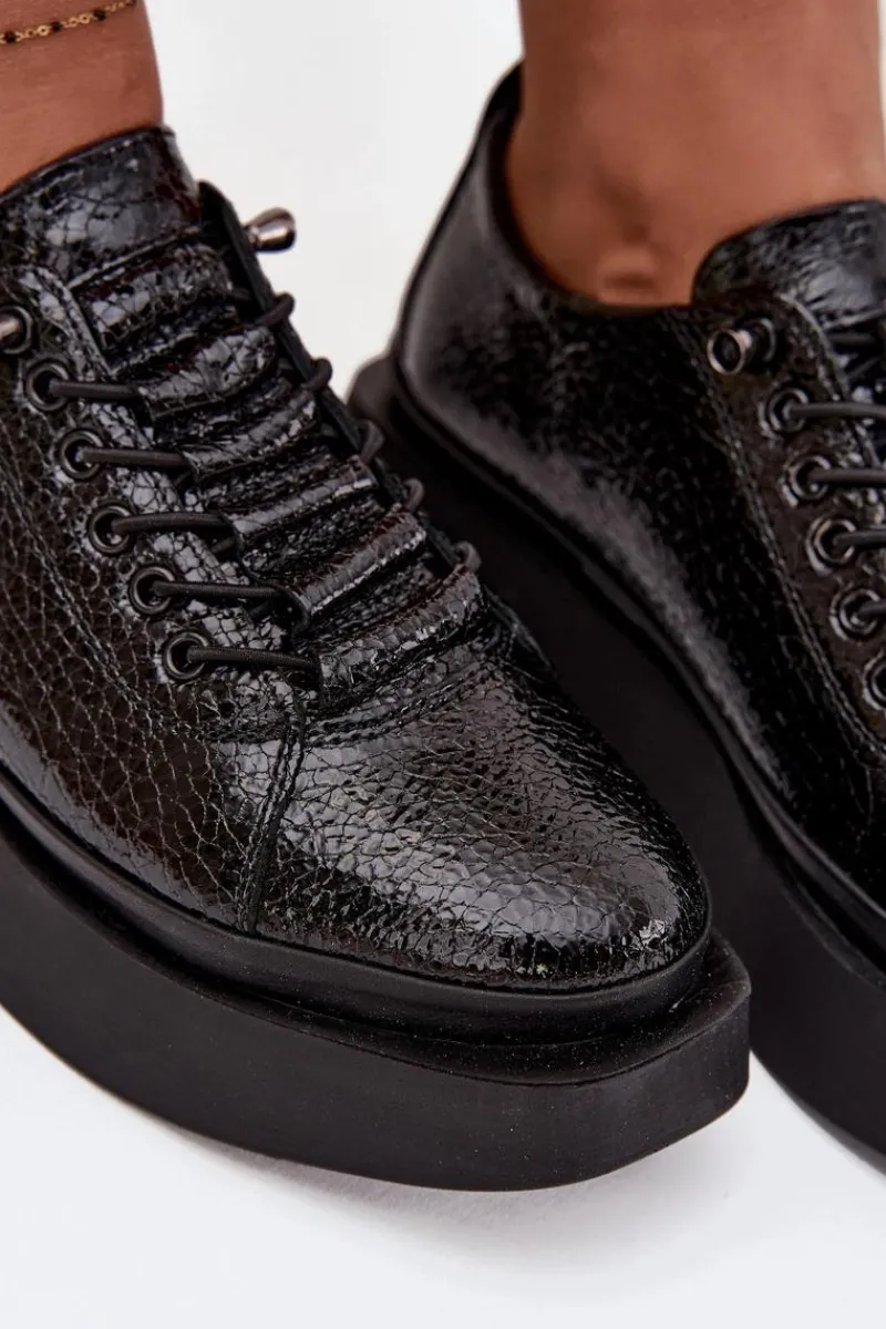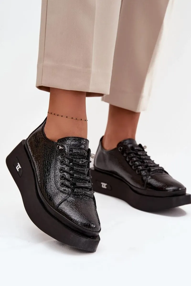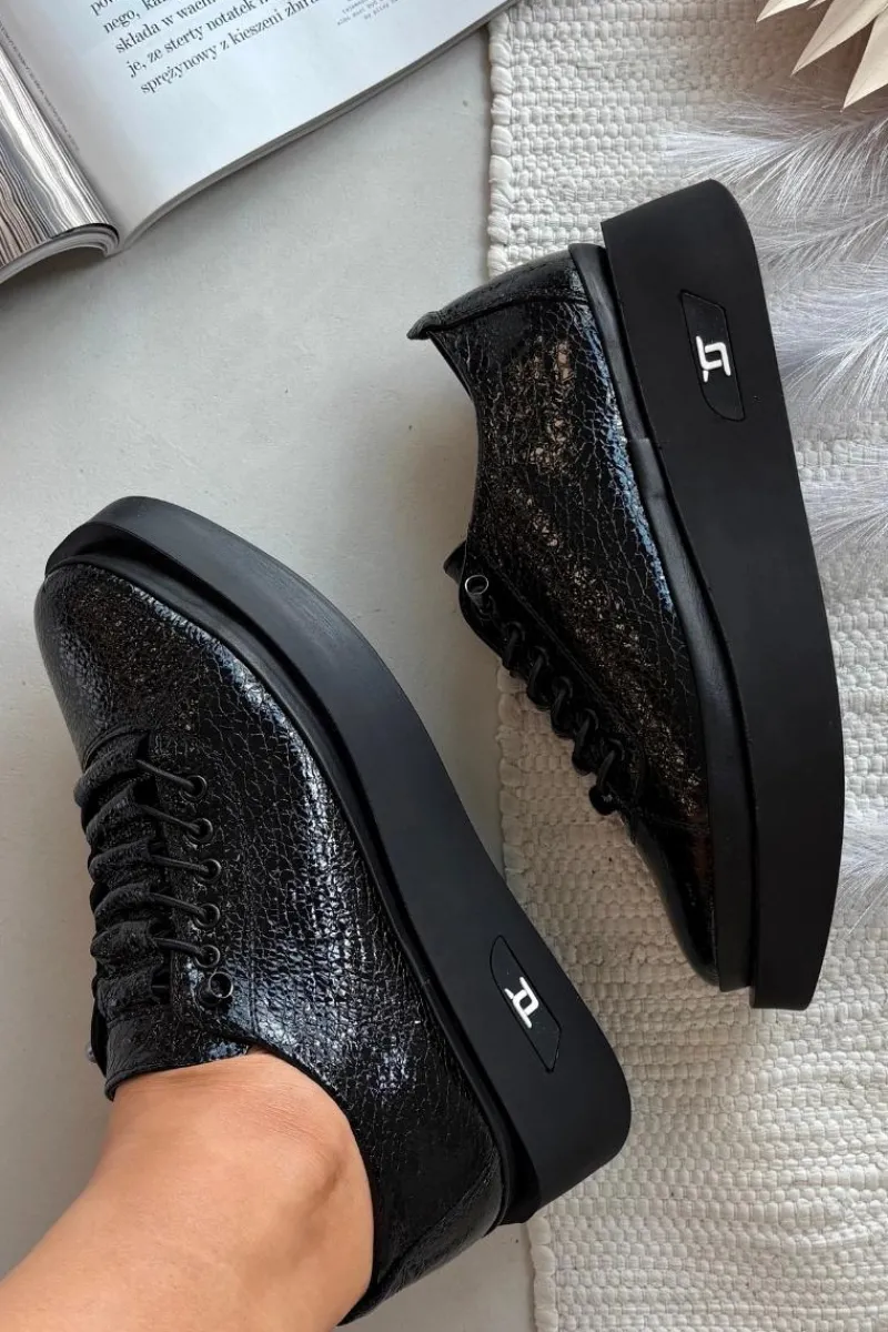 Półbuty damskie marki Artiker wykonane z lakierowanej skóry naturalnej to propozycja, która łączy elegancję z codzienną wygodą. Błyszczące wykończenie nadaje im stylowego charakteru, a solidna platforma zapewnia komfort noszenia oraz nowoczesny wygląd. Zamiast tradycyjnych sznurowadeł, model posiada elastyczne gumki imitujące sznurowanie, dzięki czemu buty zyskują oryginalny wygląd i są wyjątkowo praktyczne – łatwo się je zakłada i zdejmuję. To półbuty, które doskonale sprawdzą się w miejskich stylizacjach, łącząc elegancję z nutą sportowego luzu. Przy wyborze rozmiaru prosimy sugerować się tabelą rozmiarów.