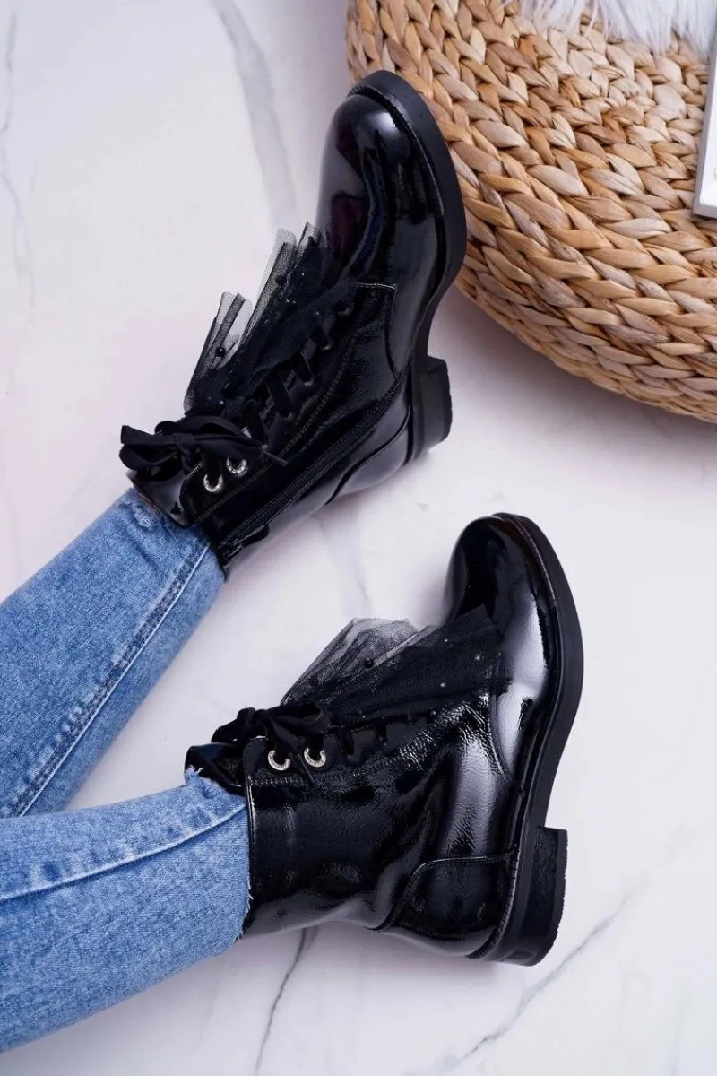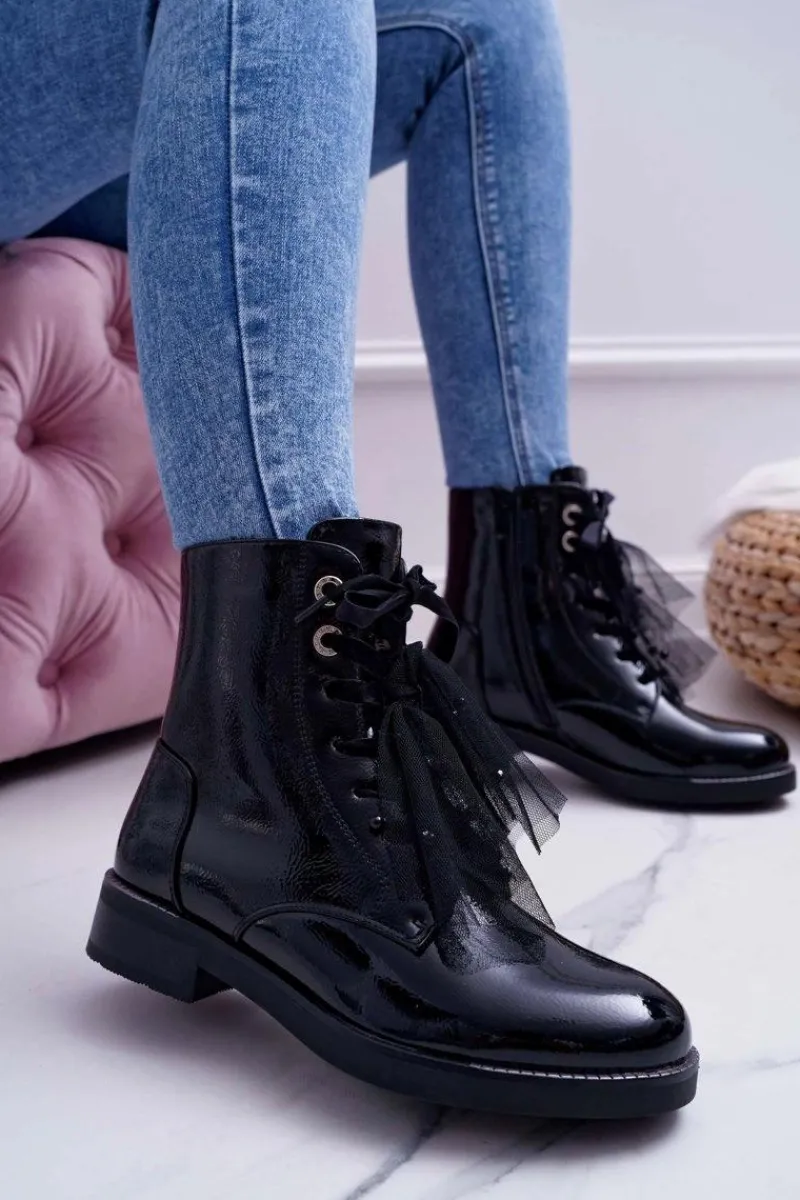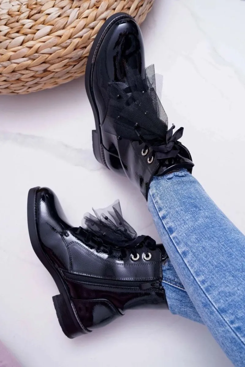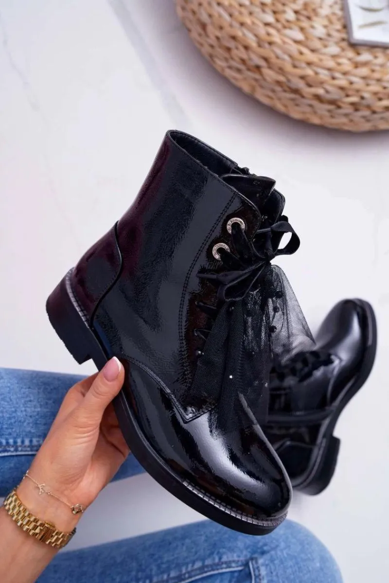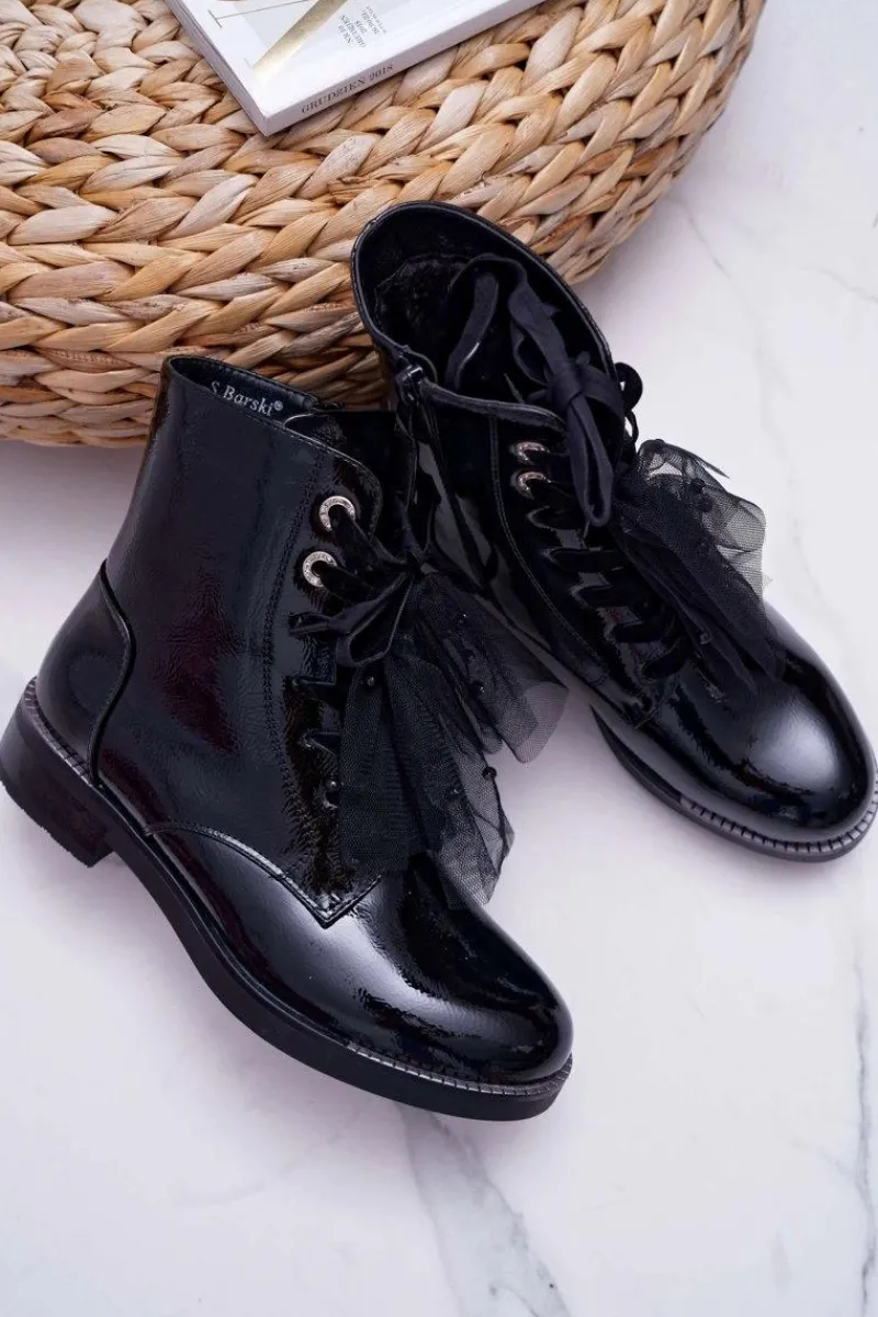 Sale Botki Damskie Lakierowane Płaskie Czarne Barski 39-2 Damskie Botki Sznurowane|Botki Zimowe Damskie